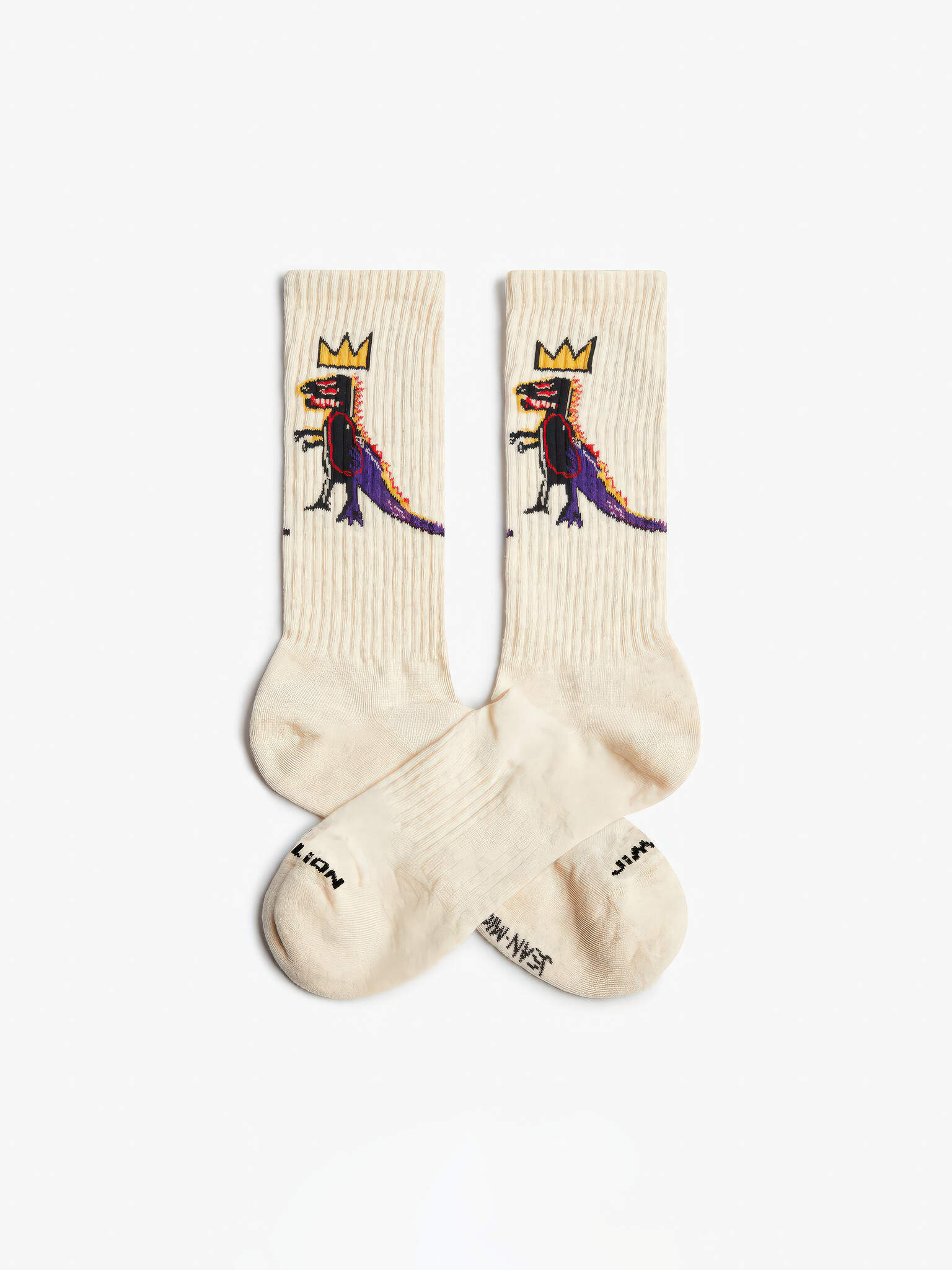 Athletic mid-calf socks in beige with a design based on Jean-Michel Basquiat's iconic Pez Dispenser artwork, featuring a dinosaur with a three-pointed crown.
