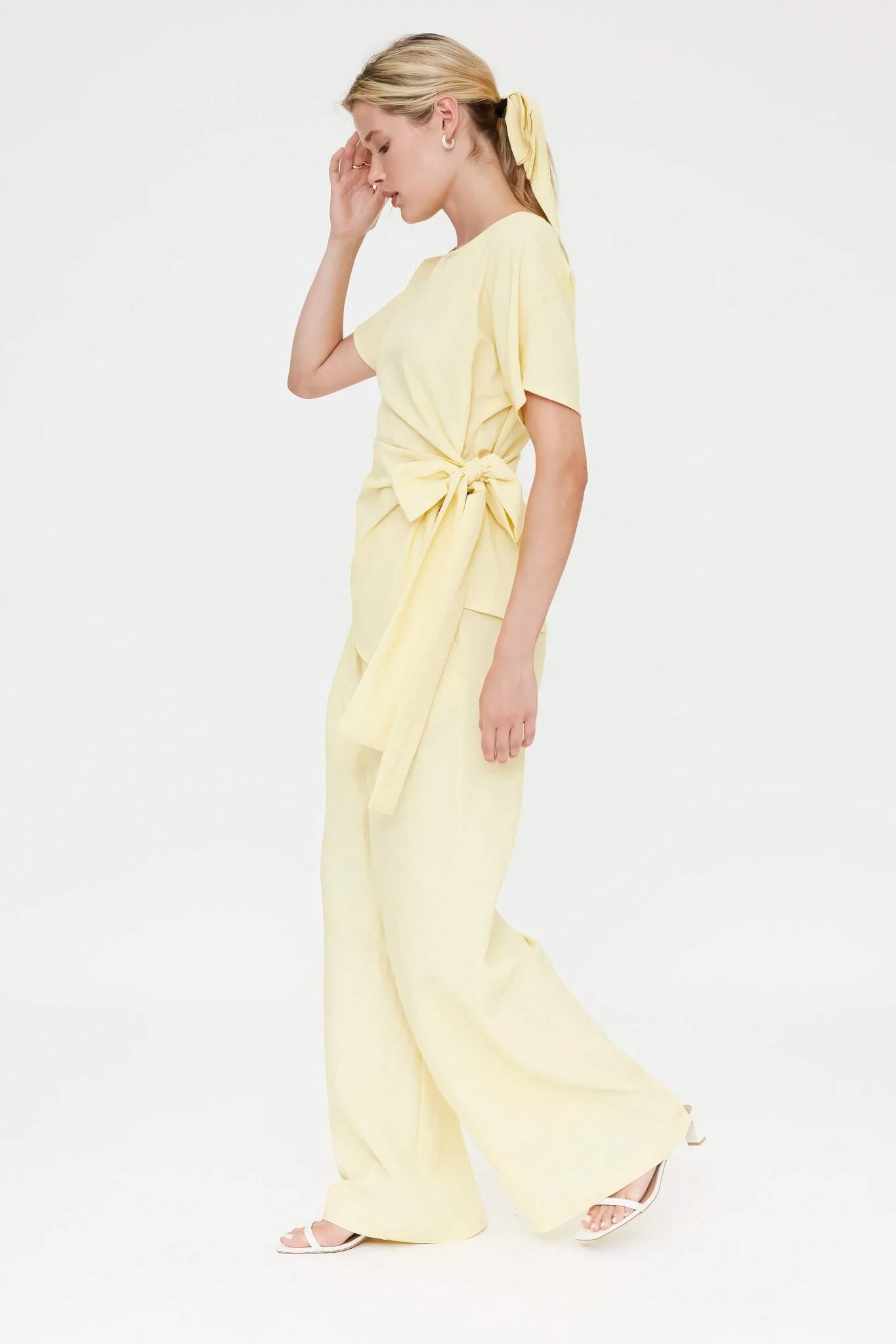 Light yellow flowy crepe trousers with a fixed mid-rise waistband, straight leg and front zip fastening with concealed darts.