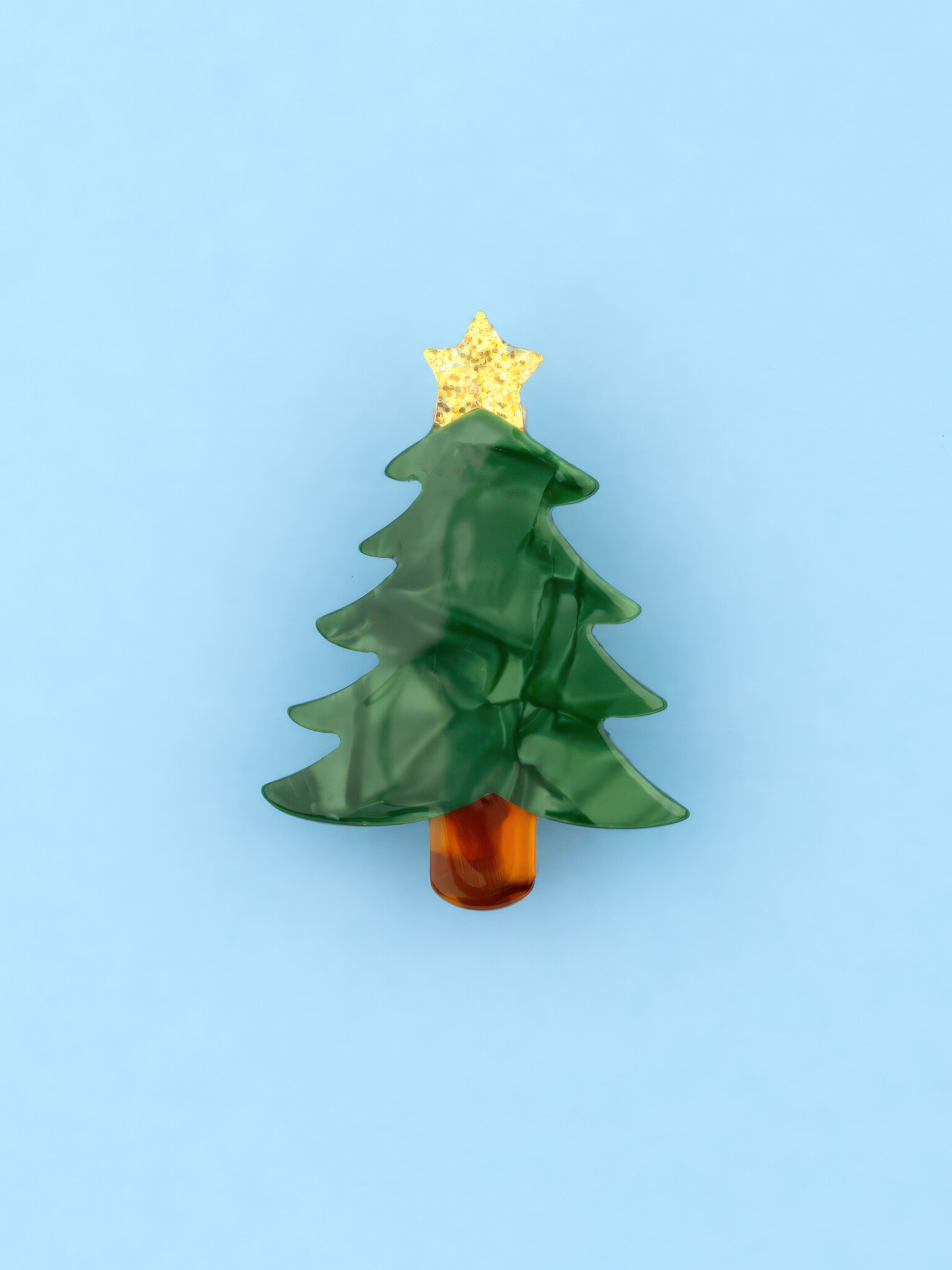 Christmas tree–shaped hair clip with a glittery star, made from acetate and set on a metal alligator clip.