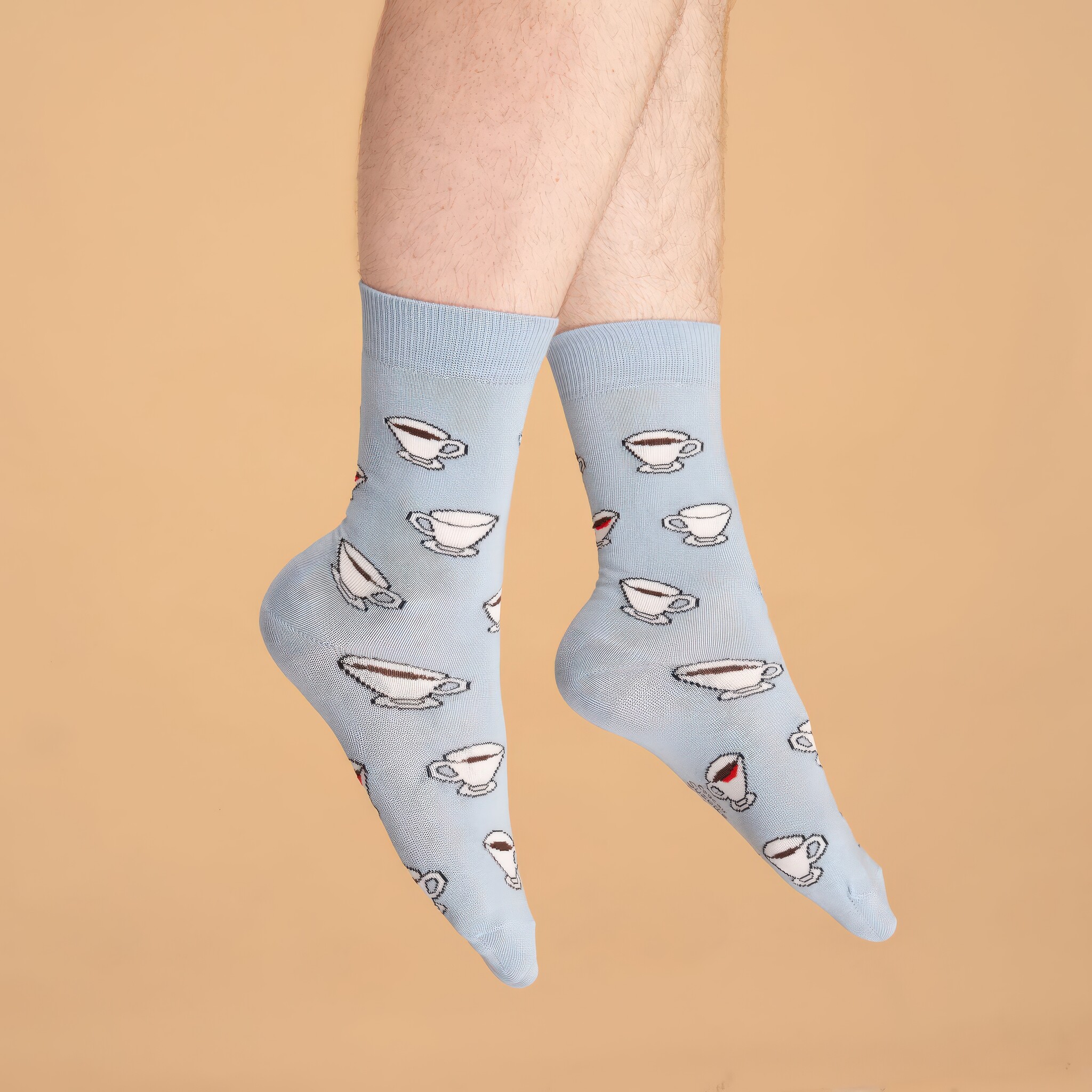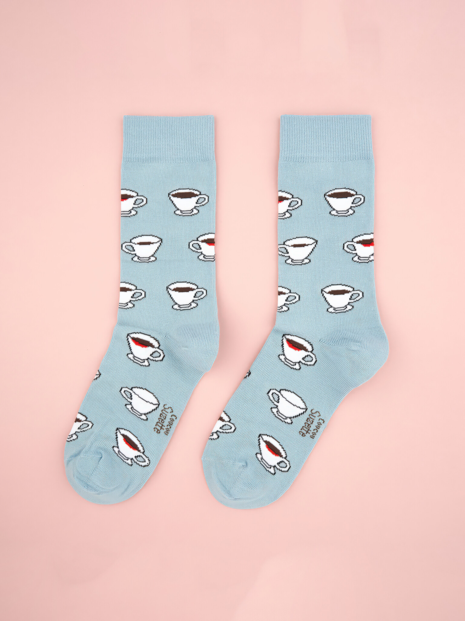 The Coffee Socks feature a coffee cup pattern and are made from OEKO-TEX®️ certified cotton, polyamide, and elastane. They are one-size (EU: 35-44).