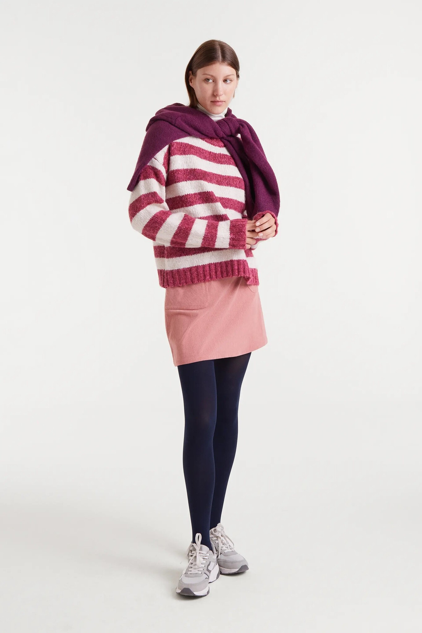 Knitted sweater with white and fuchsia stripes, V-neck, and long sleeves with slightly dropped shoulders.