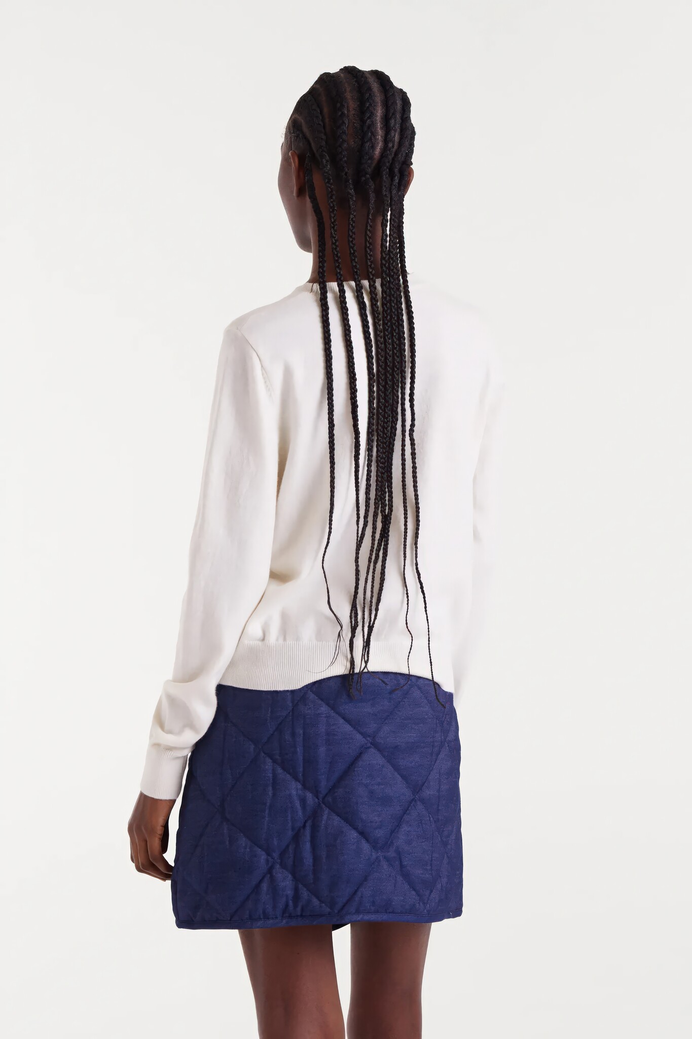 White knitted cardigan with round neck, long sleeves, and multicolored heart-shaped front buttons.