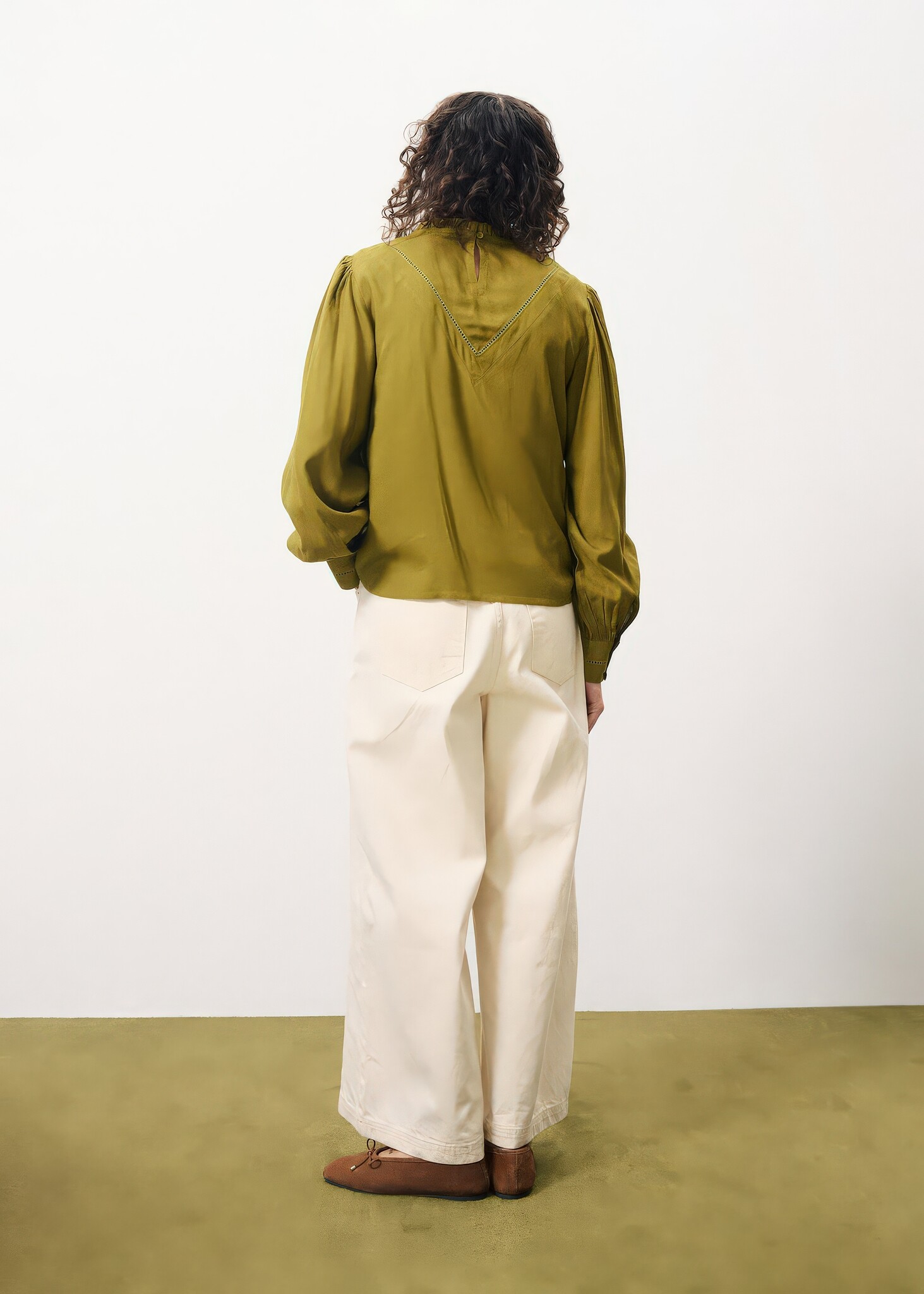 The Lisenn blouse in green features long balloon sleeves and tonal openwork embroidery at the front. It also has a small ruffled collar.