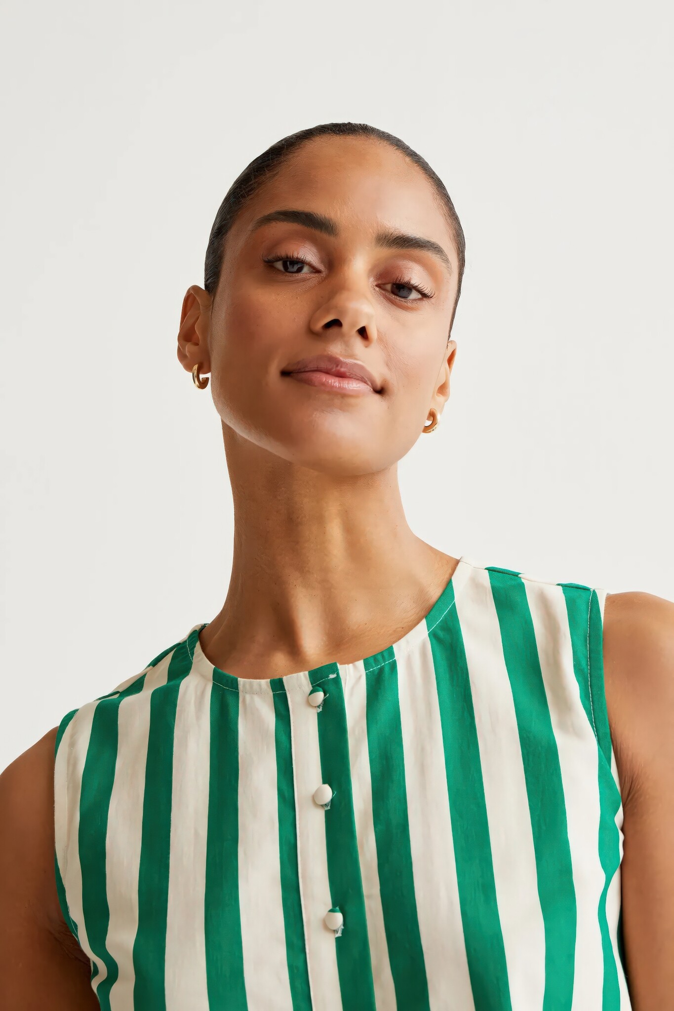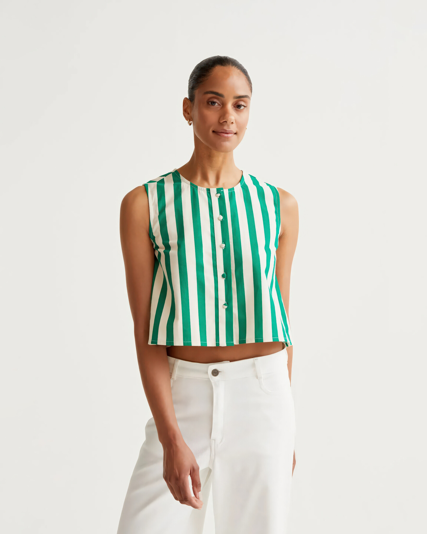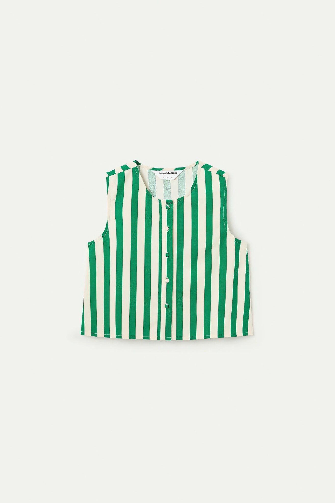 Sleeveless top with bamboo green print and round neckline. Features a front button closure with covered buttons. Made from cotton.