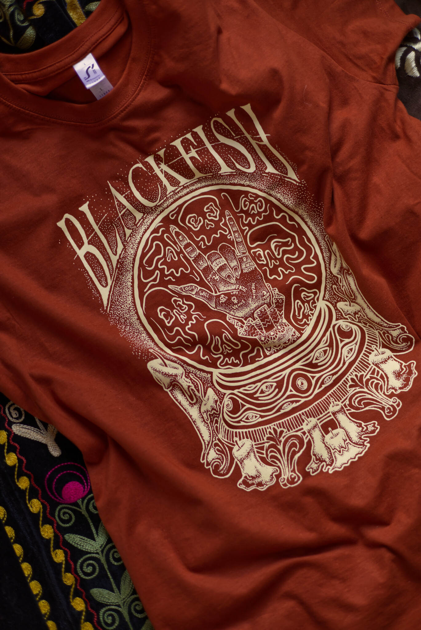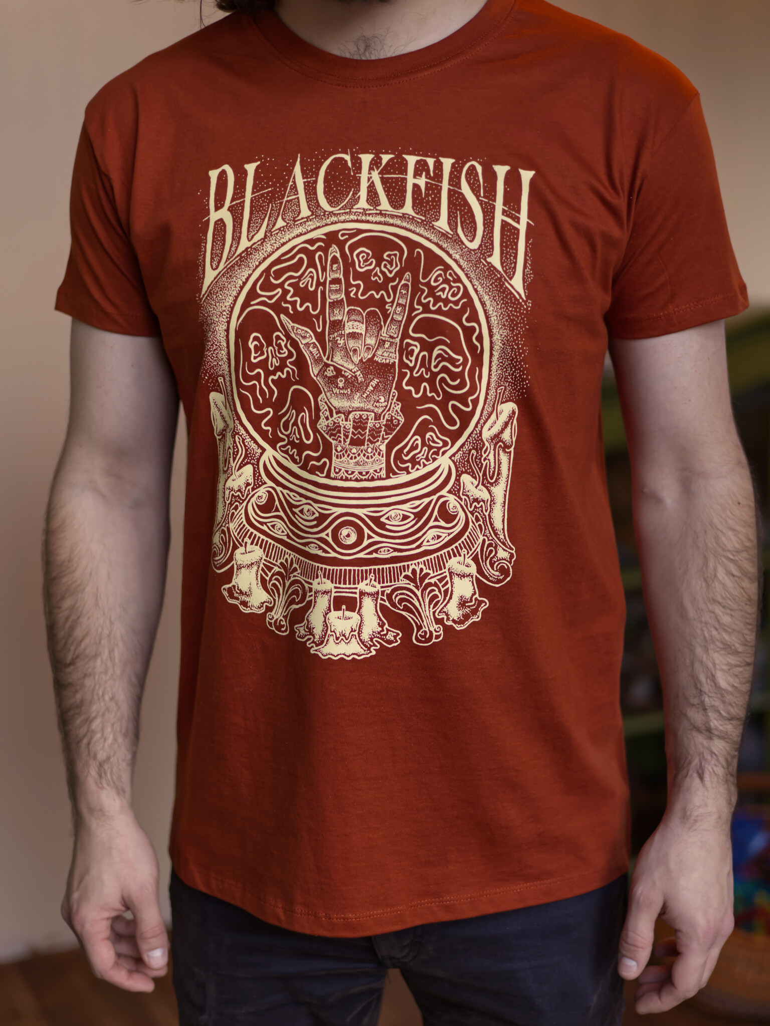 This unisex t-shirt is made from heavy weight cotton of 190 g per m² and comes in a warm vintage terracotta shade. The exclusive BLACKFISH design features a metal palmistry hand inside a glass ball. The cream coloured print is screen printed for a high quality finish.