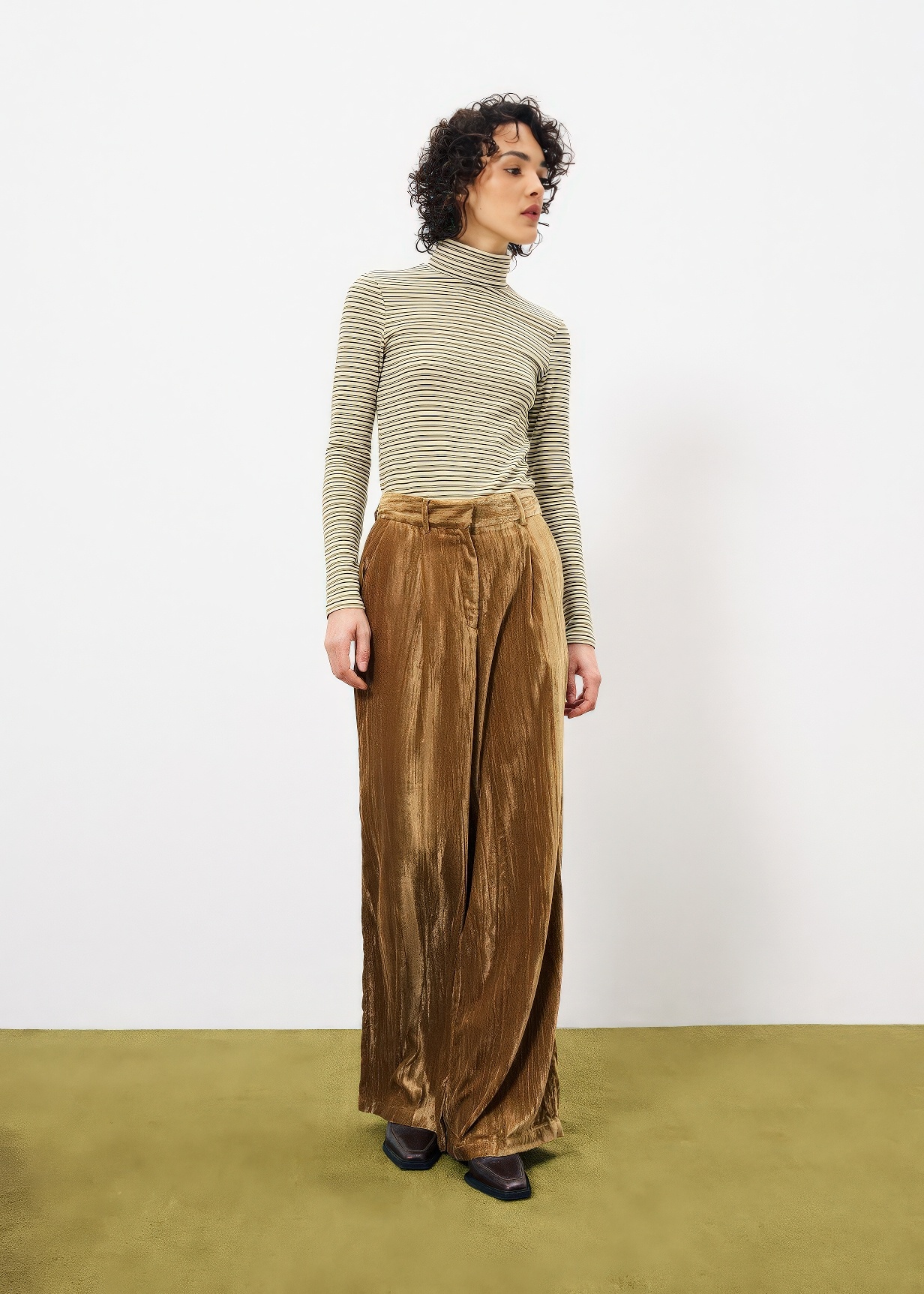 The PHILO Beige Pants are wide-leg trousers with front pleats, made from soft, textured velvet