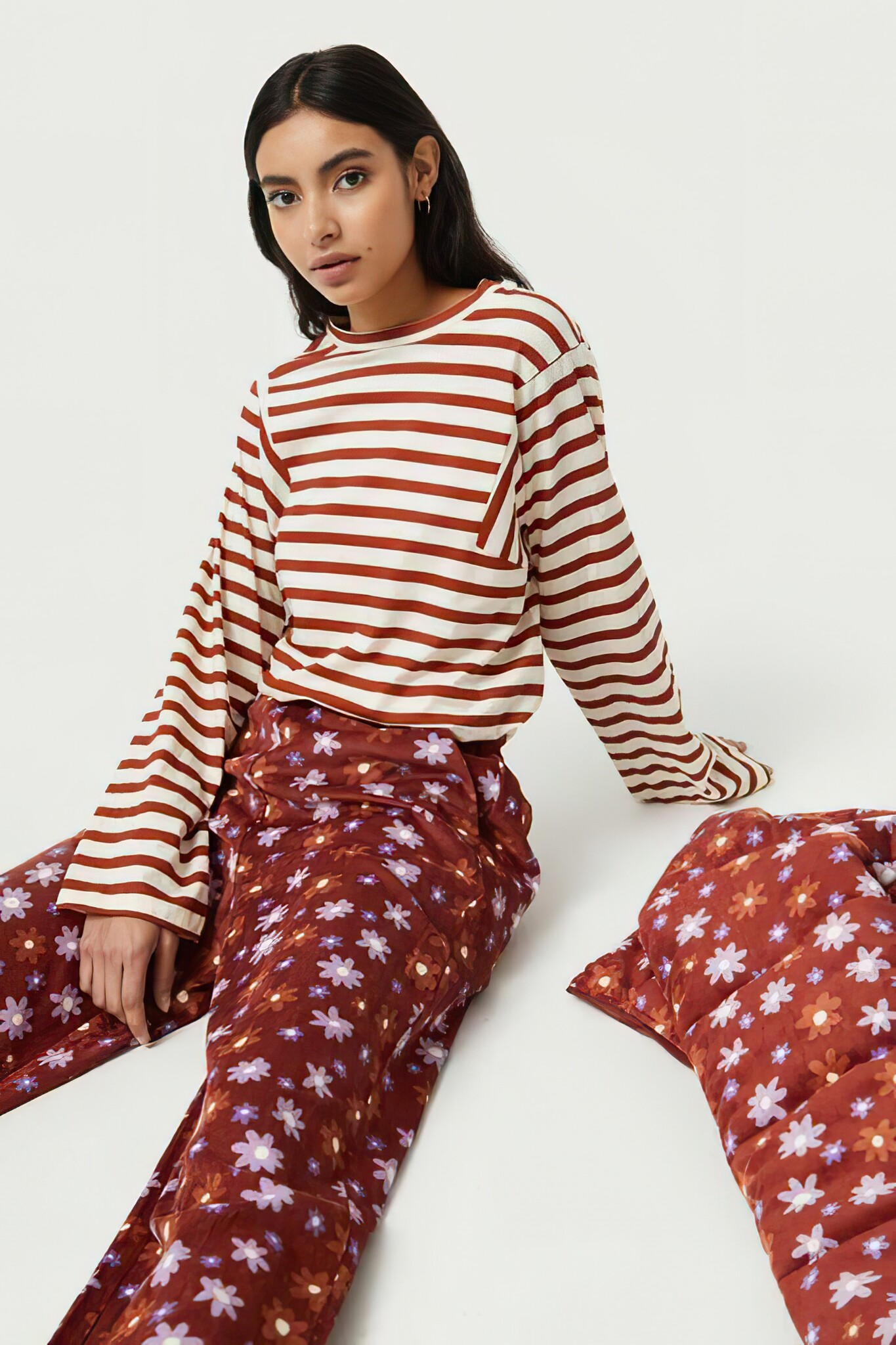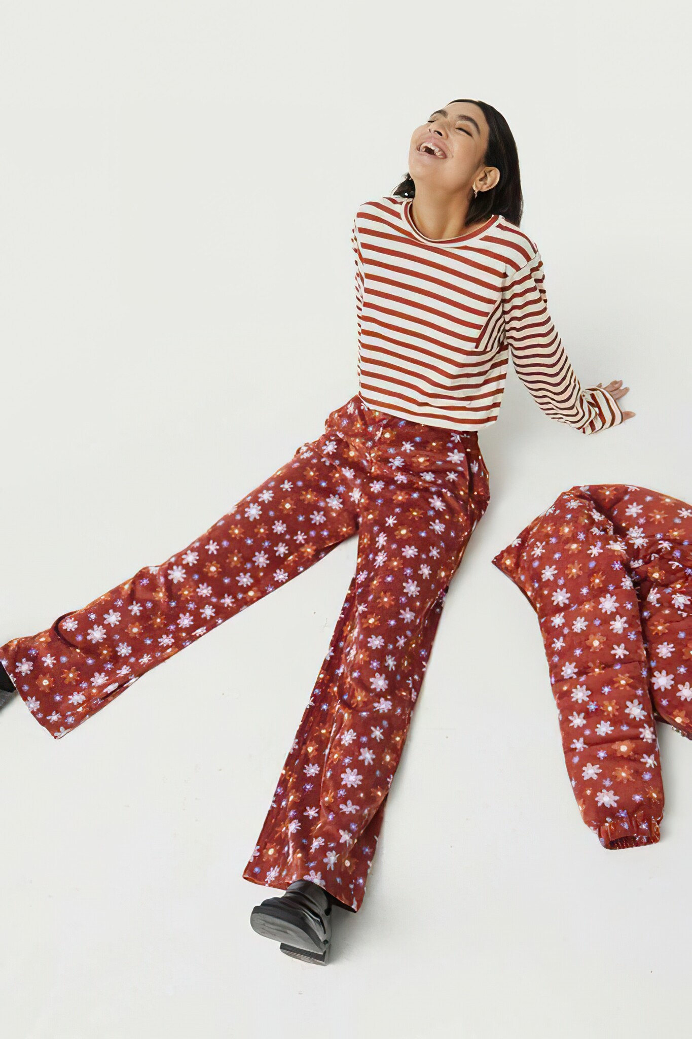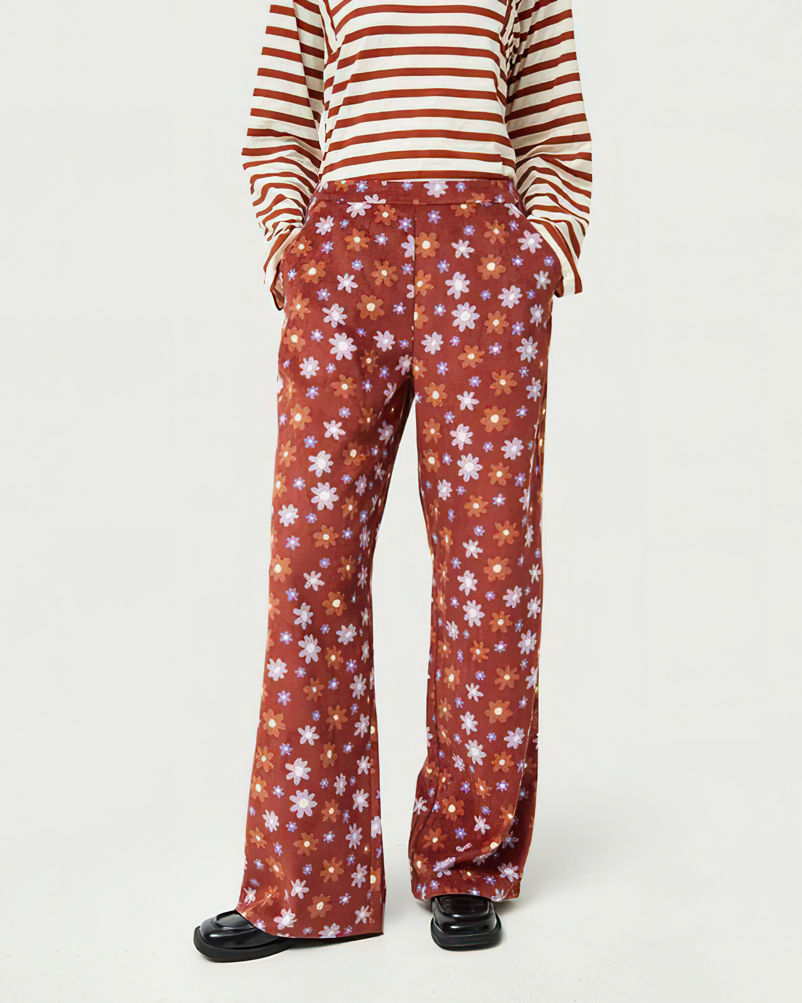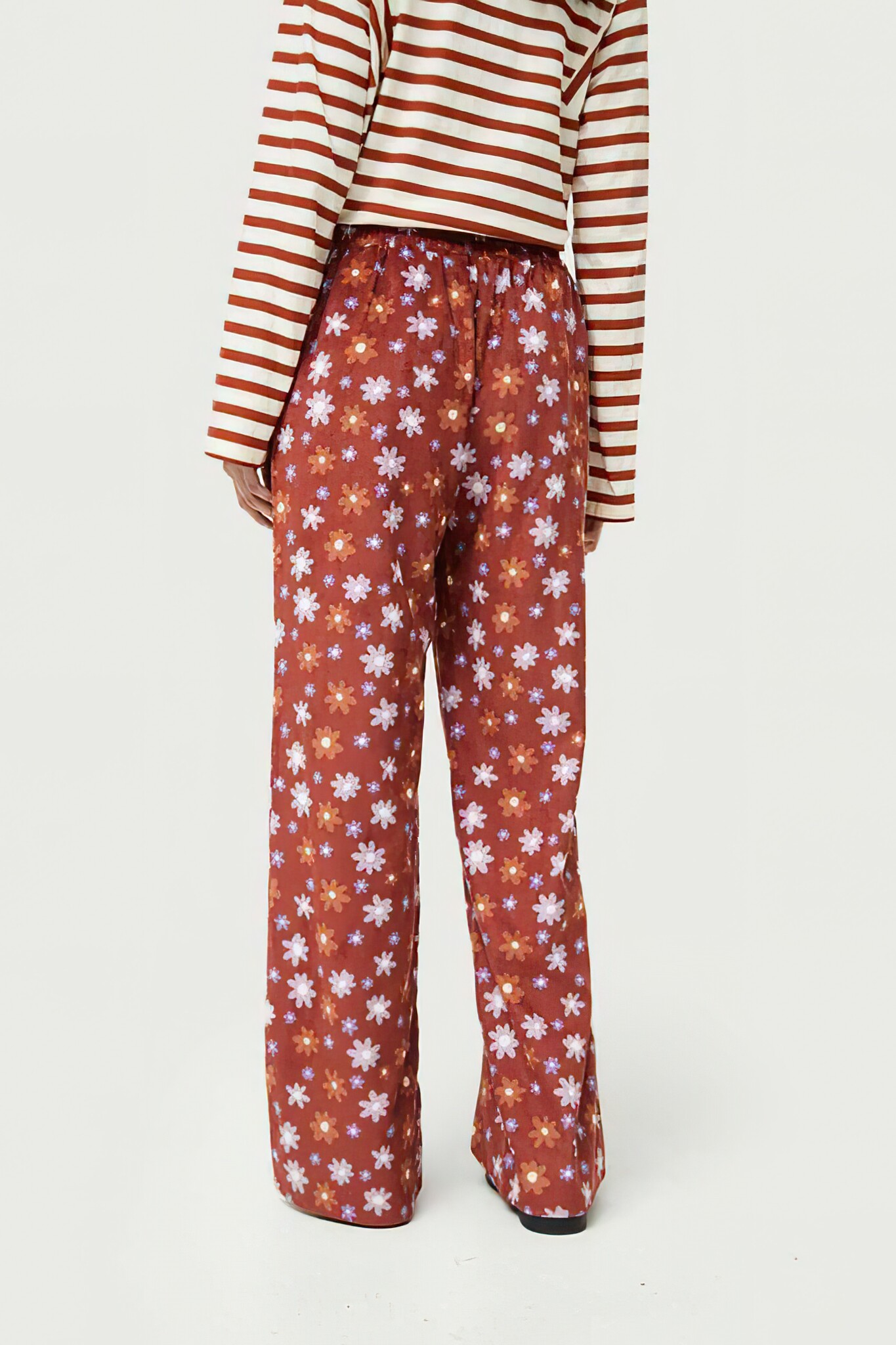 Corduroy trousers with brown and lilac floral print. With a mid-high elastic waist and straight legs. Side pockets.