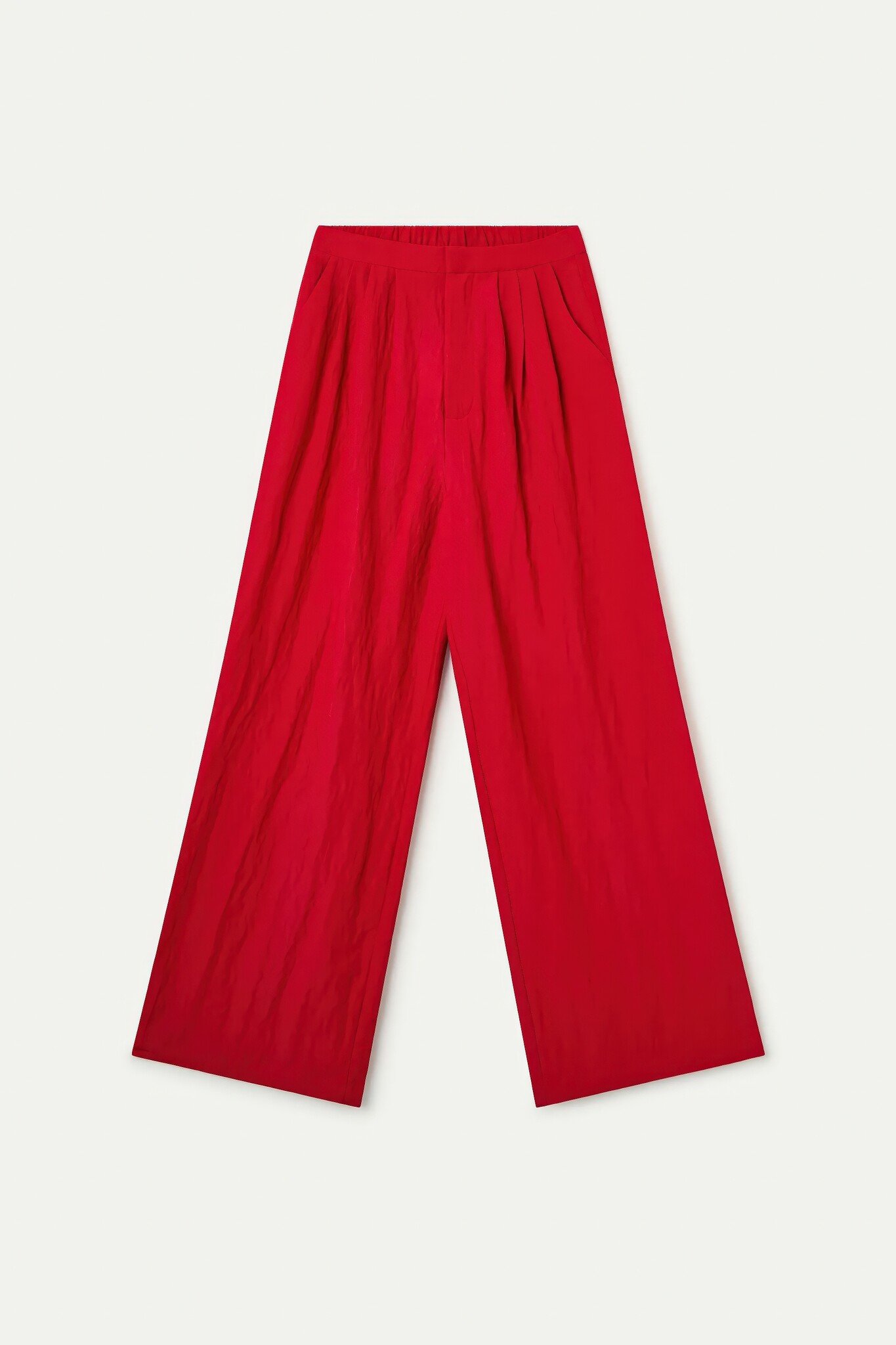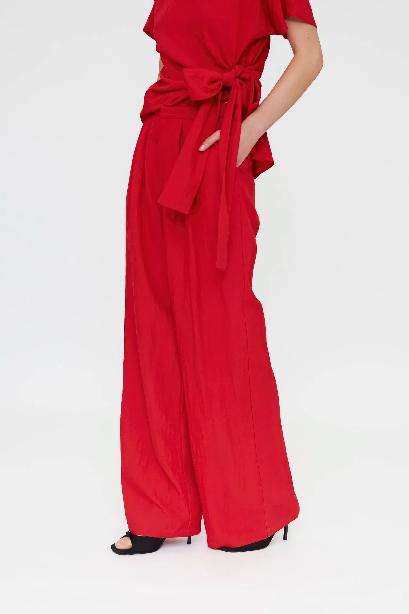 Flowy crepe trousers with fixed mid-rise waistband, straight leg and front zip fastening with pleats. Side pockets. Colour: red.