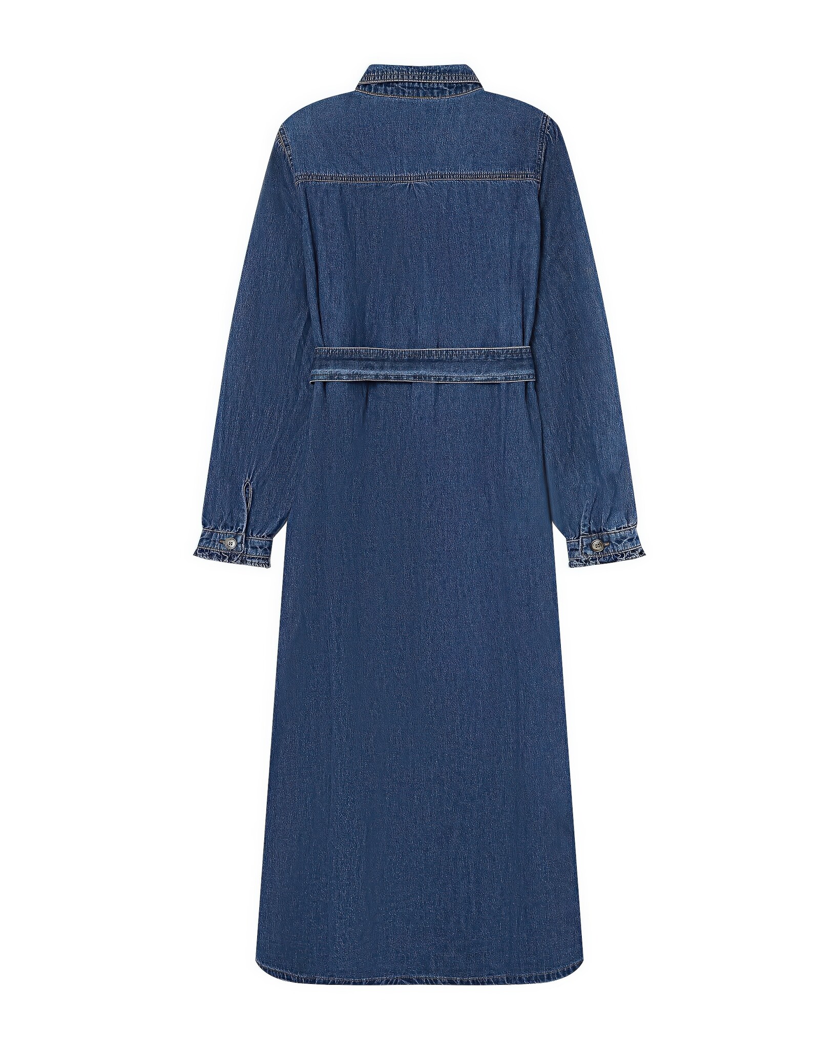 Long denim shirt dress with straight cut, removable belt with horn-effect buckle and front button closure.