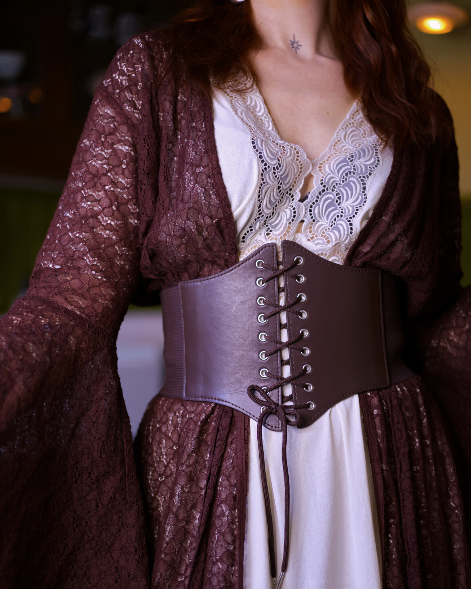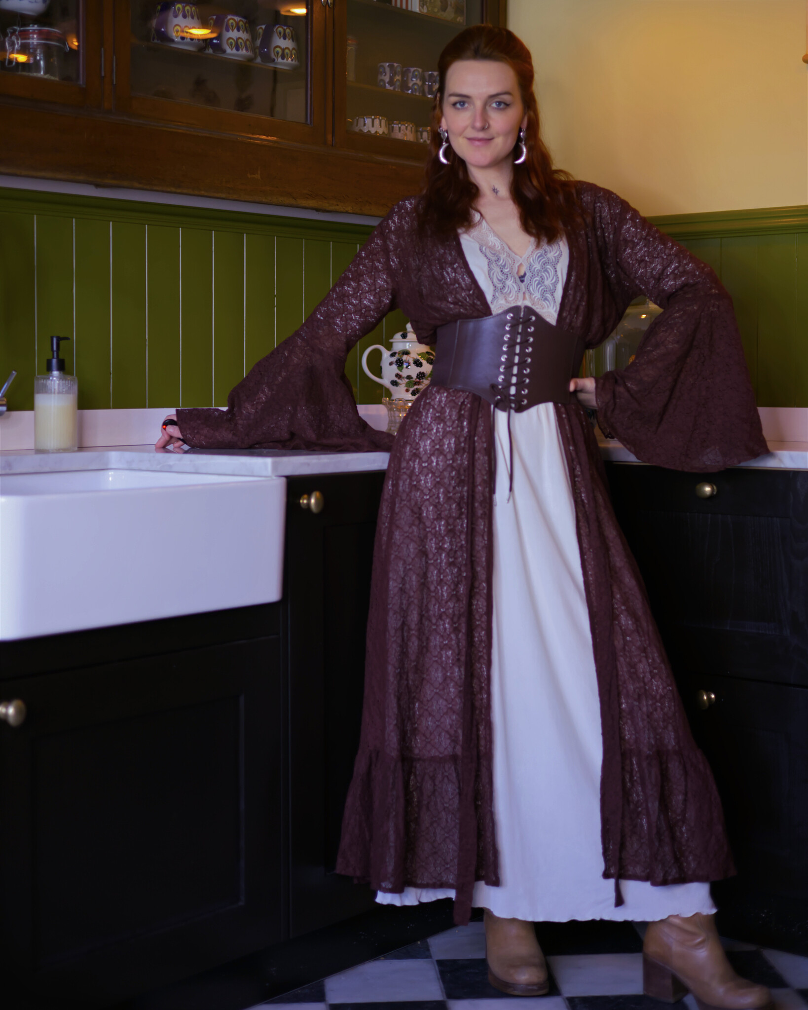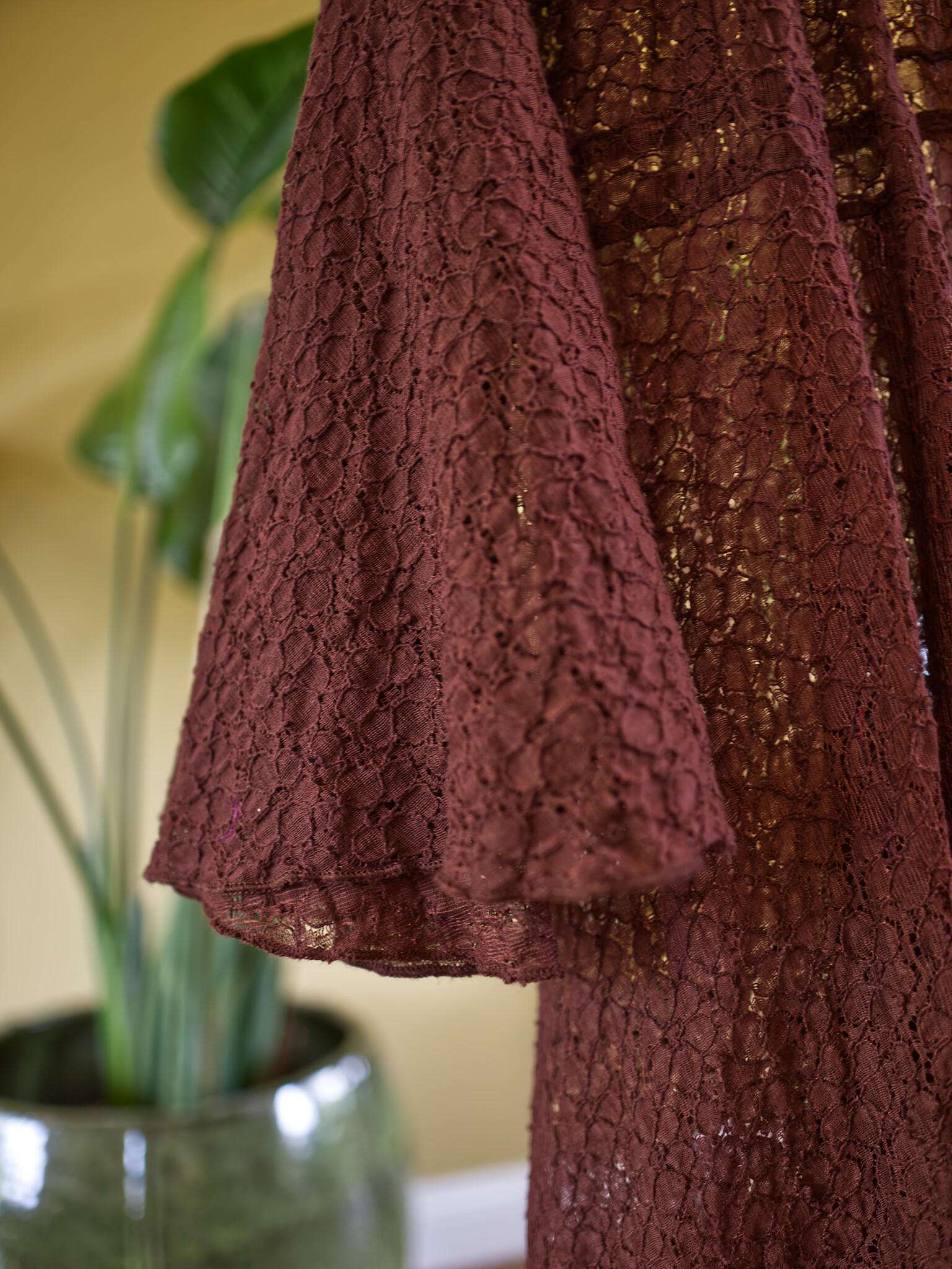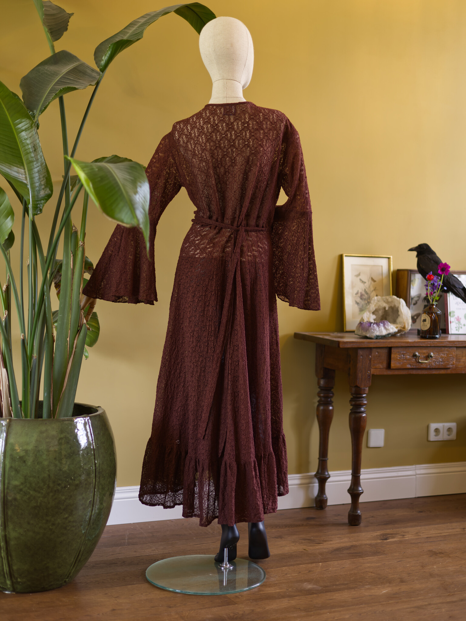 The Aurora dress is a long wrap dress in beautifully cotton lace. The skirt flows wide and elegant, while the flared sleeves give it an enchanting, almost witch-like presence. One size that adjusts with ease from S to about XXL, fastening just the way you like.