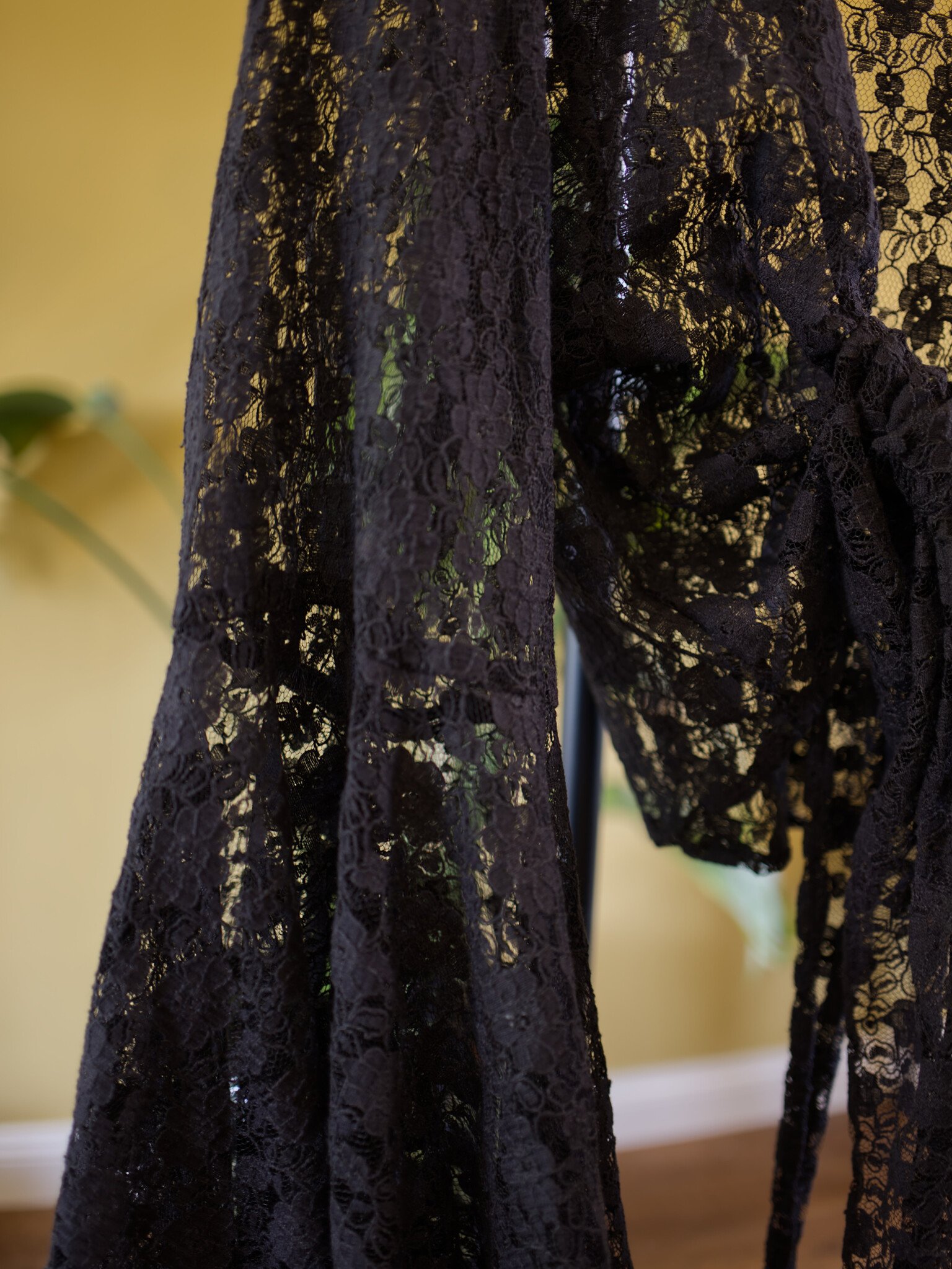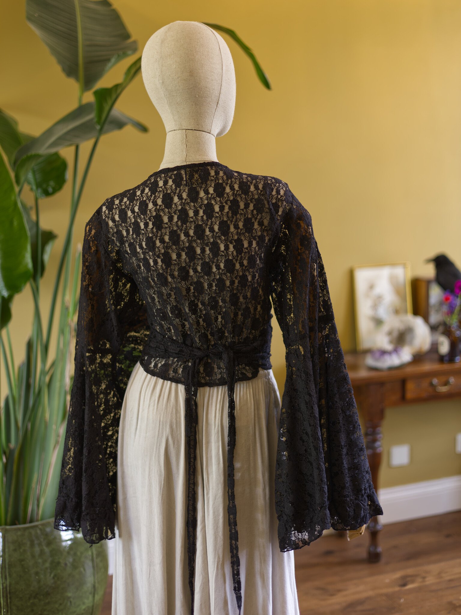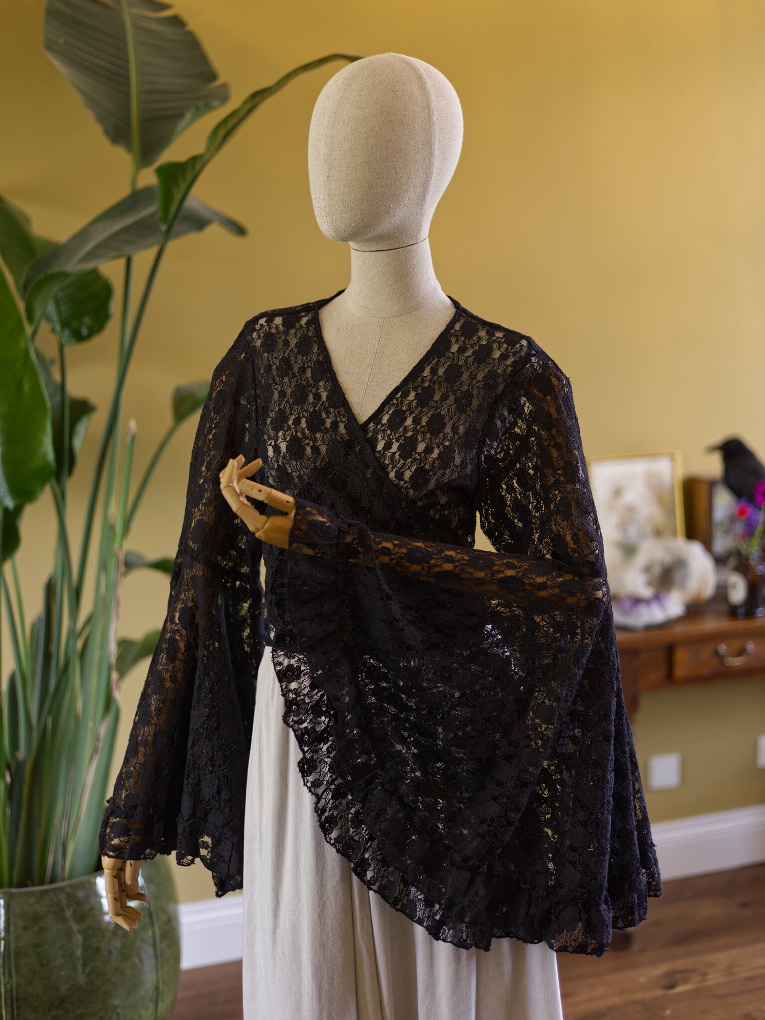 The Flora blouse is a luxurious wrap top, handcrafted from lace. The large bell sleeves dance around your wrists, creating an enchanting look. One size that shapes smoothly from XS to approximately XXL, easy to tie however you like.