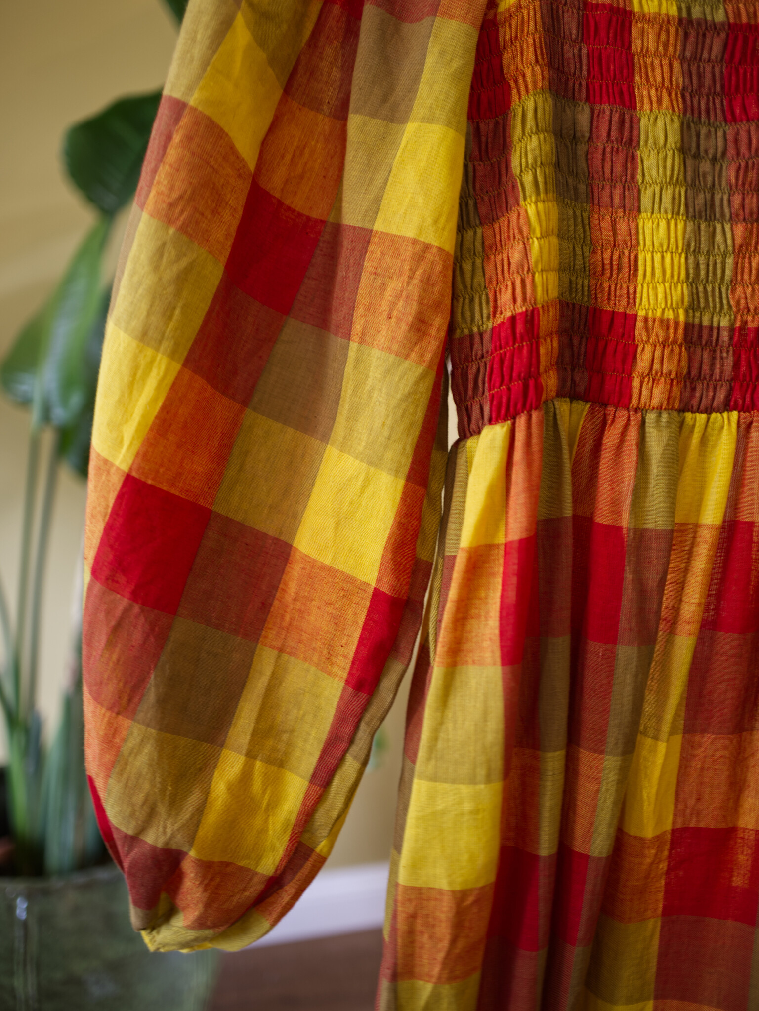 Elegant smocked blocked dress with balloon sleeves, and a touch of magic