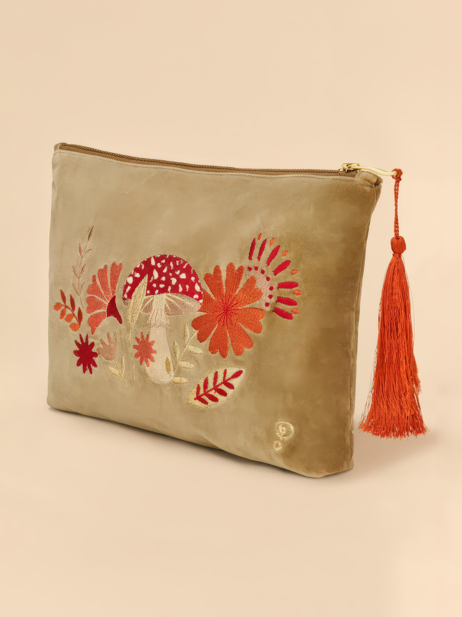 Large velvet zip pouch featuring a hand-embroidered tranquil toadstool motif in sage. Practical and stylish, perfect as a clutch or make-up/wash bag. Includes a bold orange tassel.