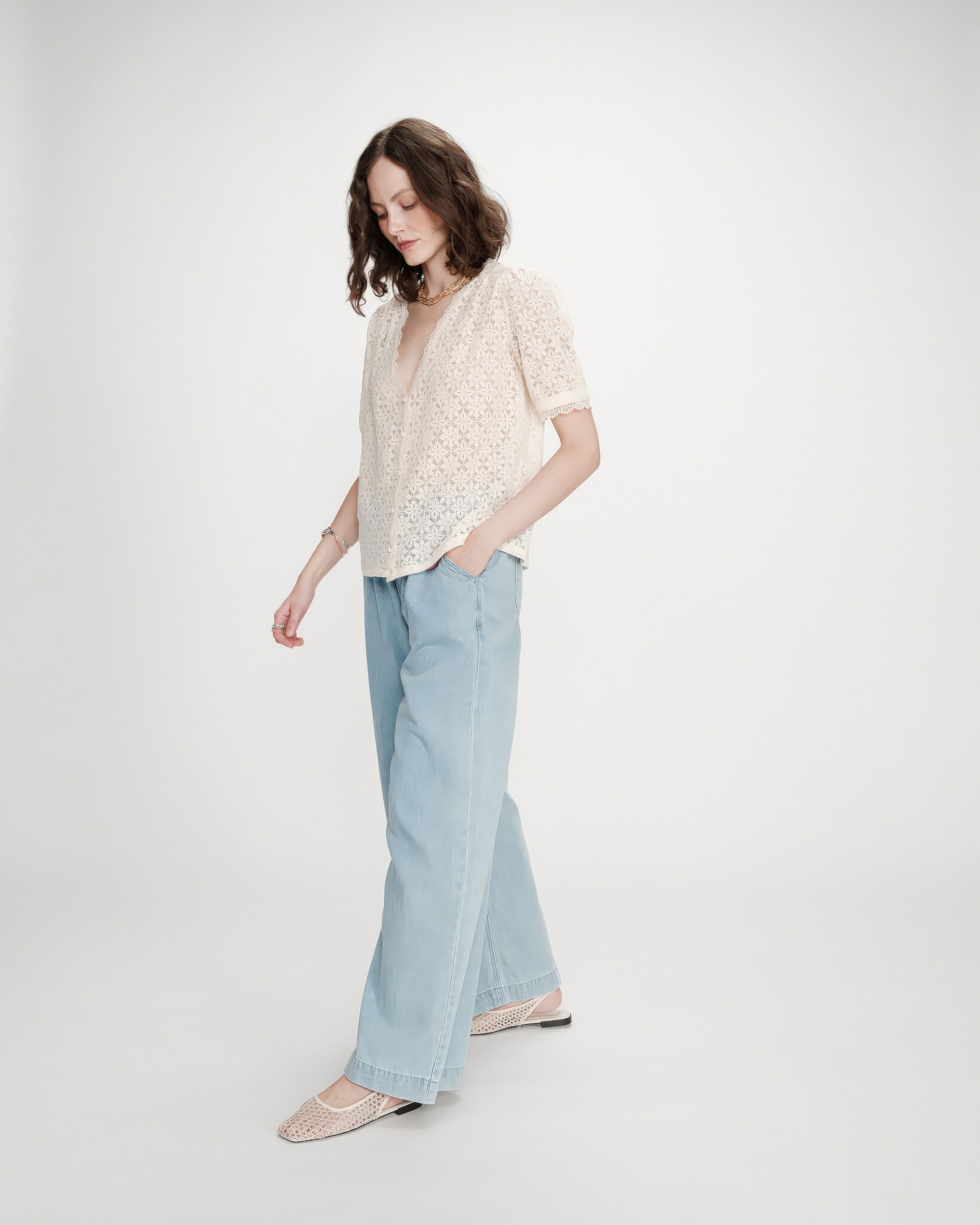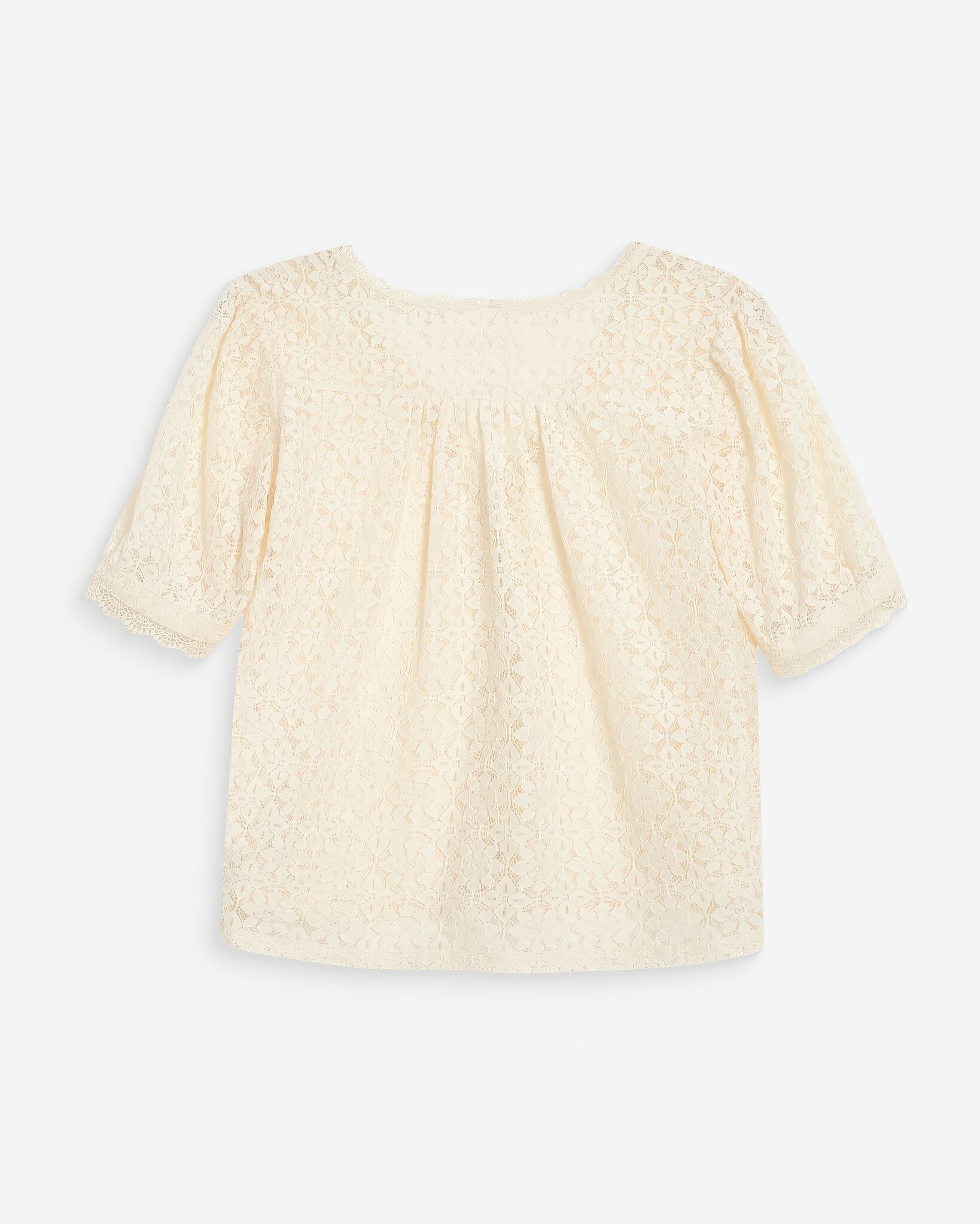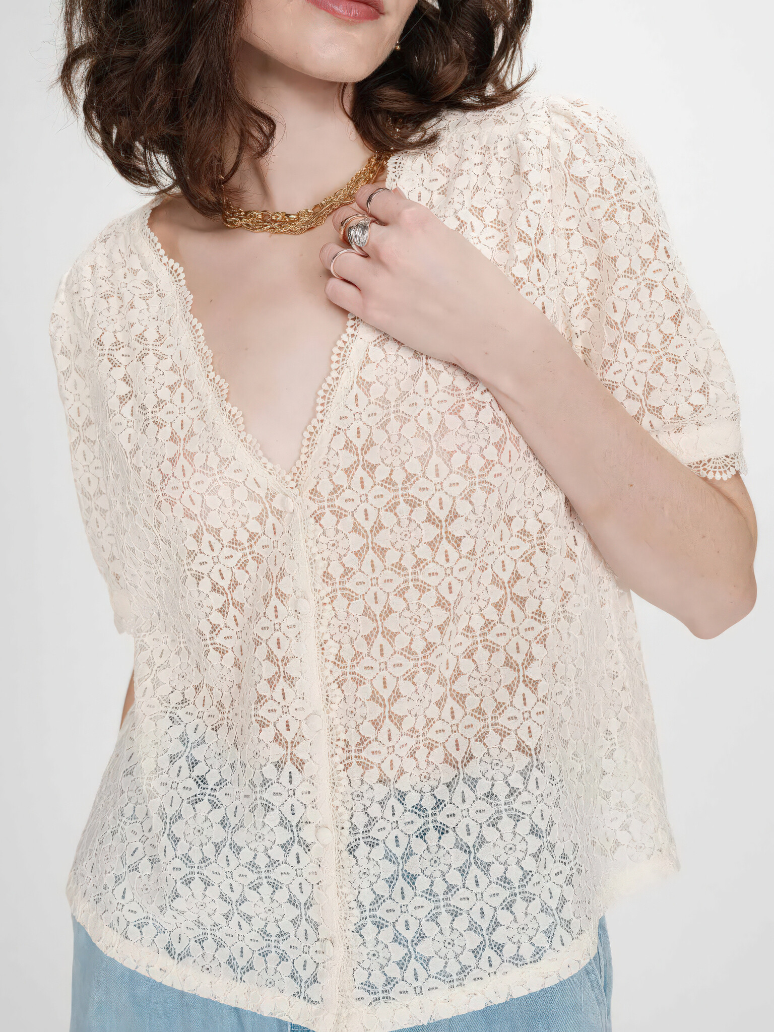 Slightly sheer lace blouse with straight cut, V-neck, short sleeves and front button placket. Gathered details at the shoulders and back, and scalloped finishes at the collar and sleeves. Colour: amande.