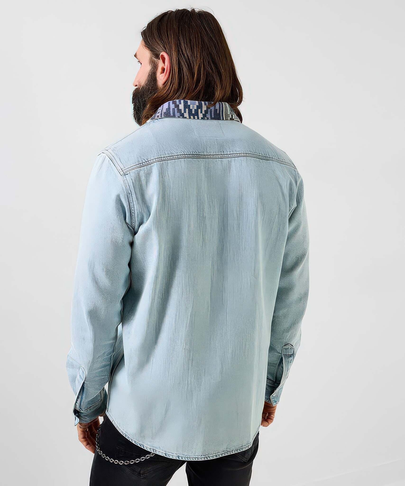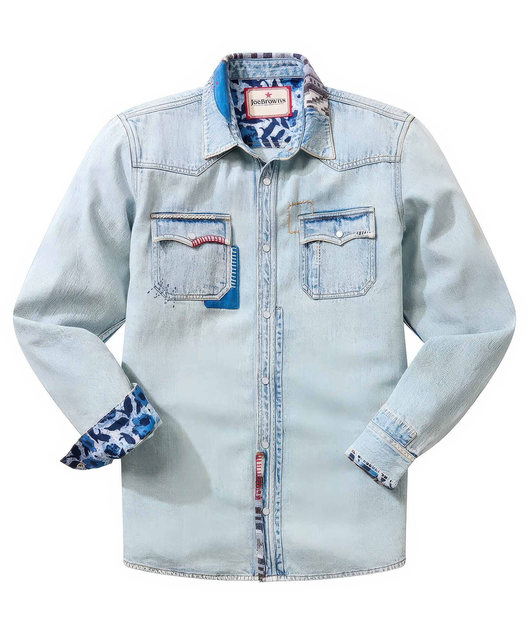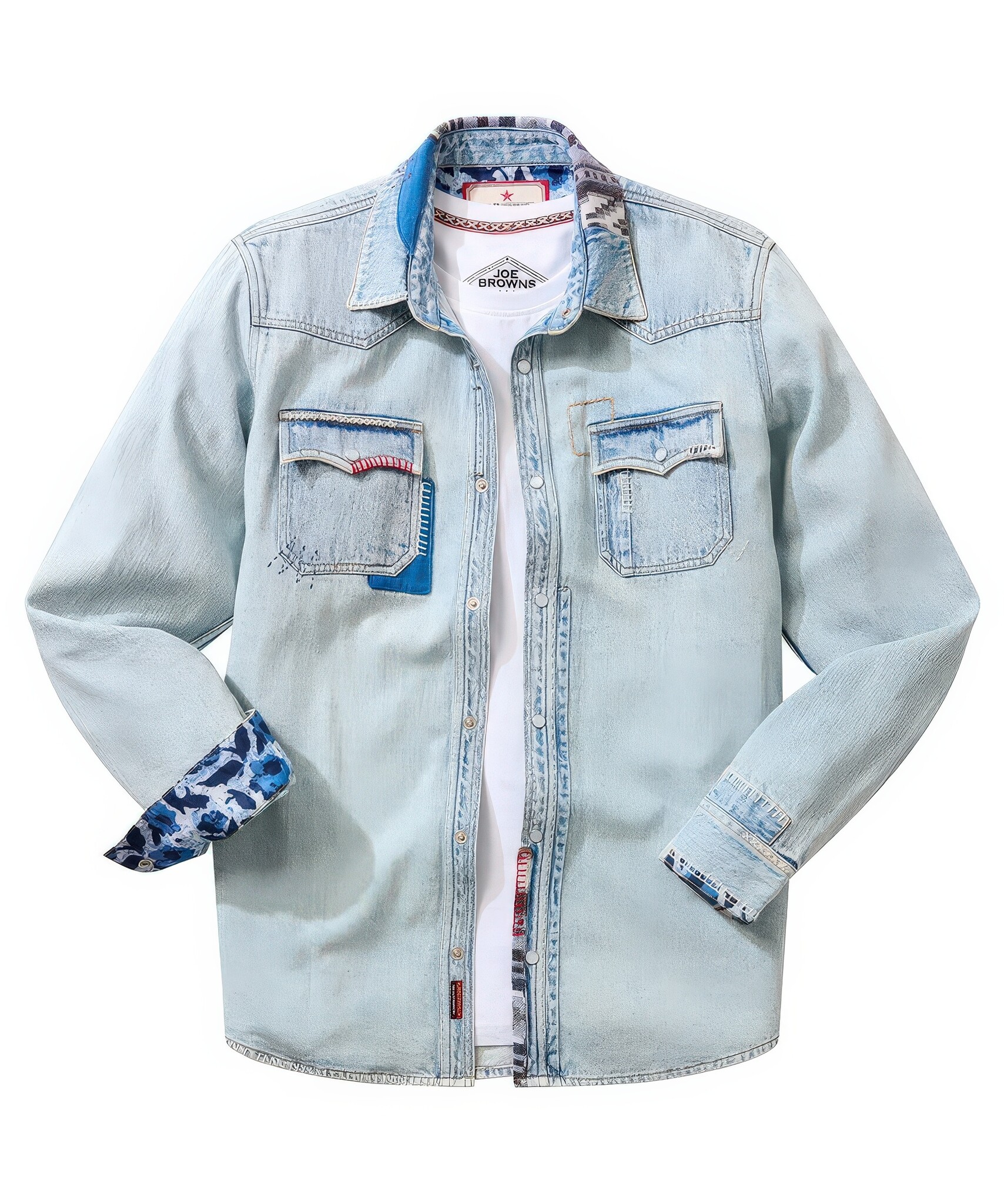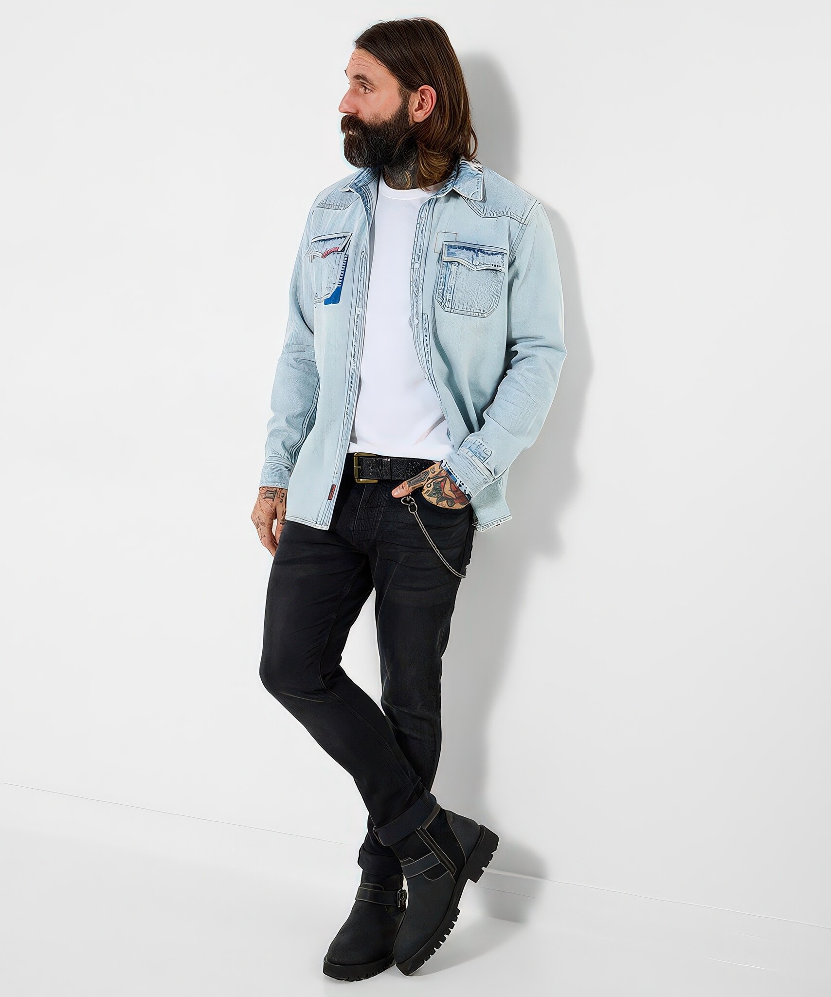 Light-wash denim overhemd met western-look, klassieke kraag, lange mouwen en parelstijl drukknopen. Contrasterende stiksels, koordafwerking en paneeldetails.