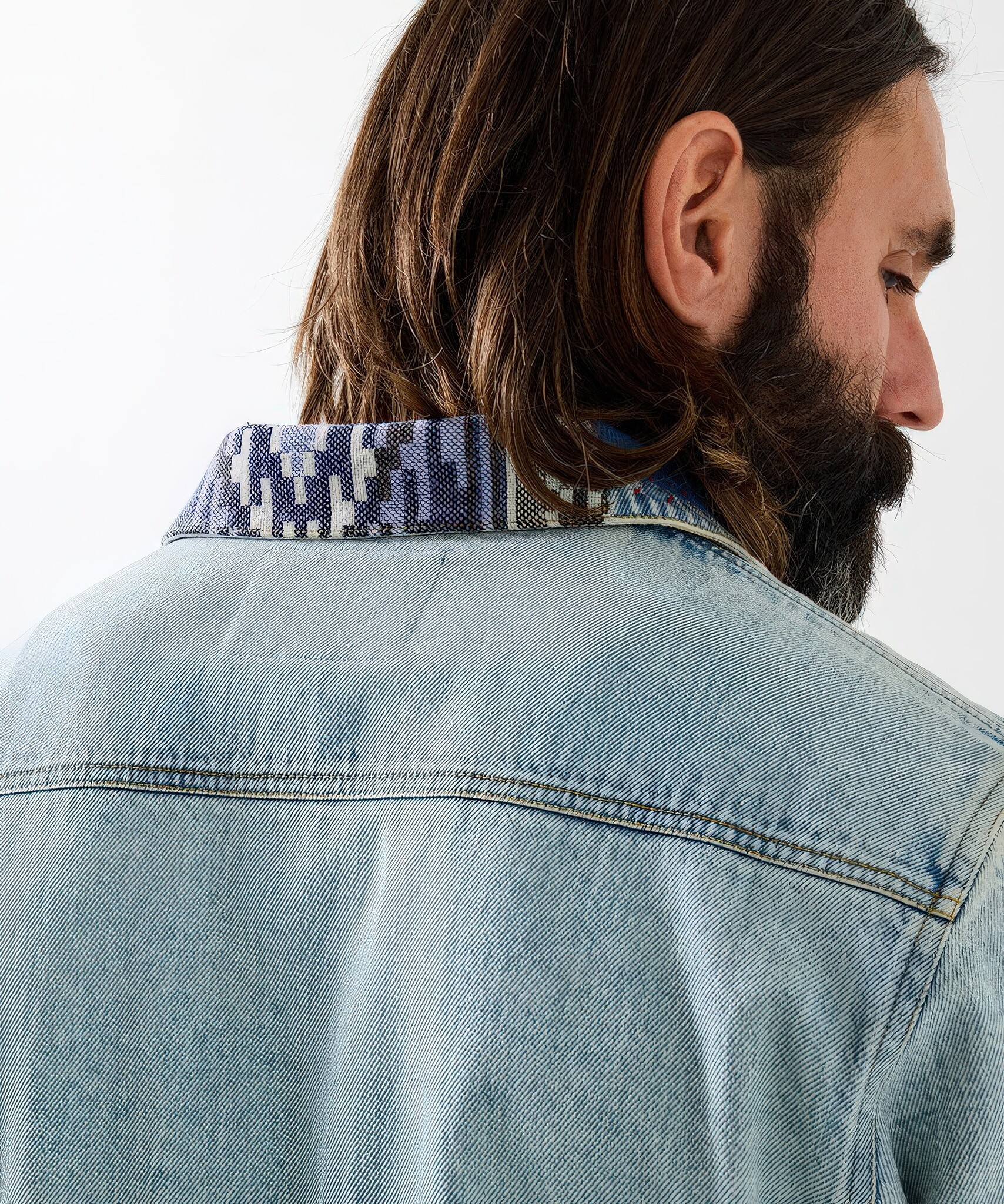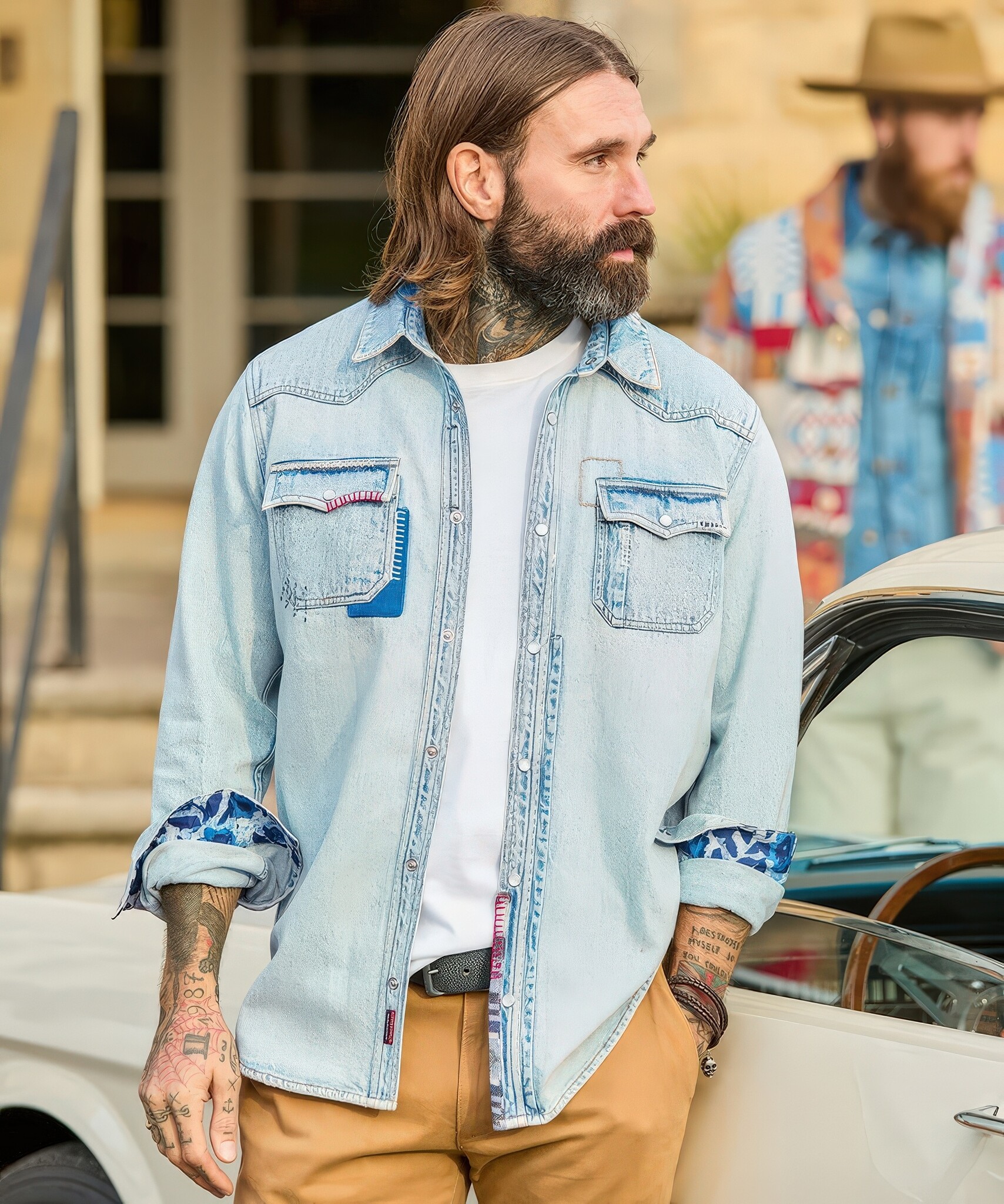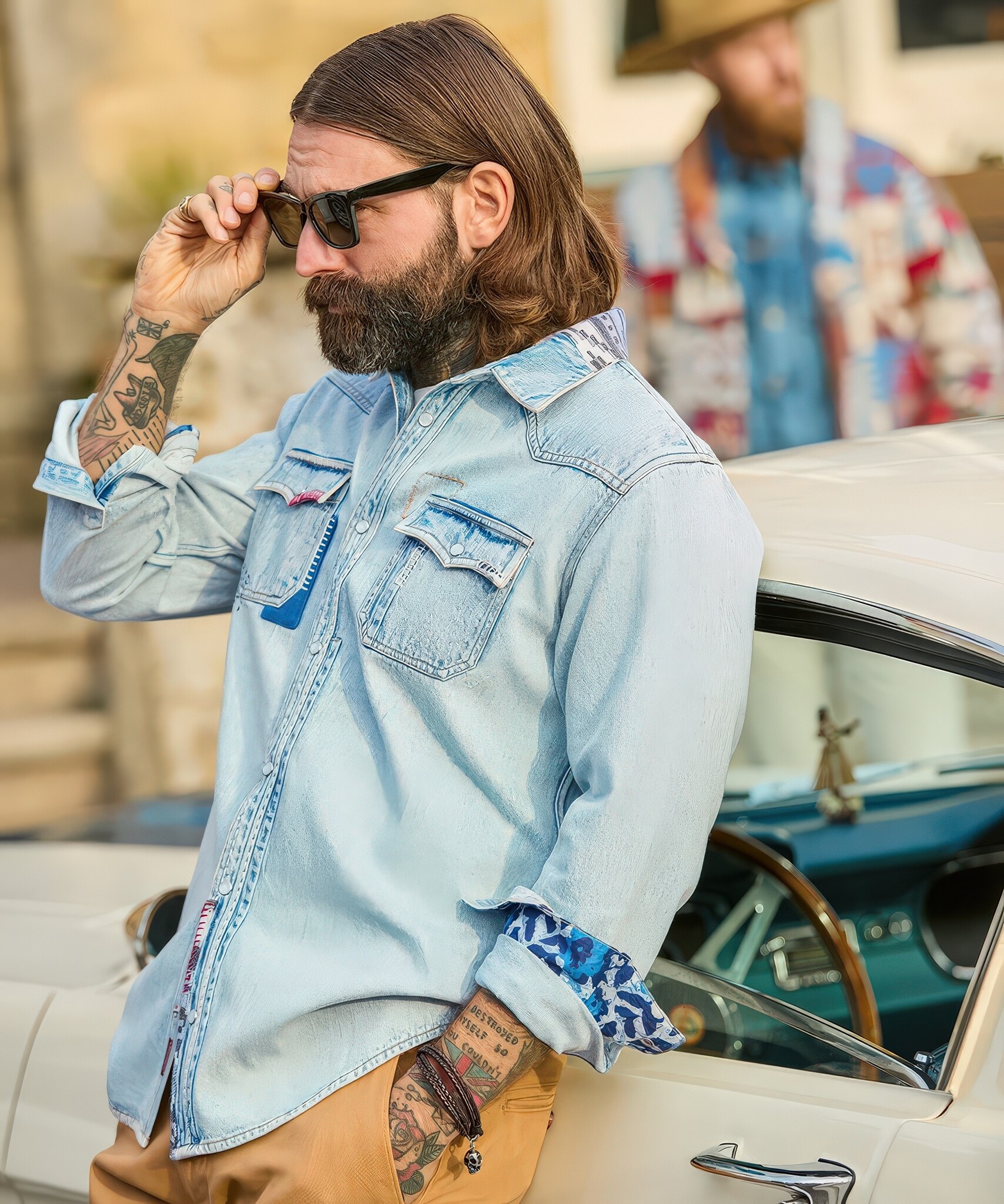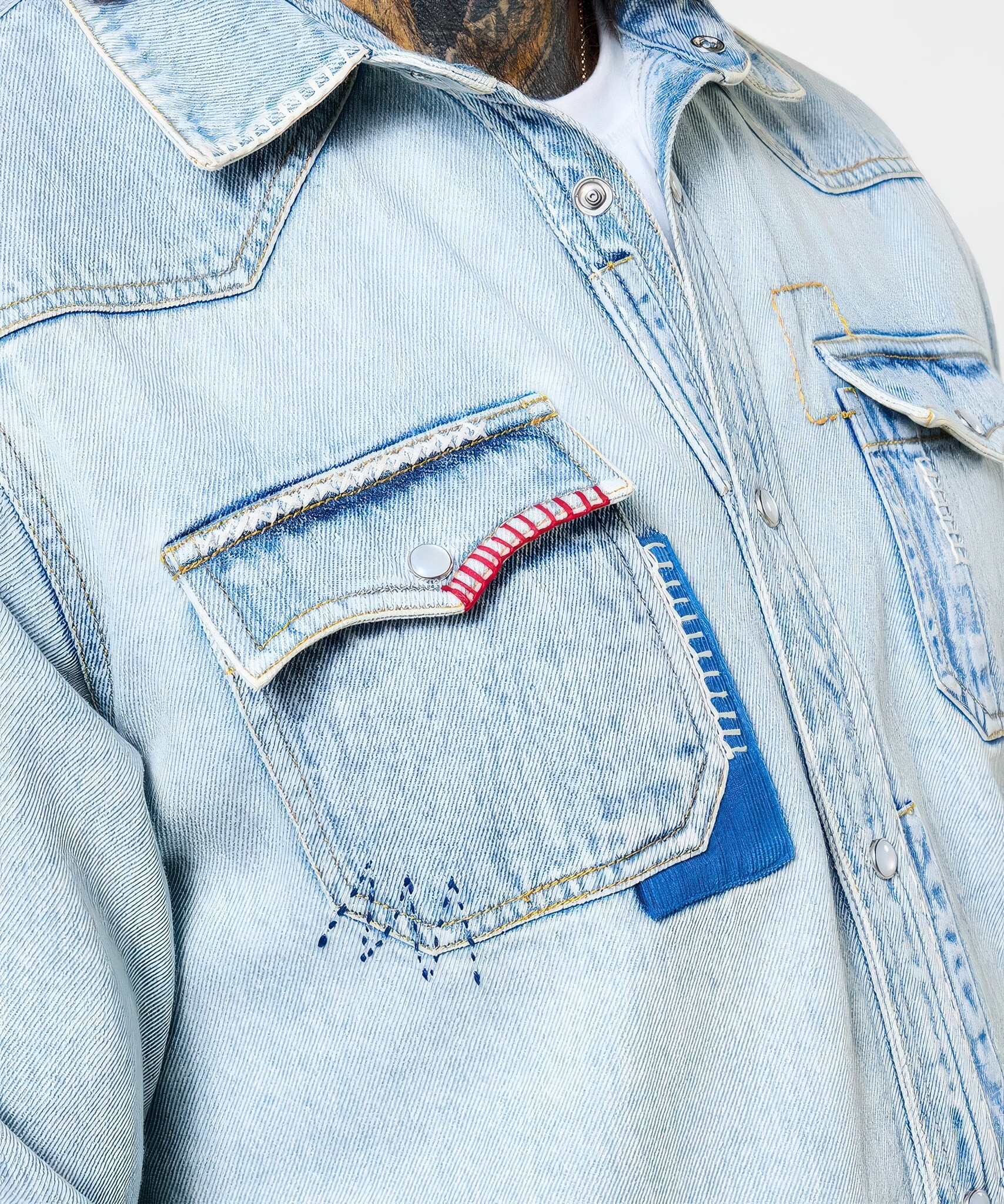 Light-wash denim overhemd met western-look, klassieke kraag, lange mouwen en parelstijl drukknopen. Contrasterende stiksels, koordafwerking en paneeldetails.