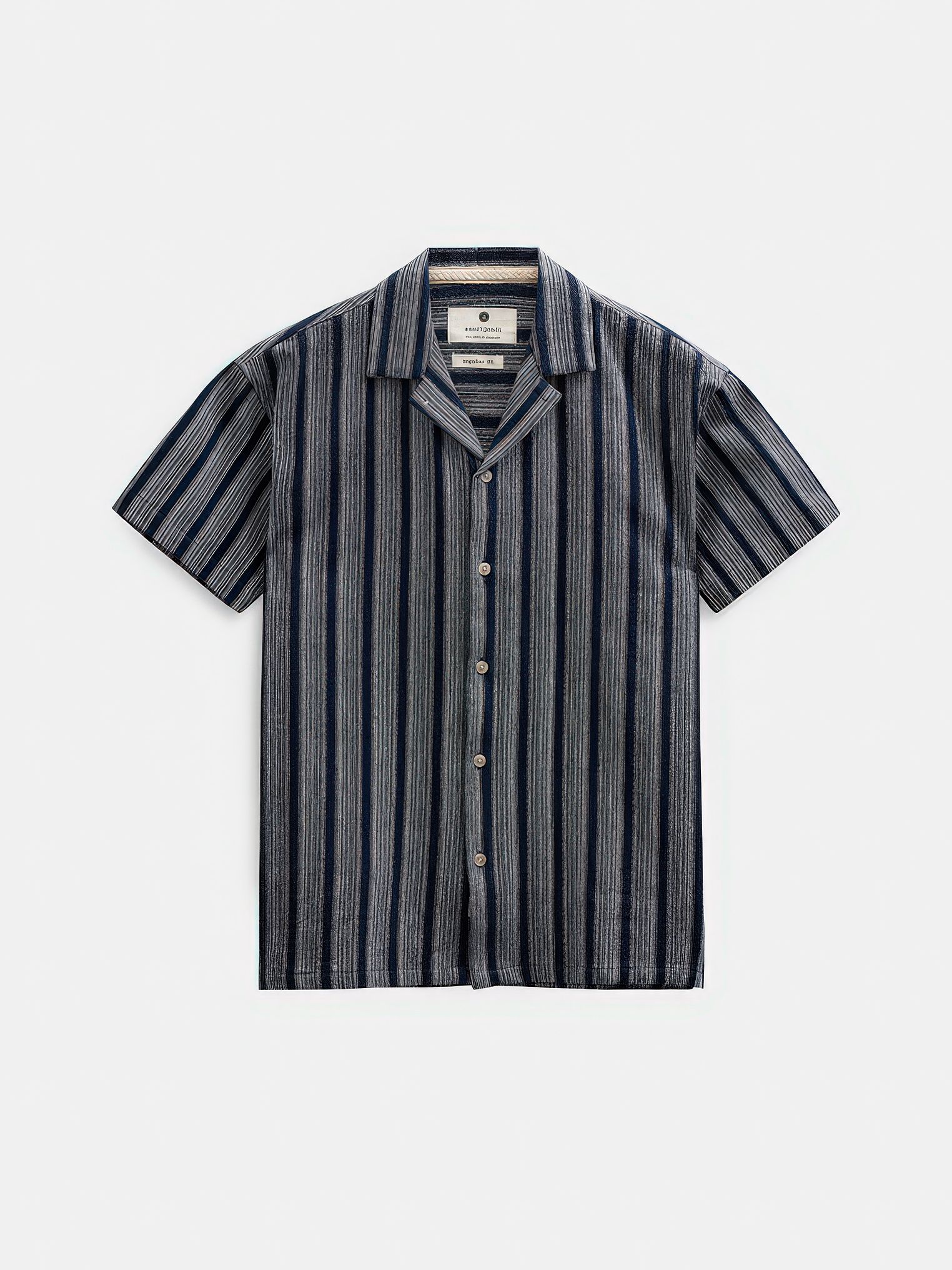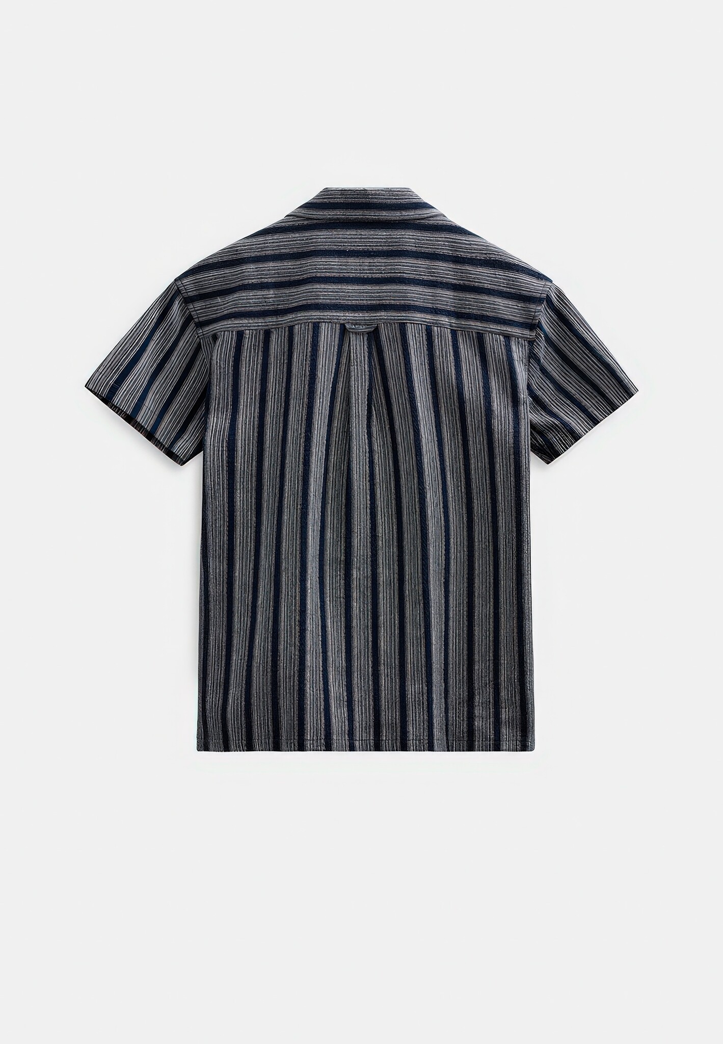 Kortgemouwd overhemd van dobby katoen in sky captain met verticale strepen in marineblauw en grijs. Campkraag, knoopsluiting aan de voorkant en borstzakje.