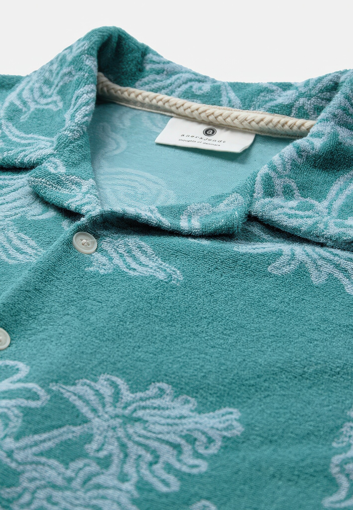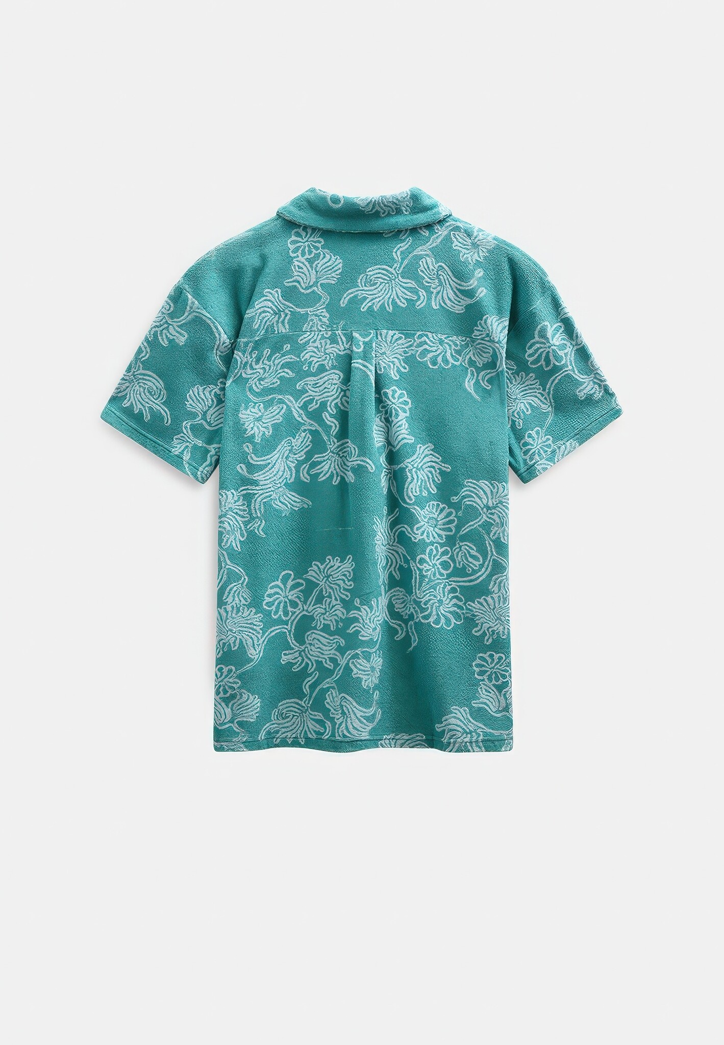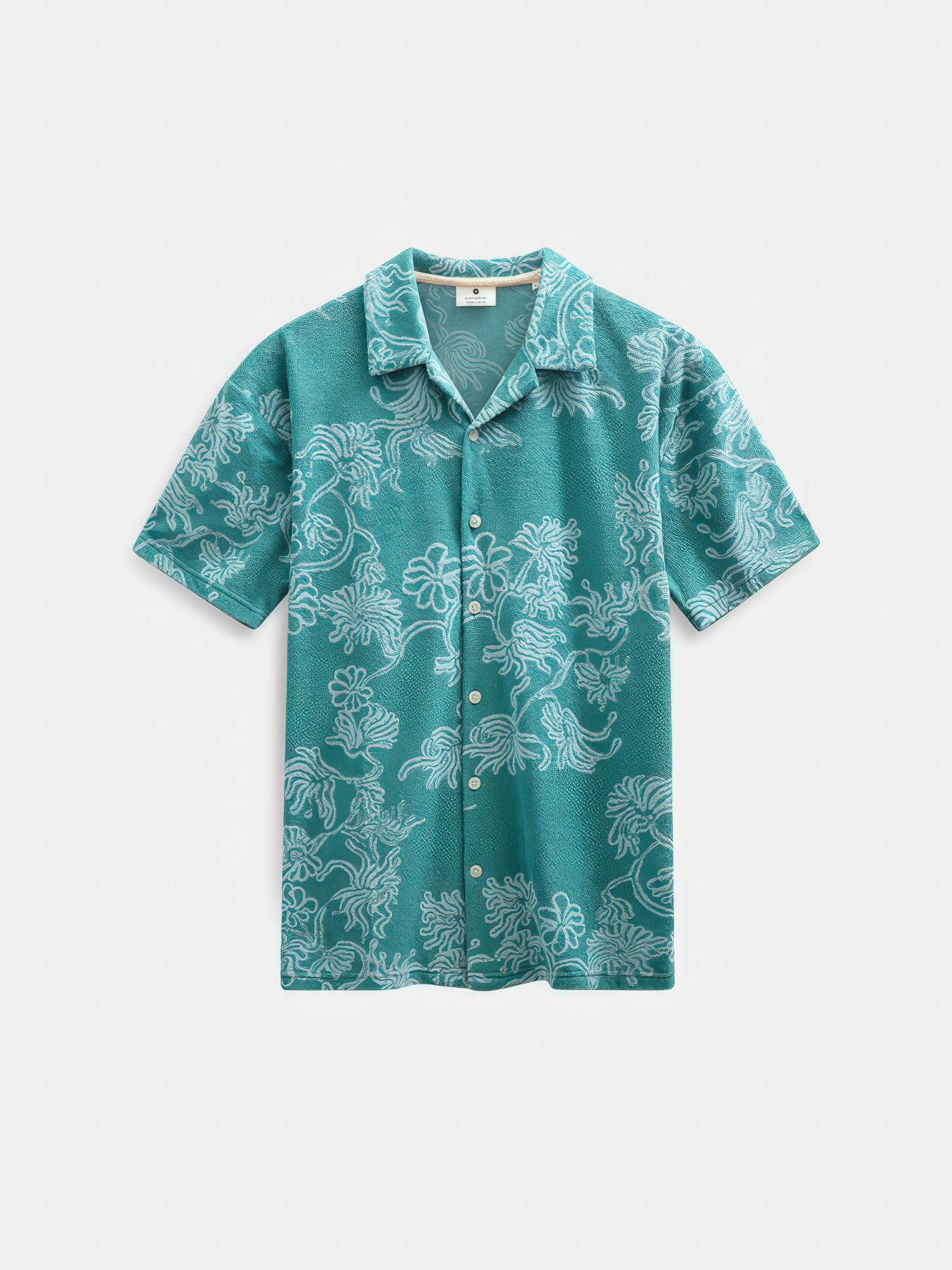 Kortgemouwd overhemd van badstof jacquard in teal met een all-over floraal jacquardpatroon in toon-op-toon. Campkraag en knoopsluiting aan de voorkant.