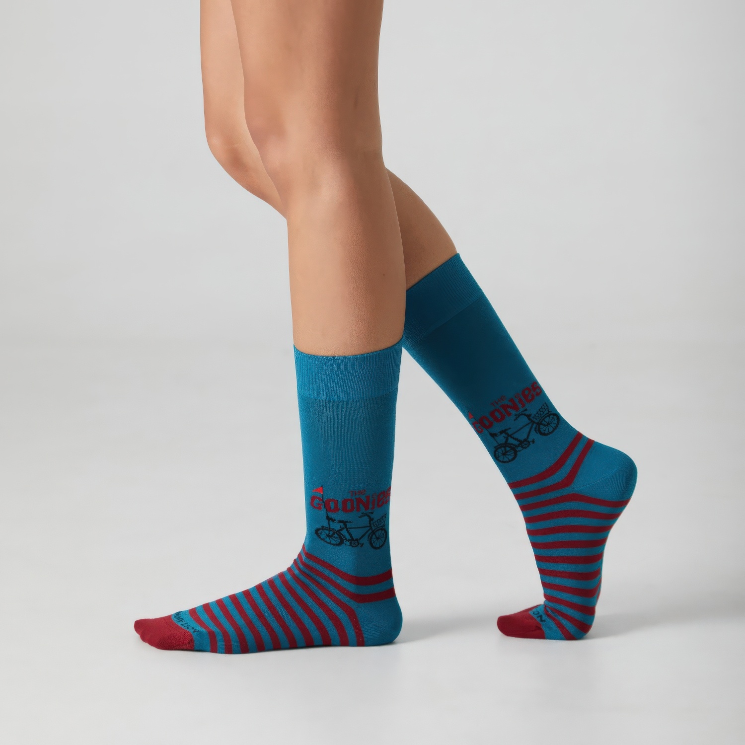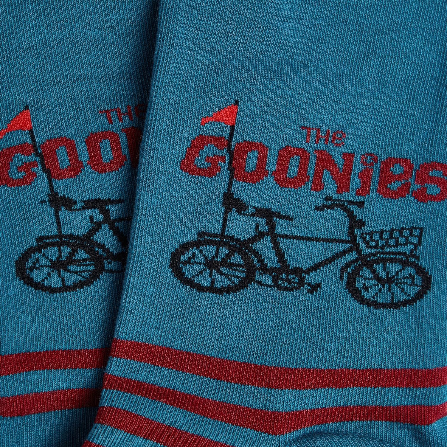 The Goonies x Jimmy Lion Sokken geïnspireerd op The Goonies, met een gedetailleerde fietsillustratie op een aqua achtergrond met bordeauxrode strepen