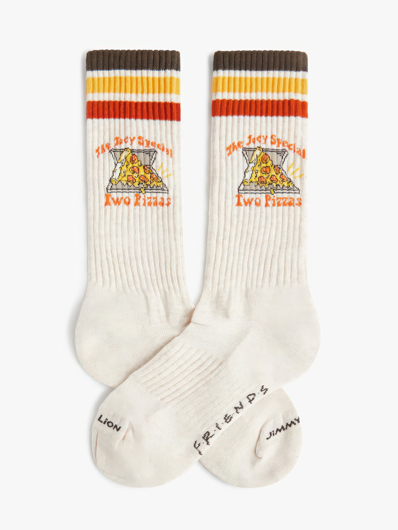 Beige athletic sokken met Friends™-design van de iconische “Joey Special” — twee pizza’s — gemaakt van een zachte biologische katoenmix.