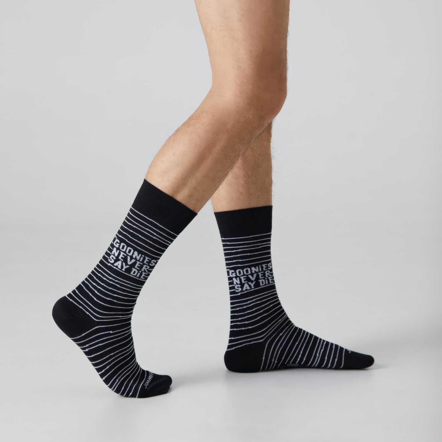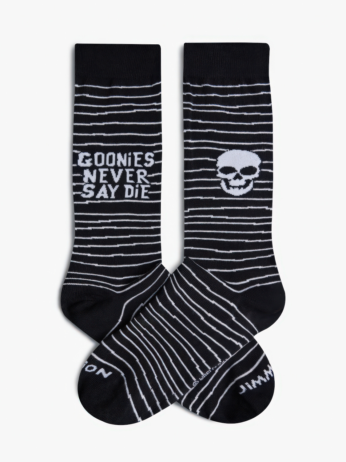 The Goonies x Jimmy Lion Sokken met de iconische slogan "Goonies never say die" op een zwarte achtergrond met witte strepen, geïnspireerd op de klassieke jaren '80-film.