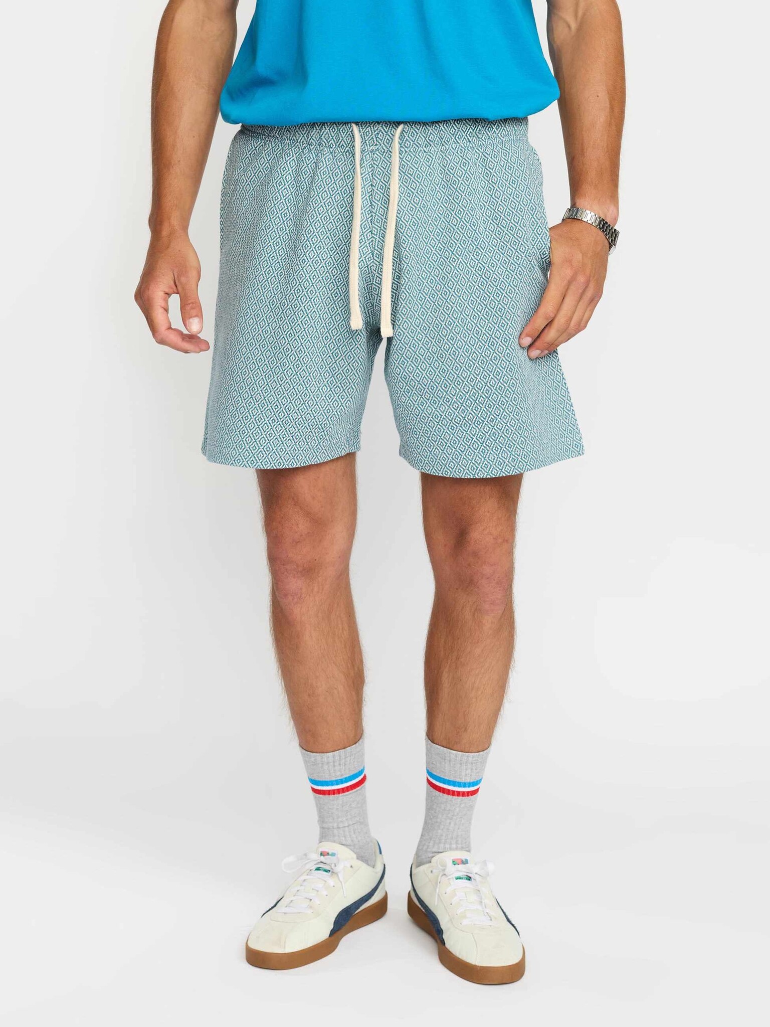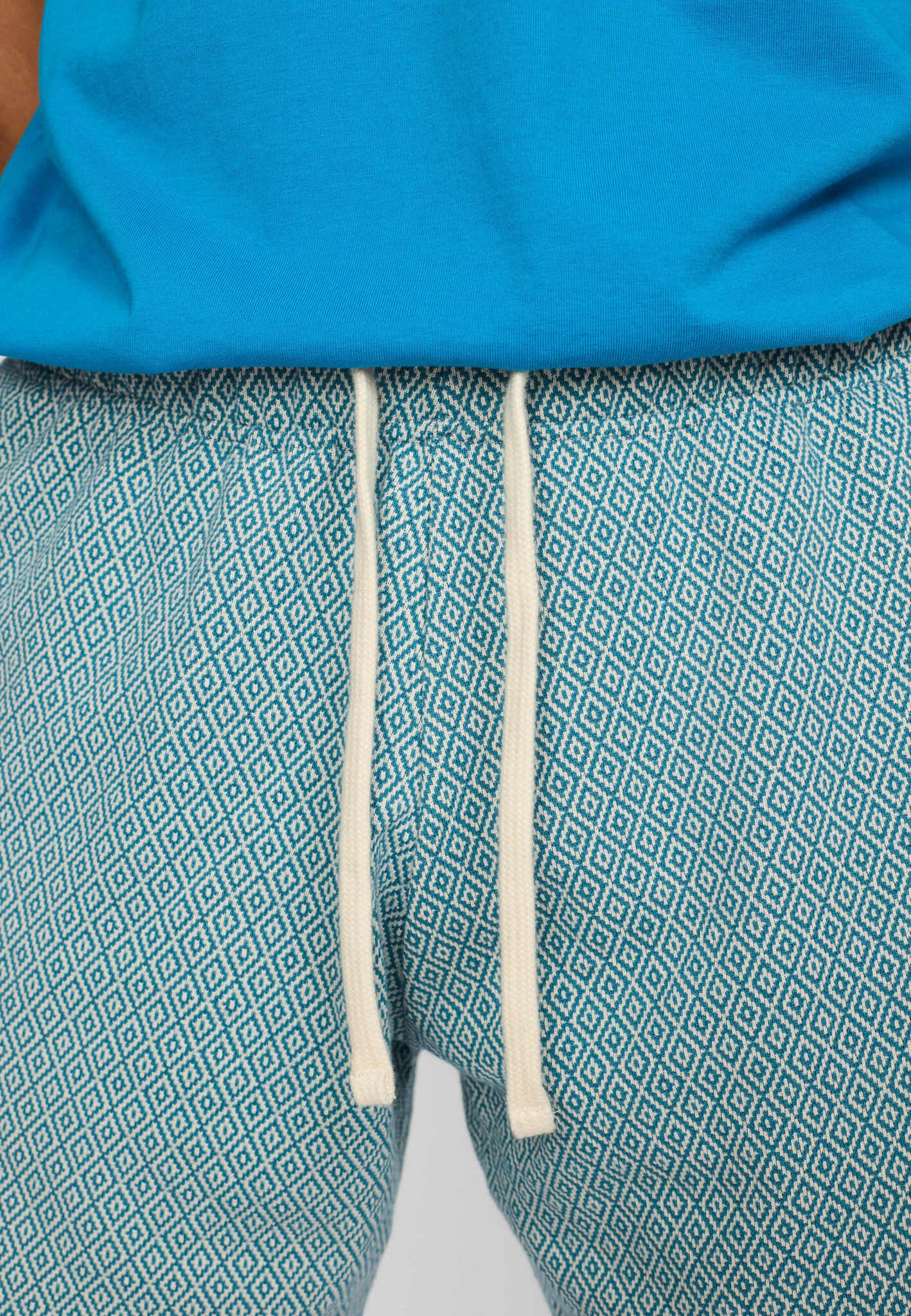 Shorts van zacht en stretchend biologisch katoenen jersey in stofblauw met een klein arlequin jacquardpatroon. Elastische taille met verstelbaar koord en twee schuine steekzakken.