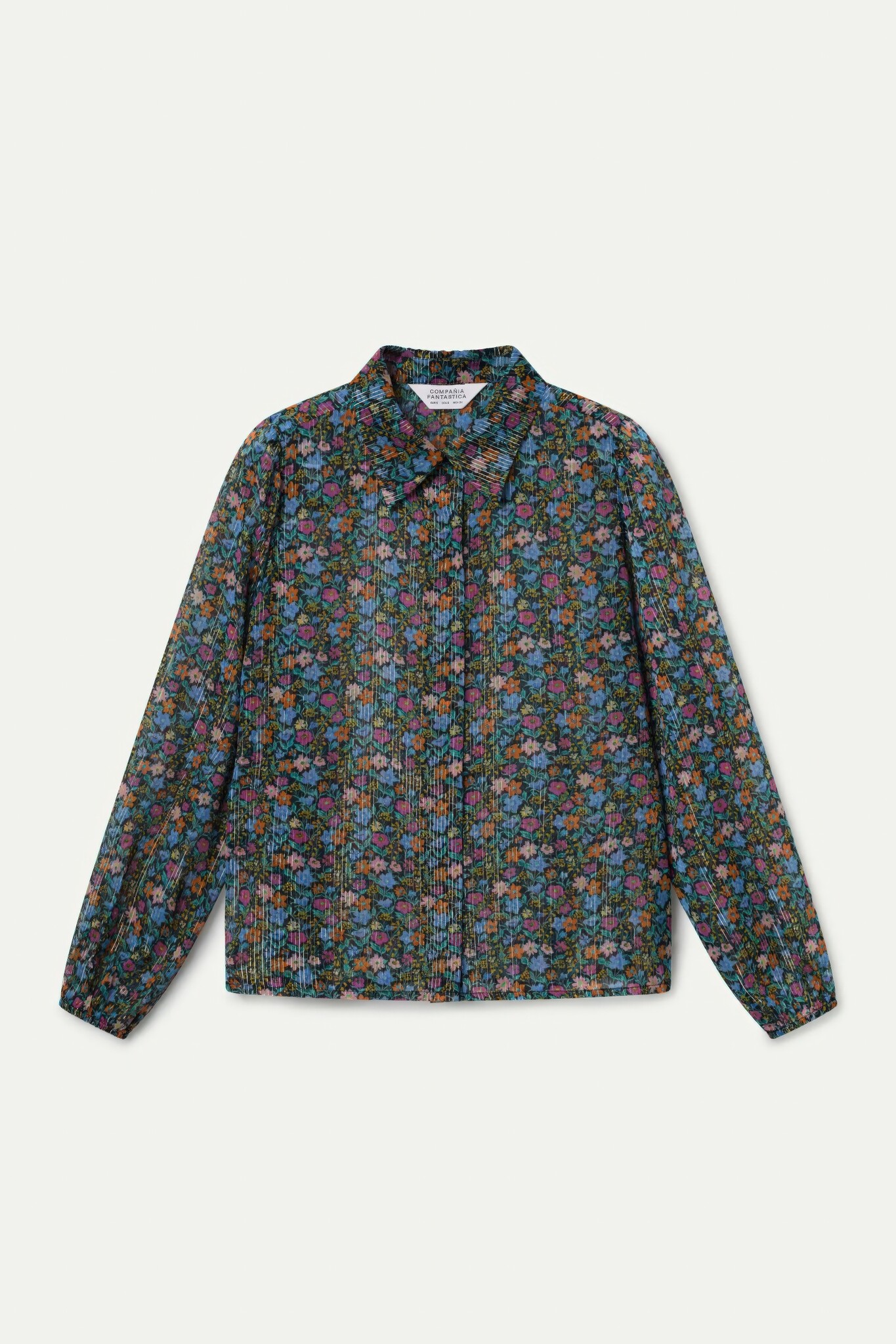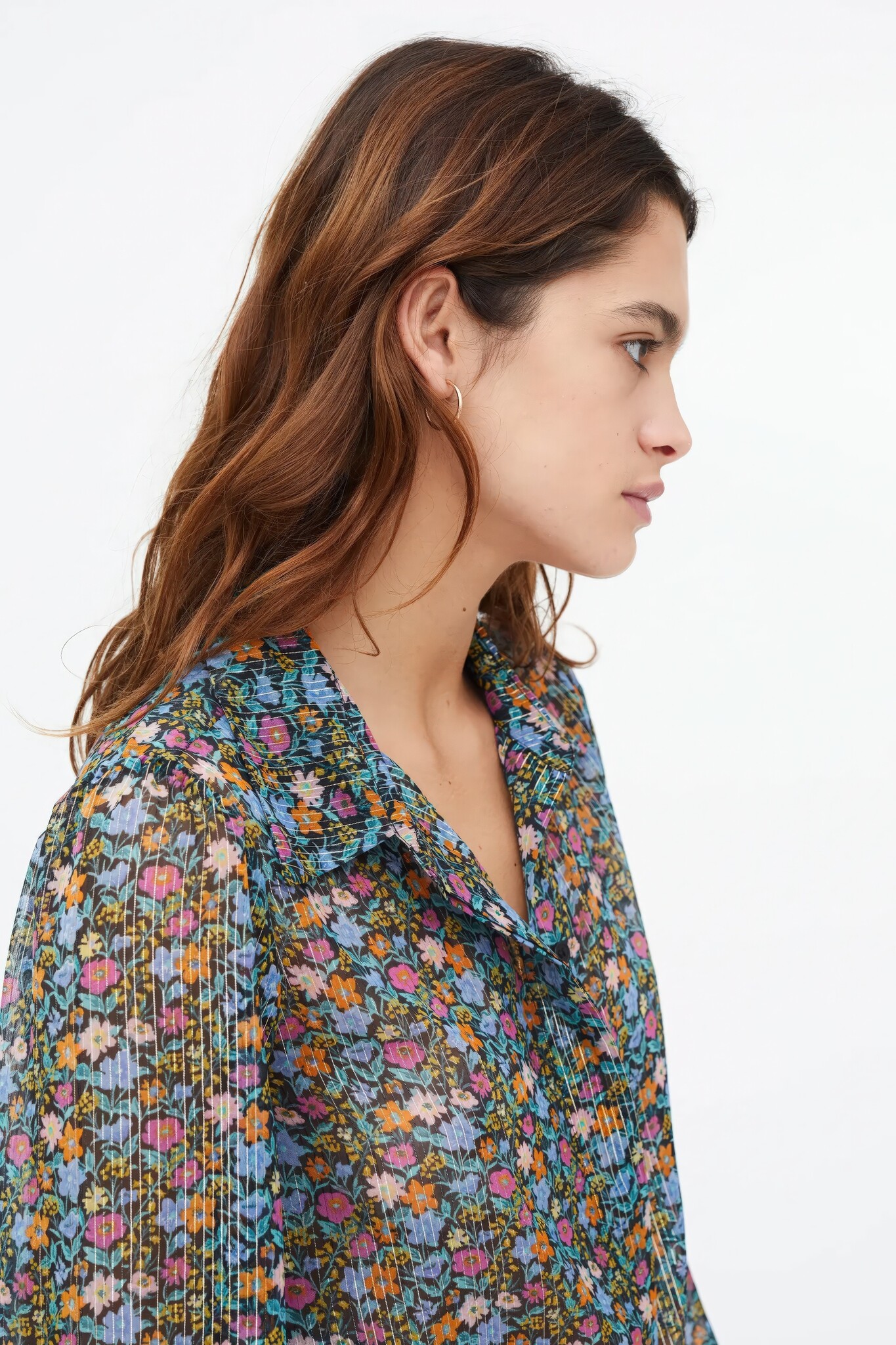 Lurex crêpe blouse met Flowers Lurex-print, kraag, lange mouwen met elastische manchetten en verborgen knoopsluiting.