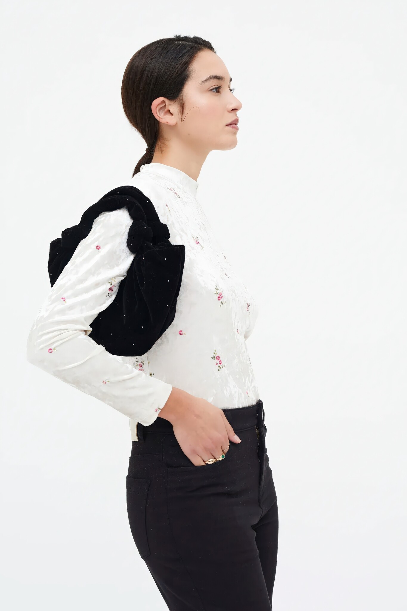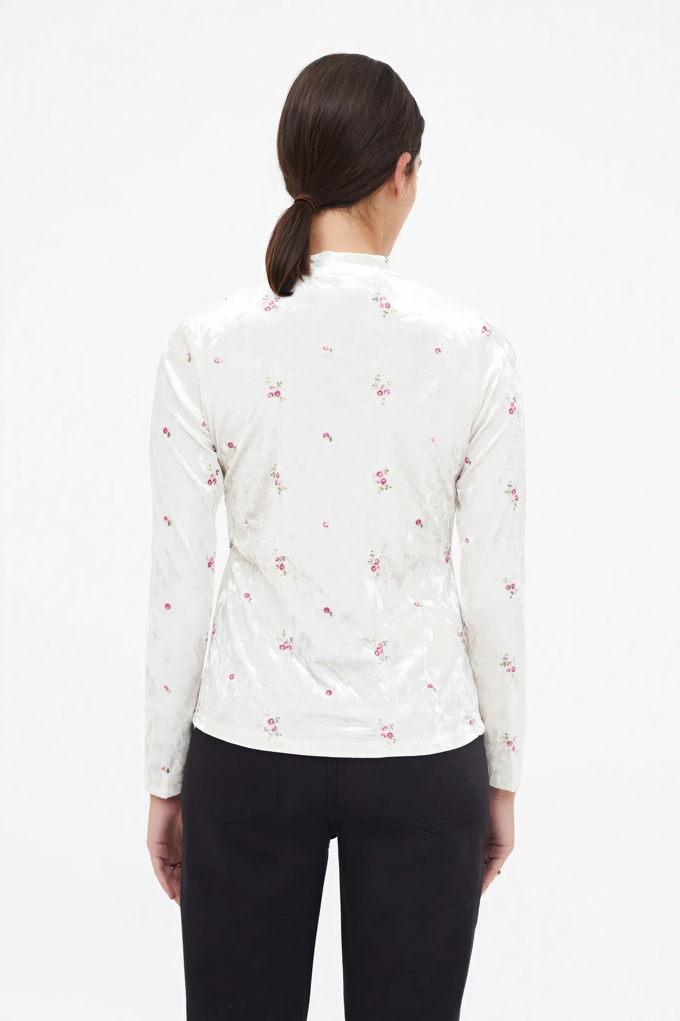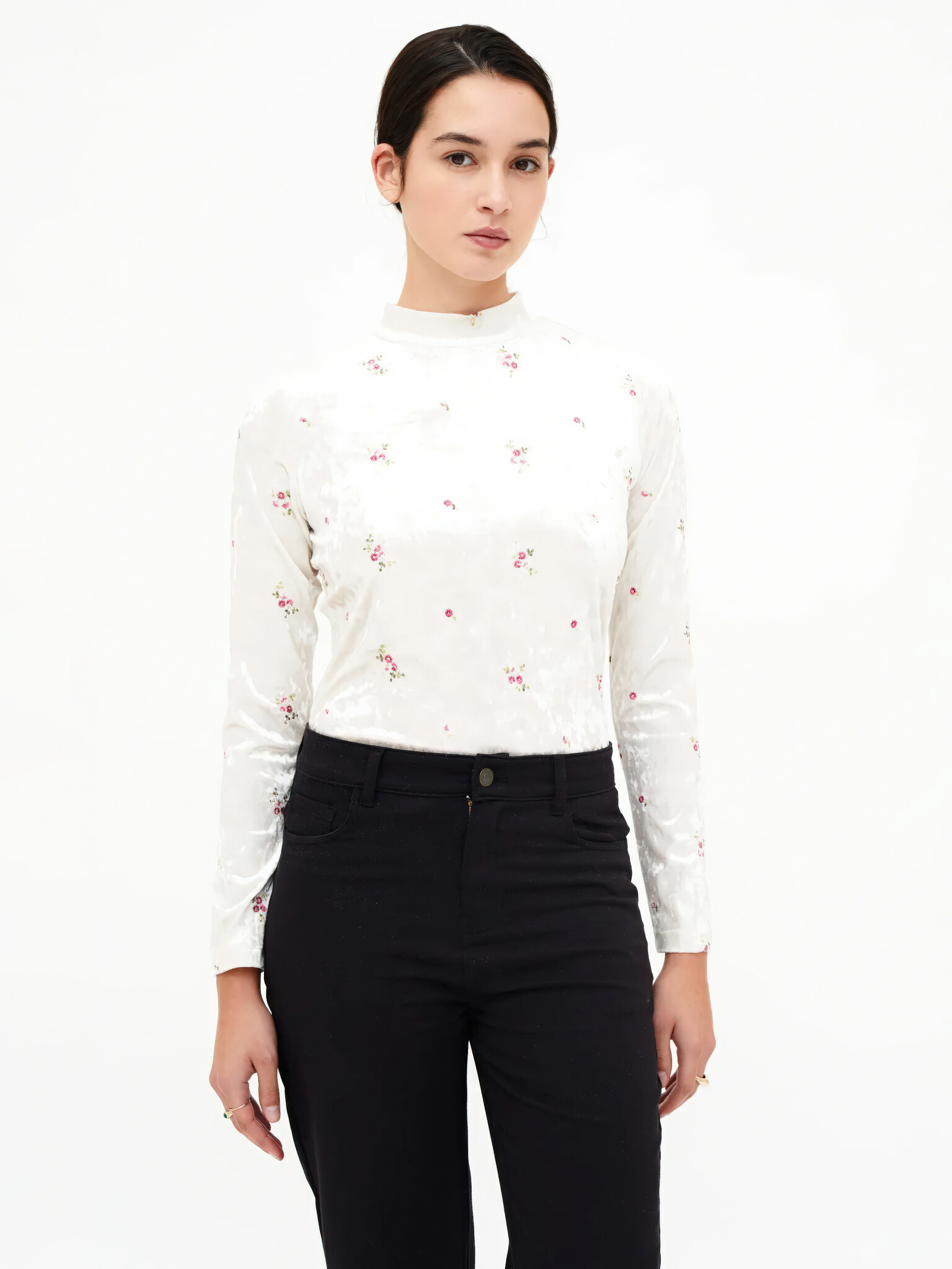 Fluwelen top met bloemenborduursel, mockneck en lange mouwen.
