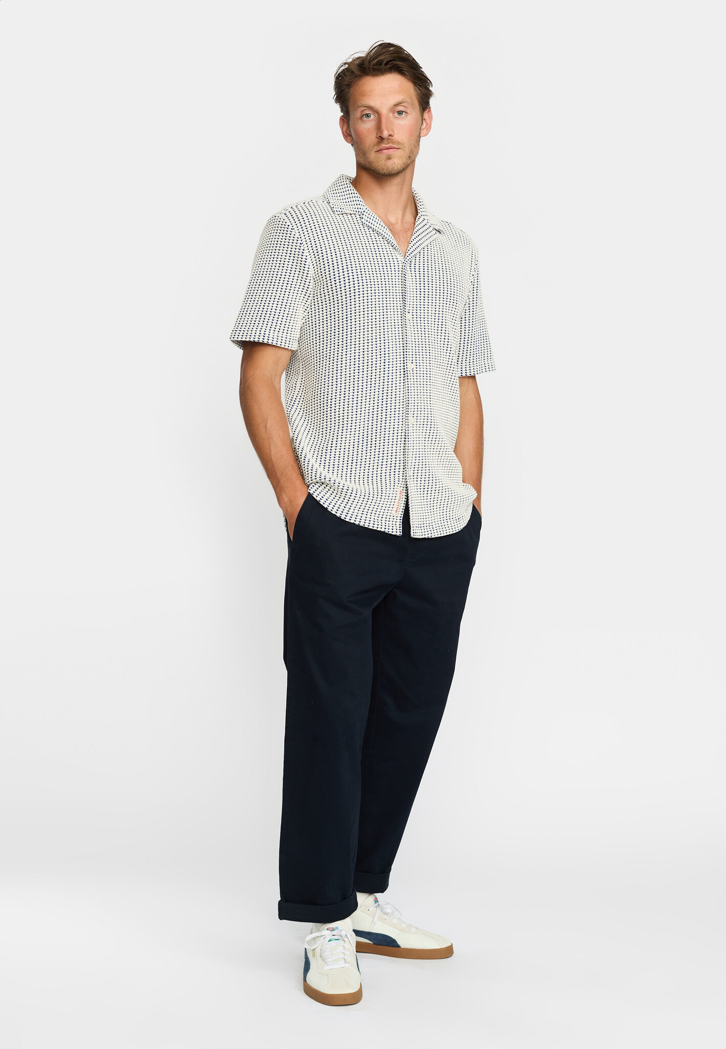 Kortgemouwd Cubaans overhemd van katoen-polyester mix met gebreide structuur en lichte stretch. Knoopsluiting aan de voorkant, gebogen zoom en dubbele juknaad aan de achterkant.