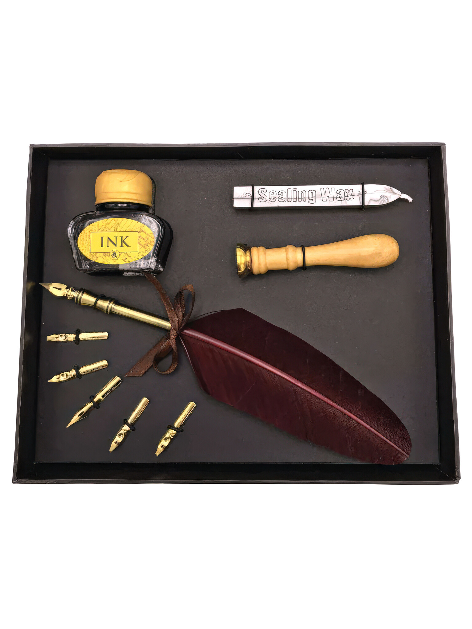 - Inhoud: Natuurlijke wasstick, zegel, veer met 5 pennen en inkt