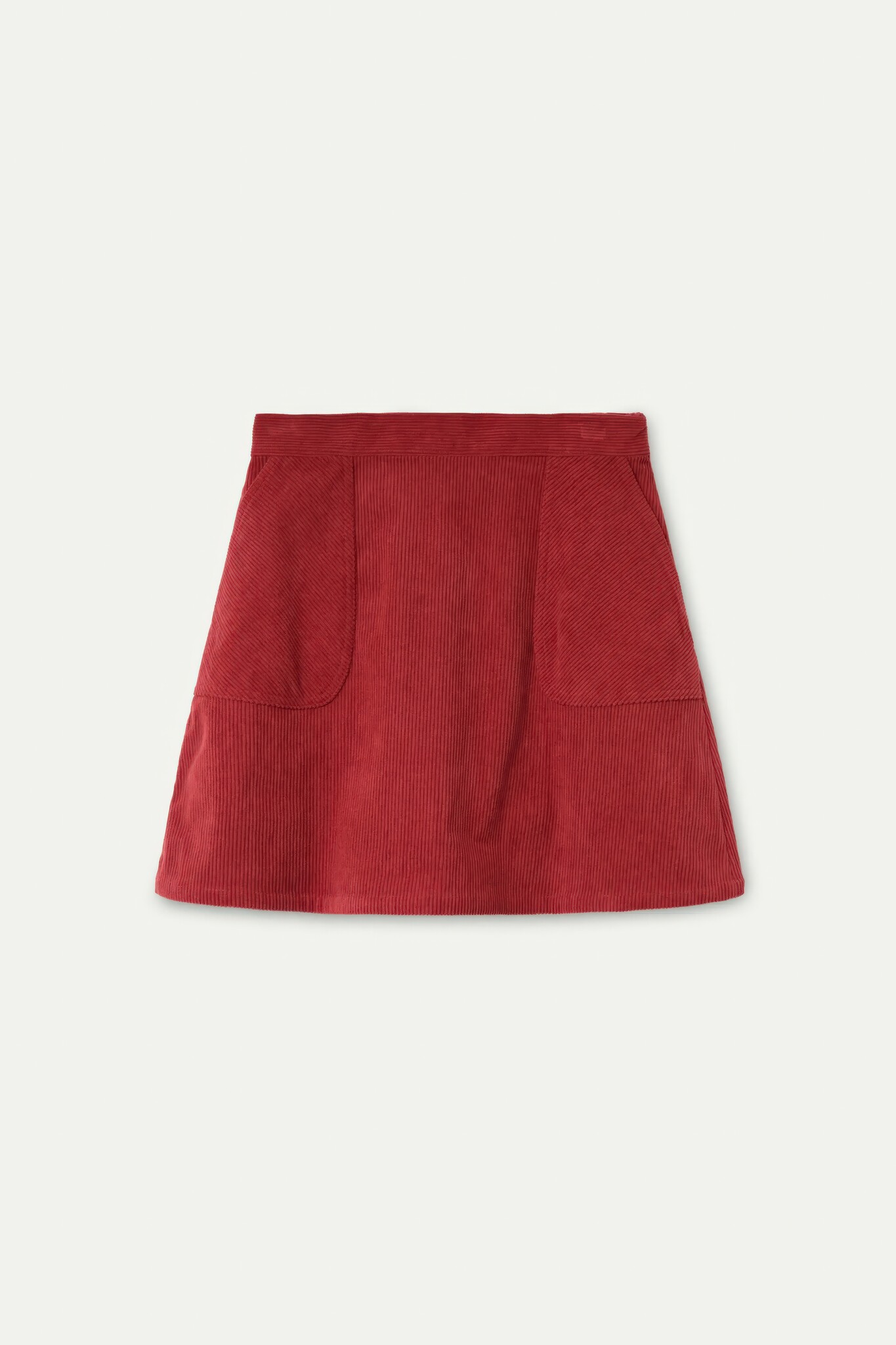 Korte corduroyrok in bruine tint met vaste tailleband, hoge taille en zijzakken.