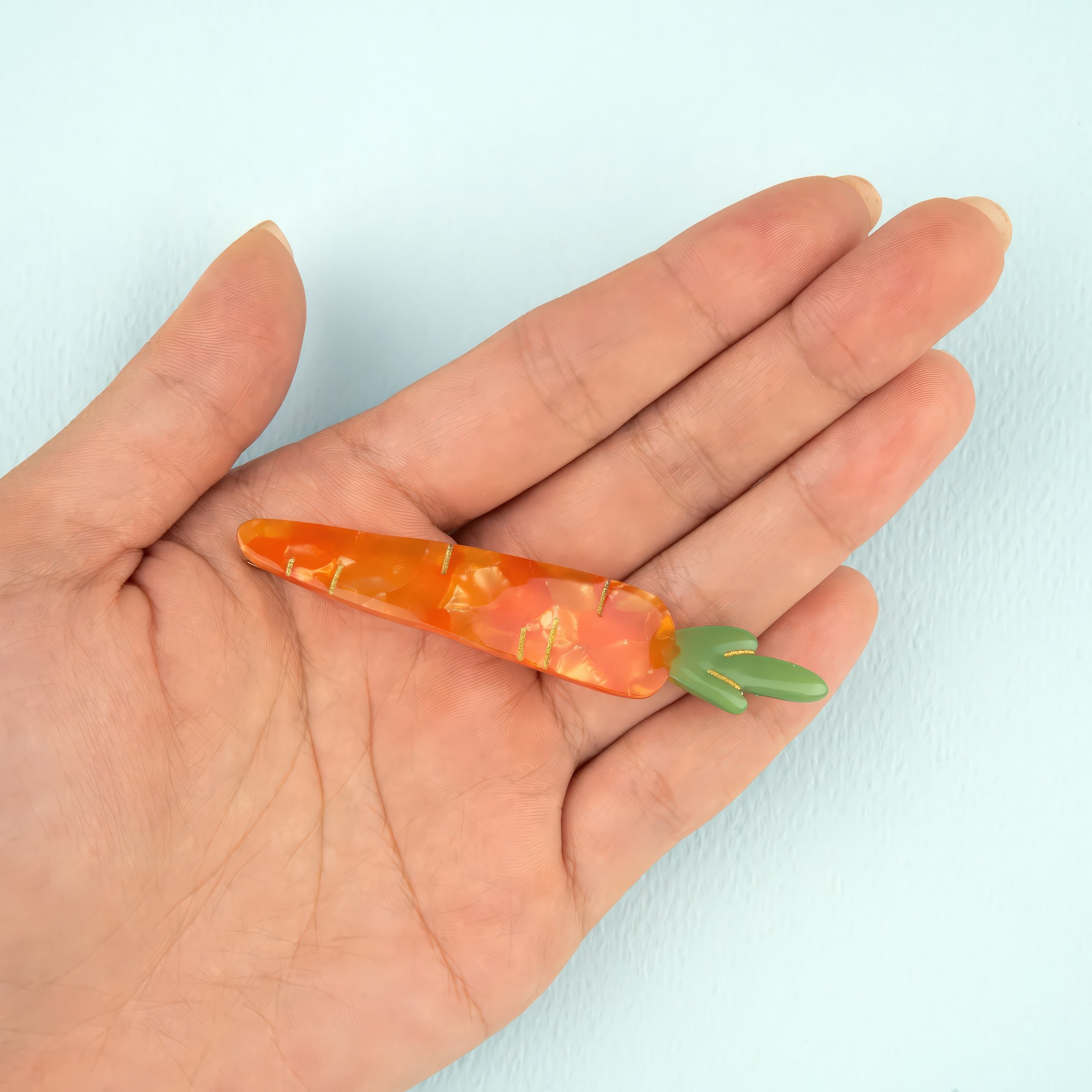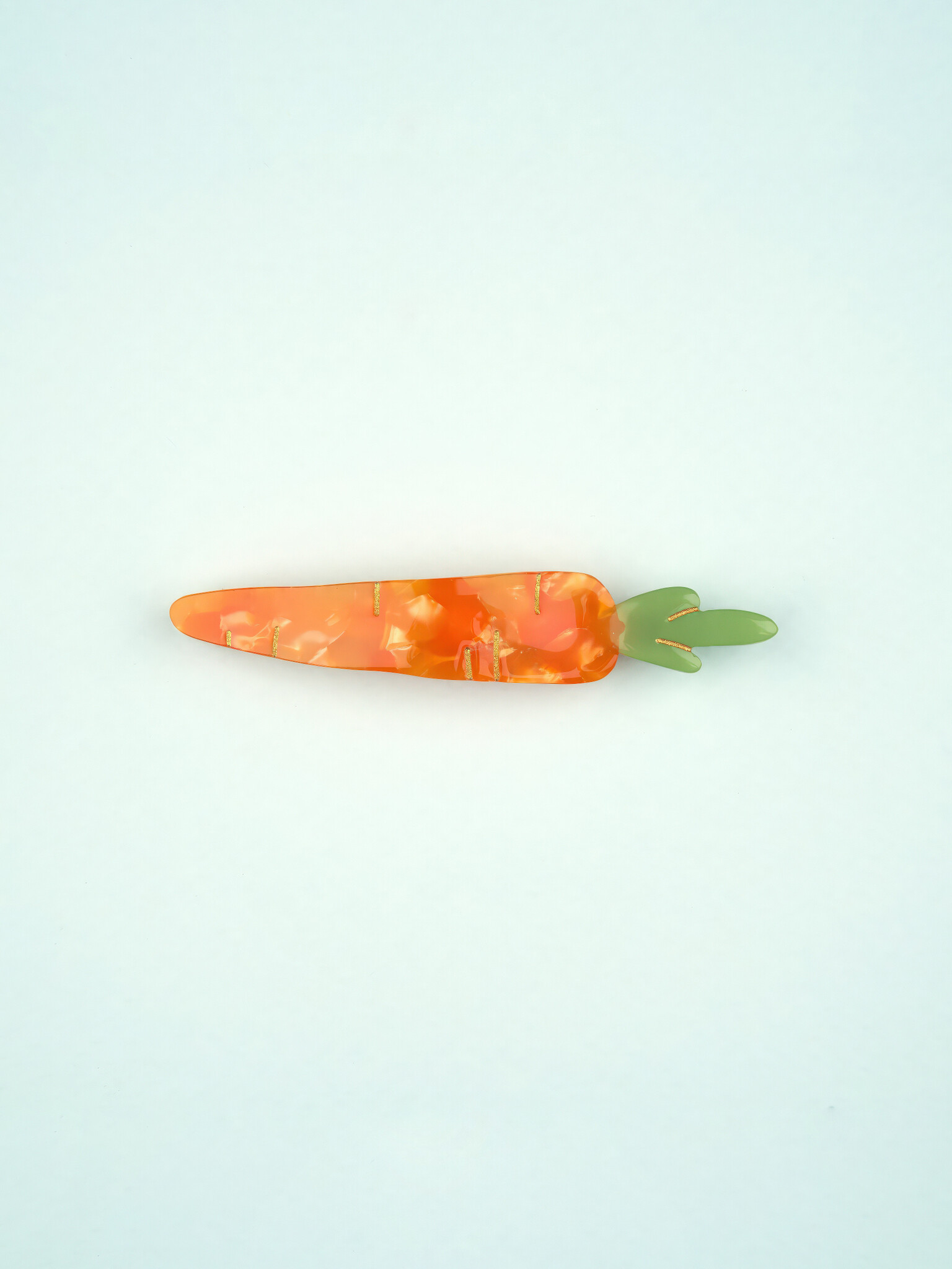Haarspeld in de vorm van een wortel, gemaakt van celluloseacetaat met metalen clip.