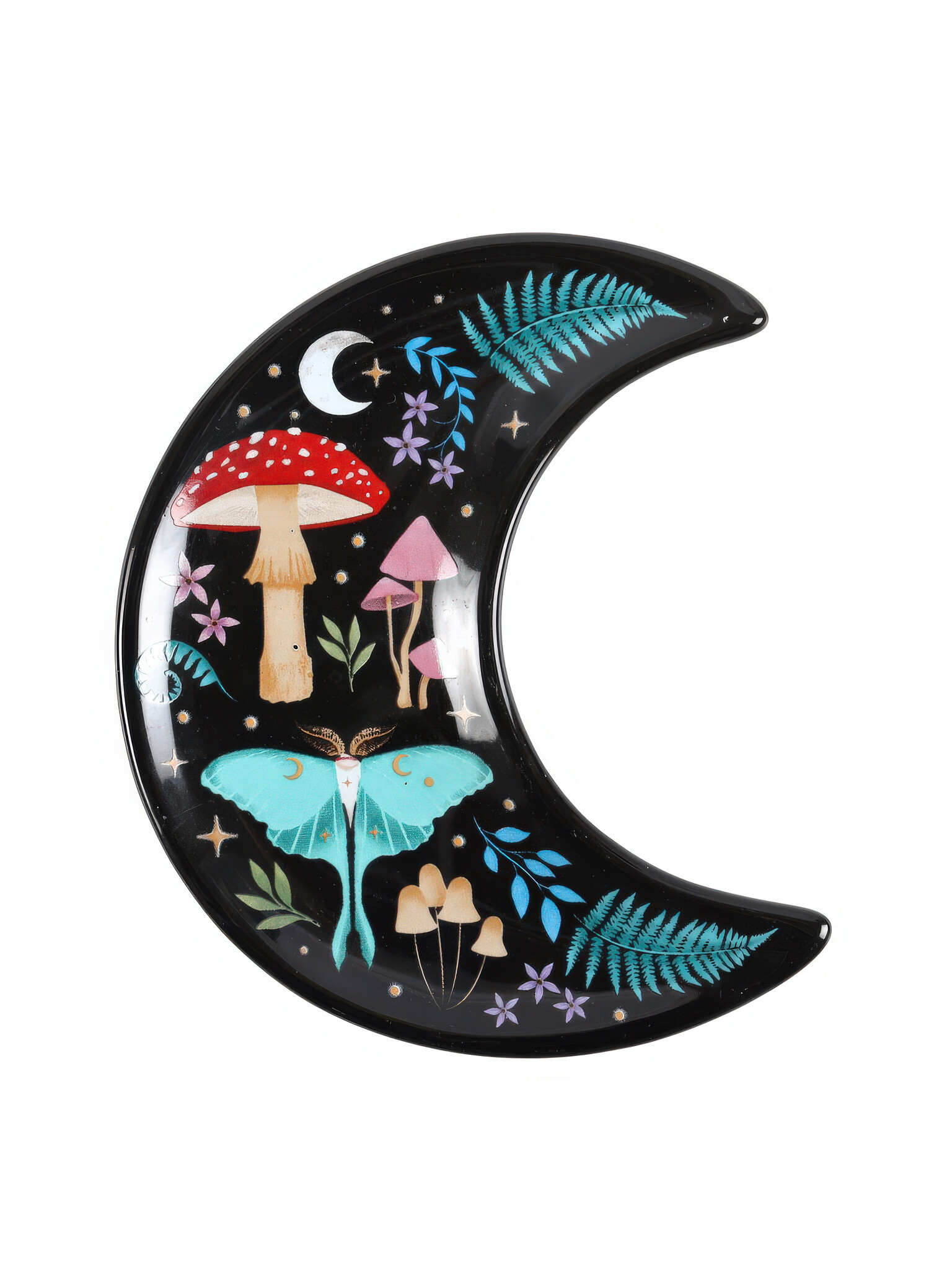 Sieradenschaaltje in maanvorm met donker woudmotief, flora en fauna en gouden sterrenaccenten. Geschikt voor kleine voorwerpen of sieraden.