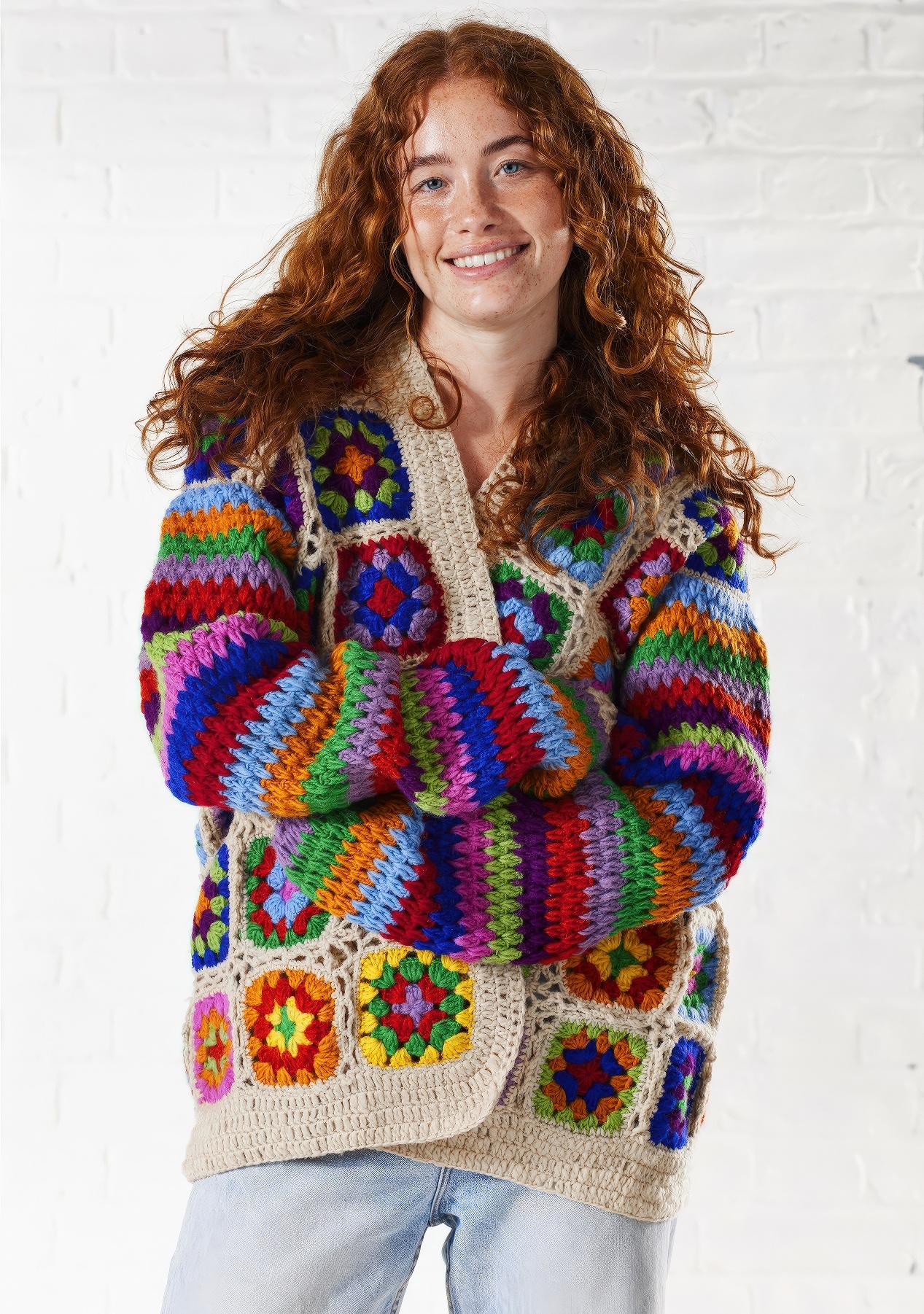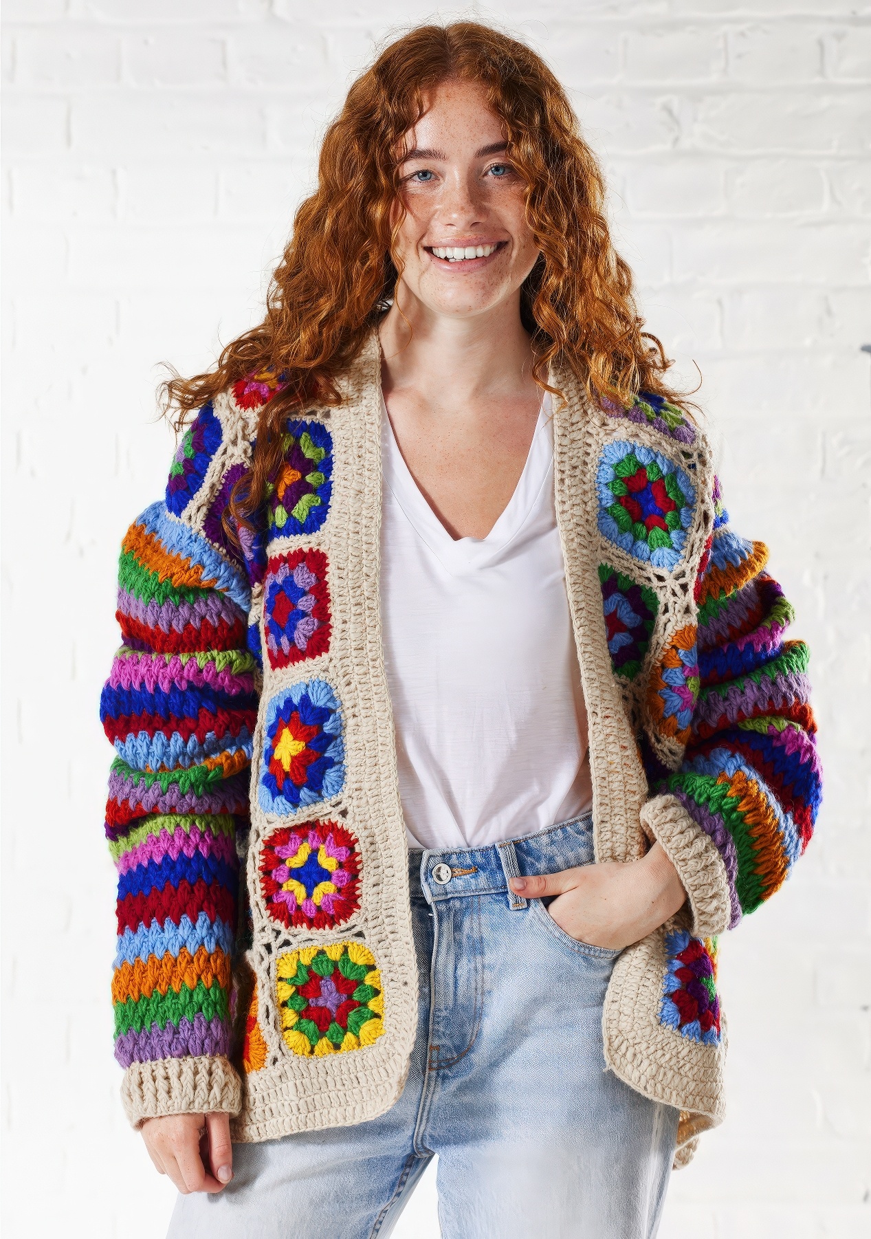 ♣ Crochet Cream Rainbow Cardigan