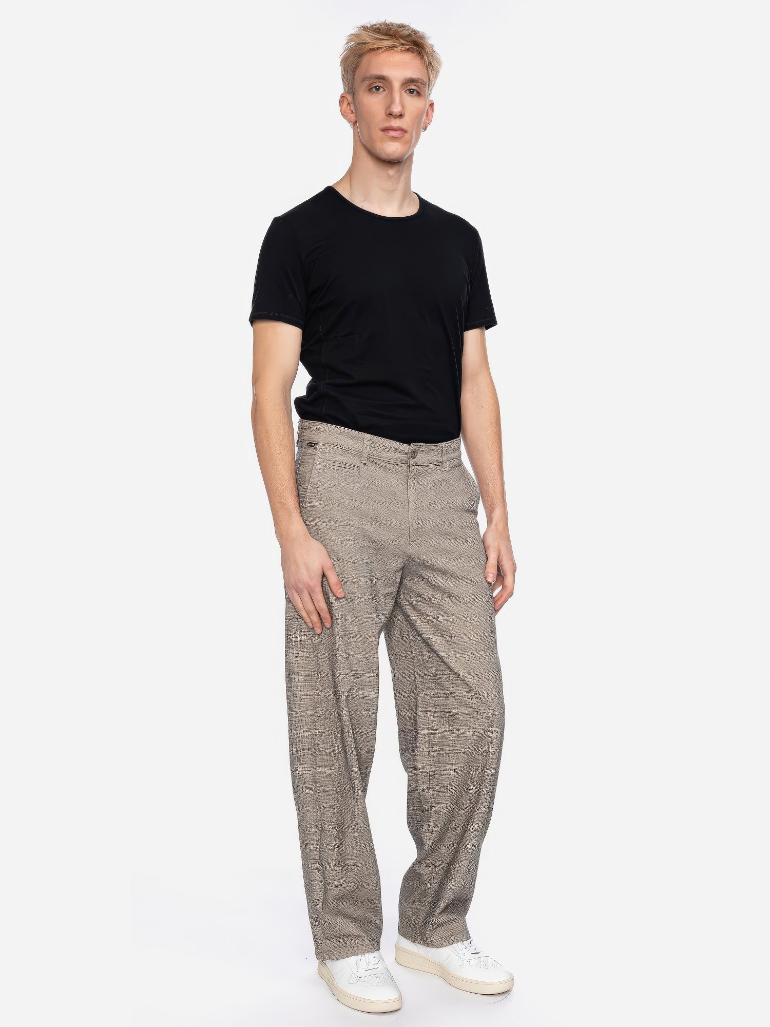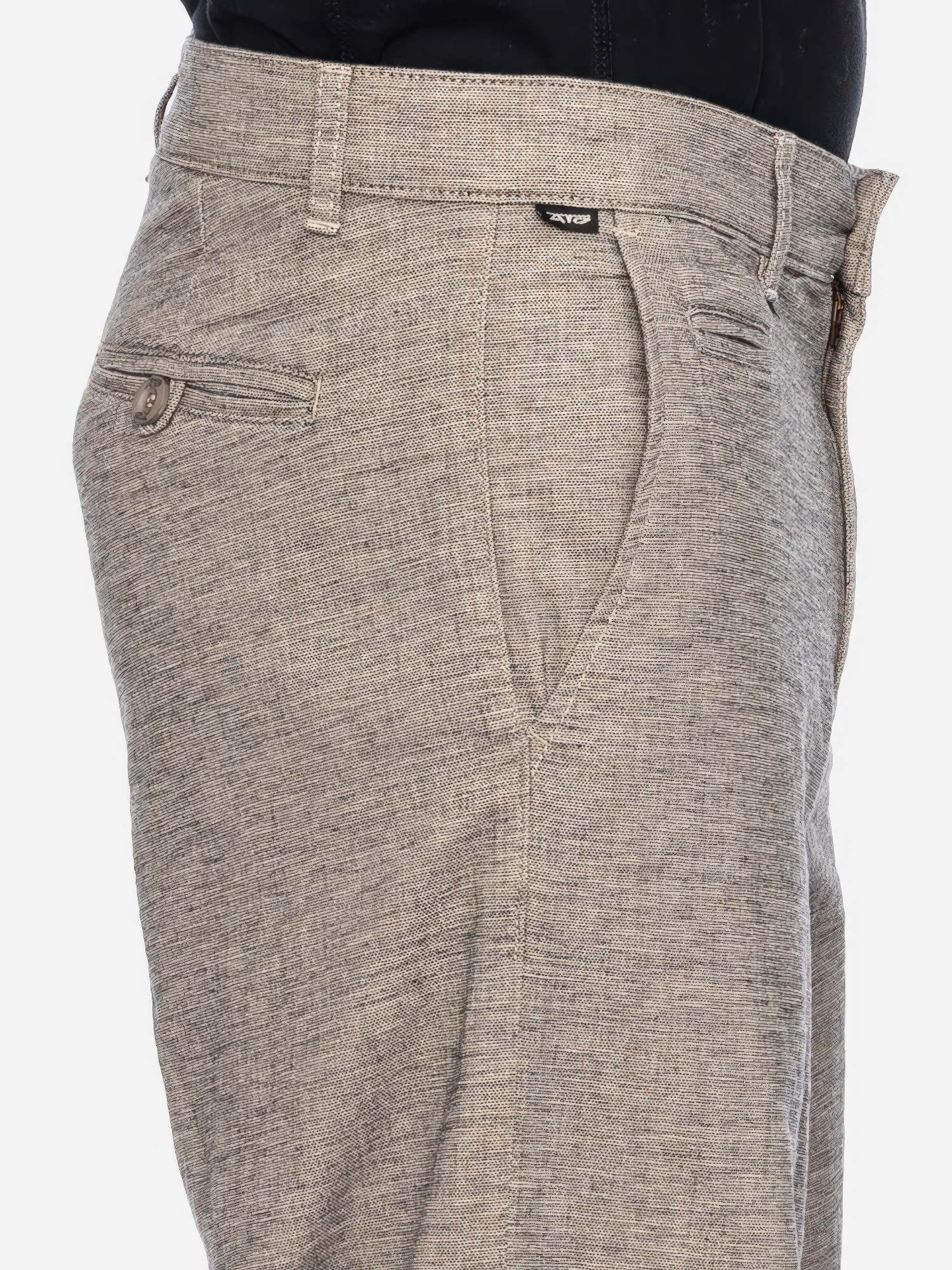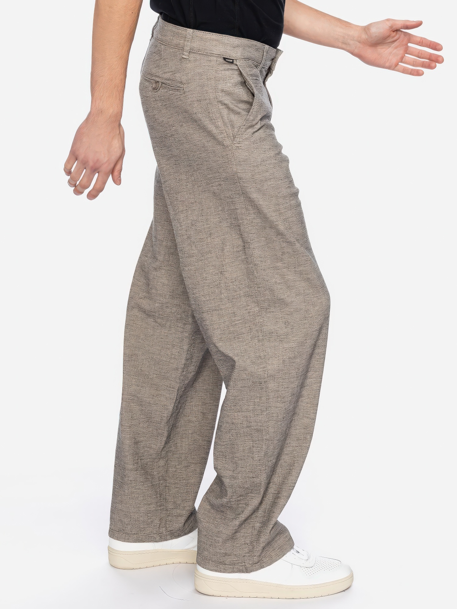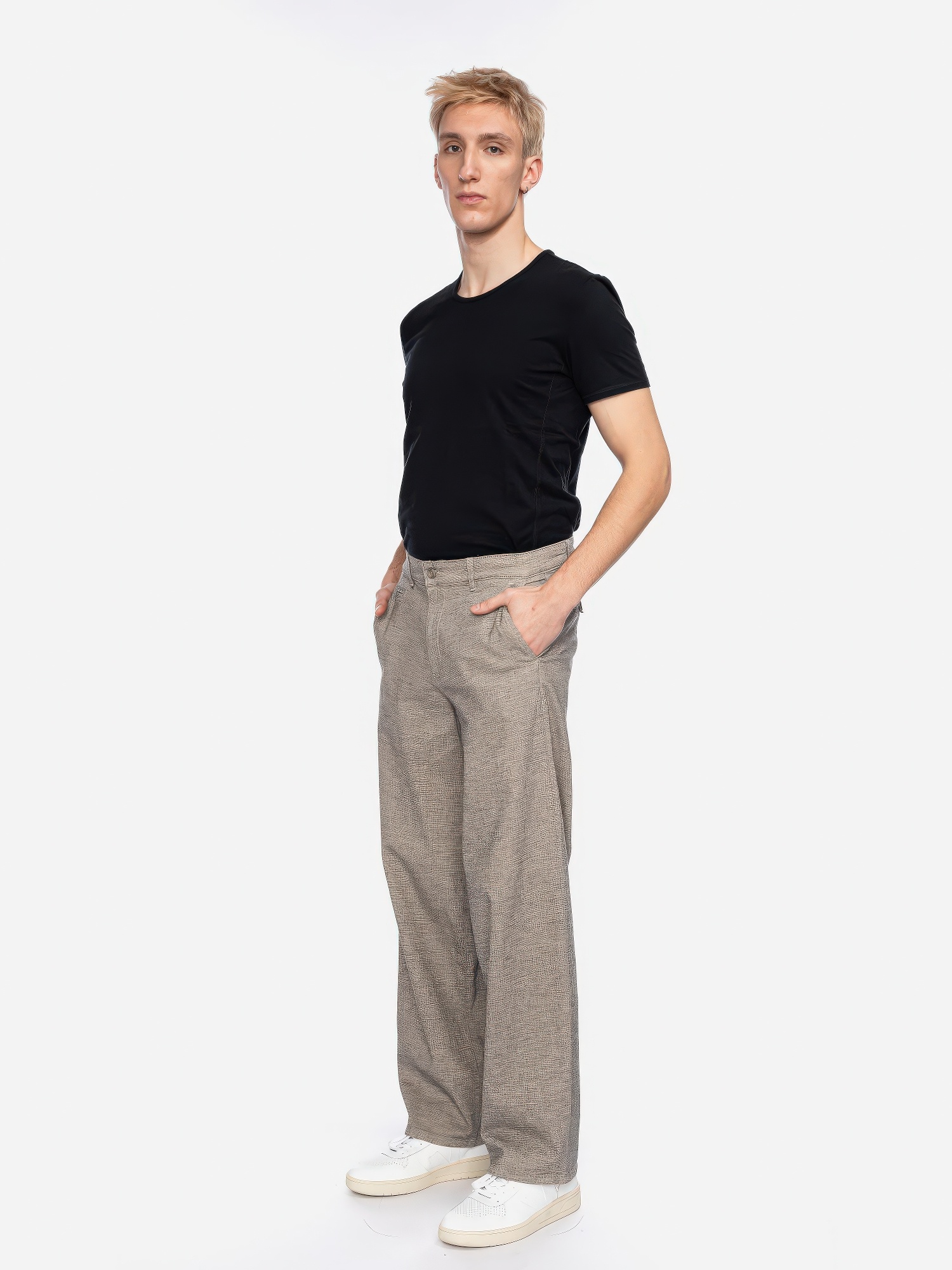 Unisex broek van katoen-linnen mix in warm grijs met een fijn gemêleerde structuur. Wide tapered leg fit met normale leibhoogte, twee zijzakken, horlogezakje en paspelzakken achter. Gemaakt in Portugal.
