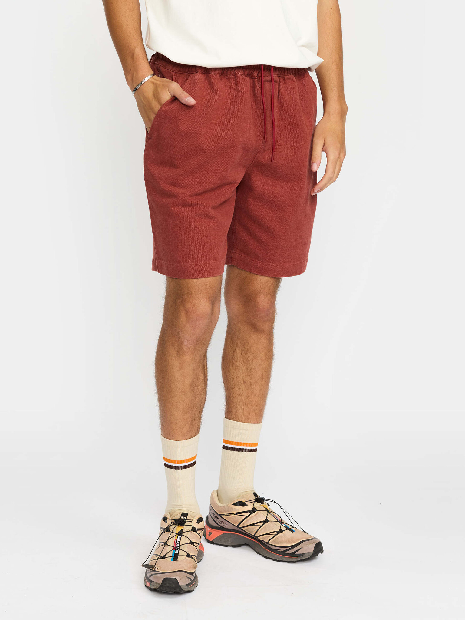 Iets langere casual shorts van biologisch katoenen twill in donkeroranje met een iets lossere pasvorm. Elastische taille met verstelbaar koord, schuine steekzakken met verborgen rits en een afgeronde achterzak.