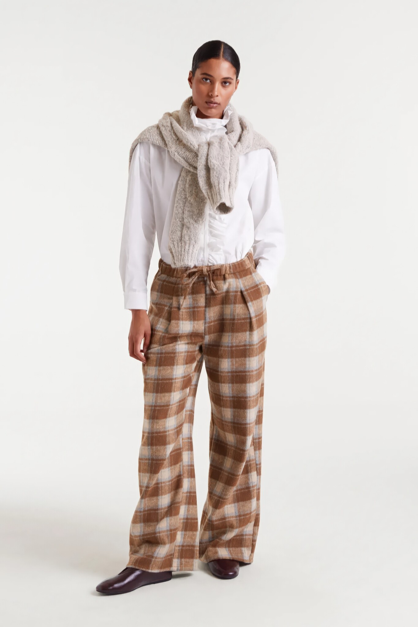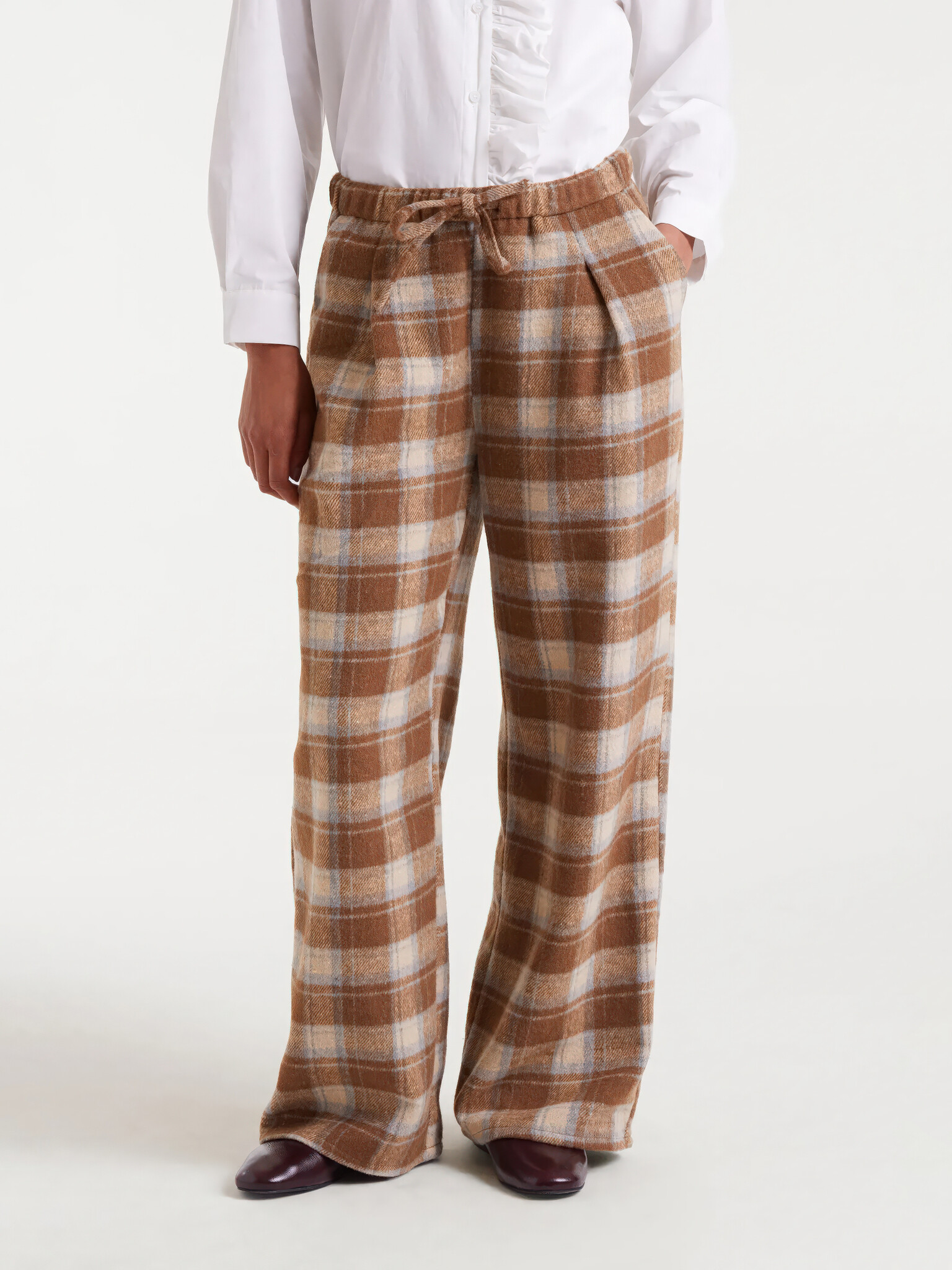Beige broek met ruitpatroon, middelhoge taille, rechte pijpen en elastische tailleband met trekkoord.