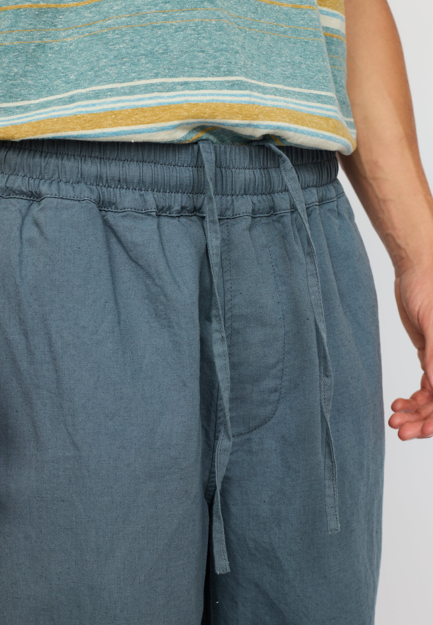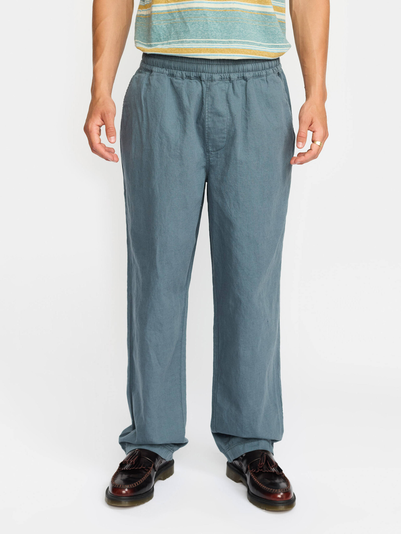 Casual linnen broek van katoen-linnen mix met licht losse pasvorm. Elastische taille met verstelbaar koord, schuine zijzakken en één achterzak met Revolution merklabel.