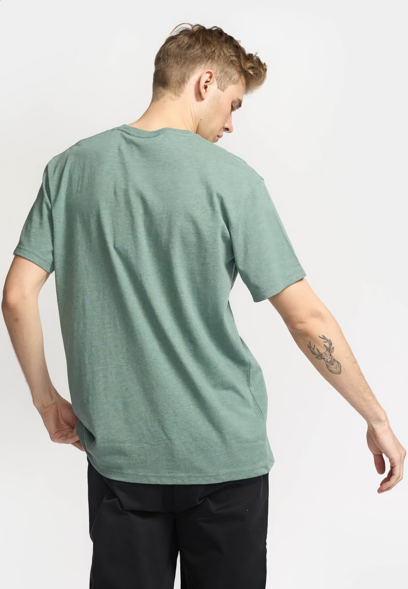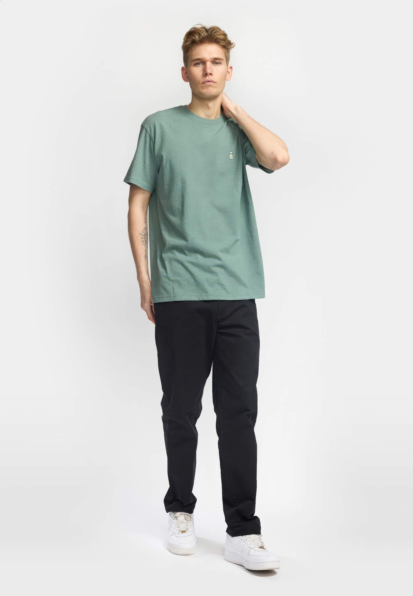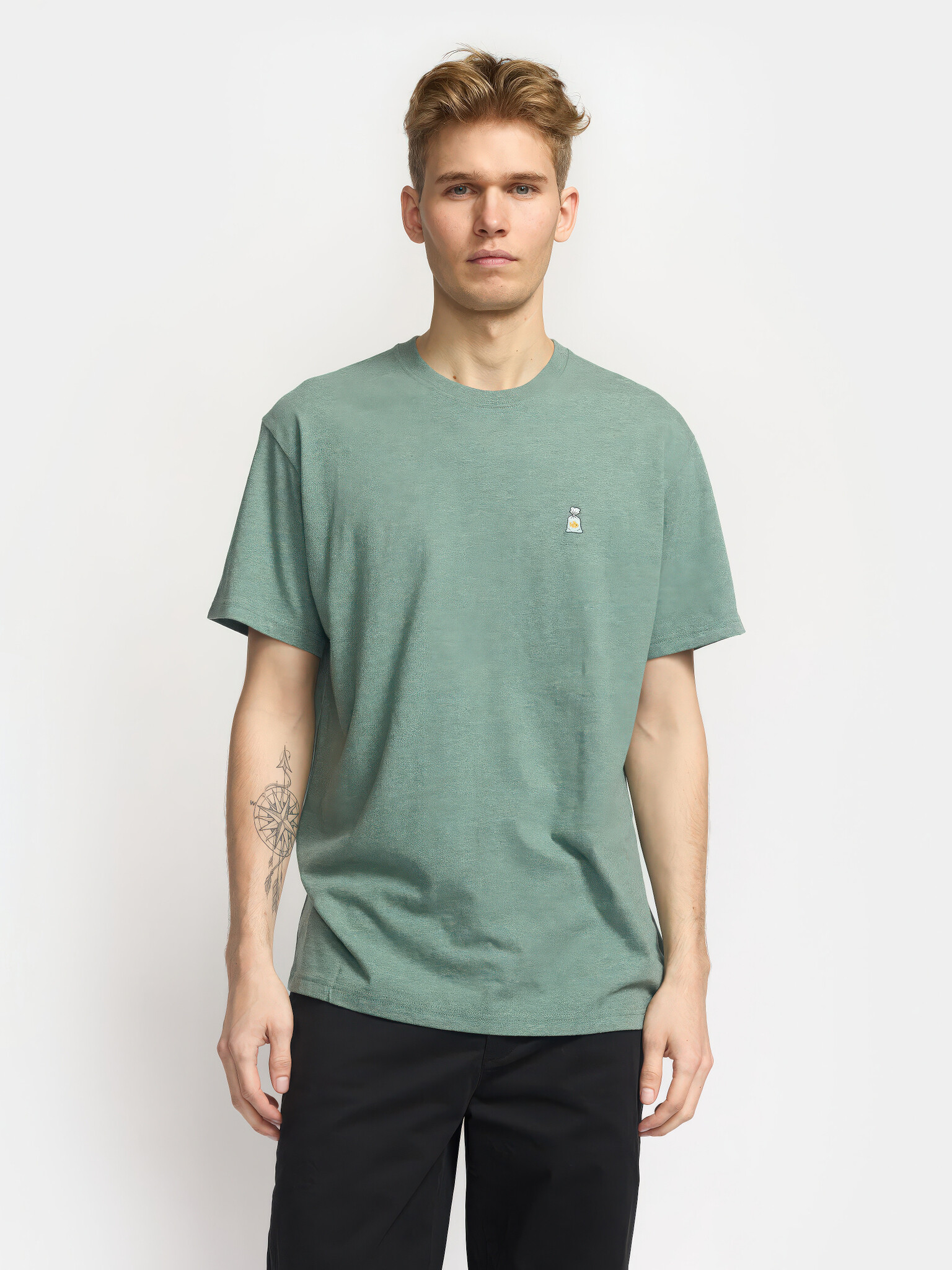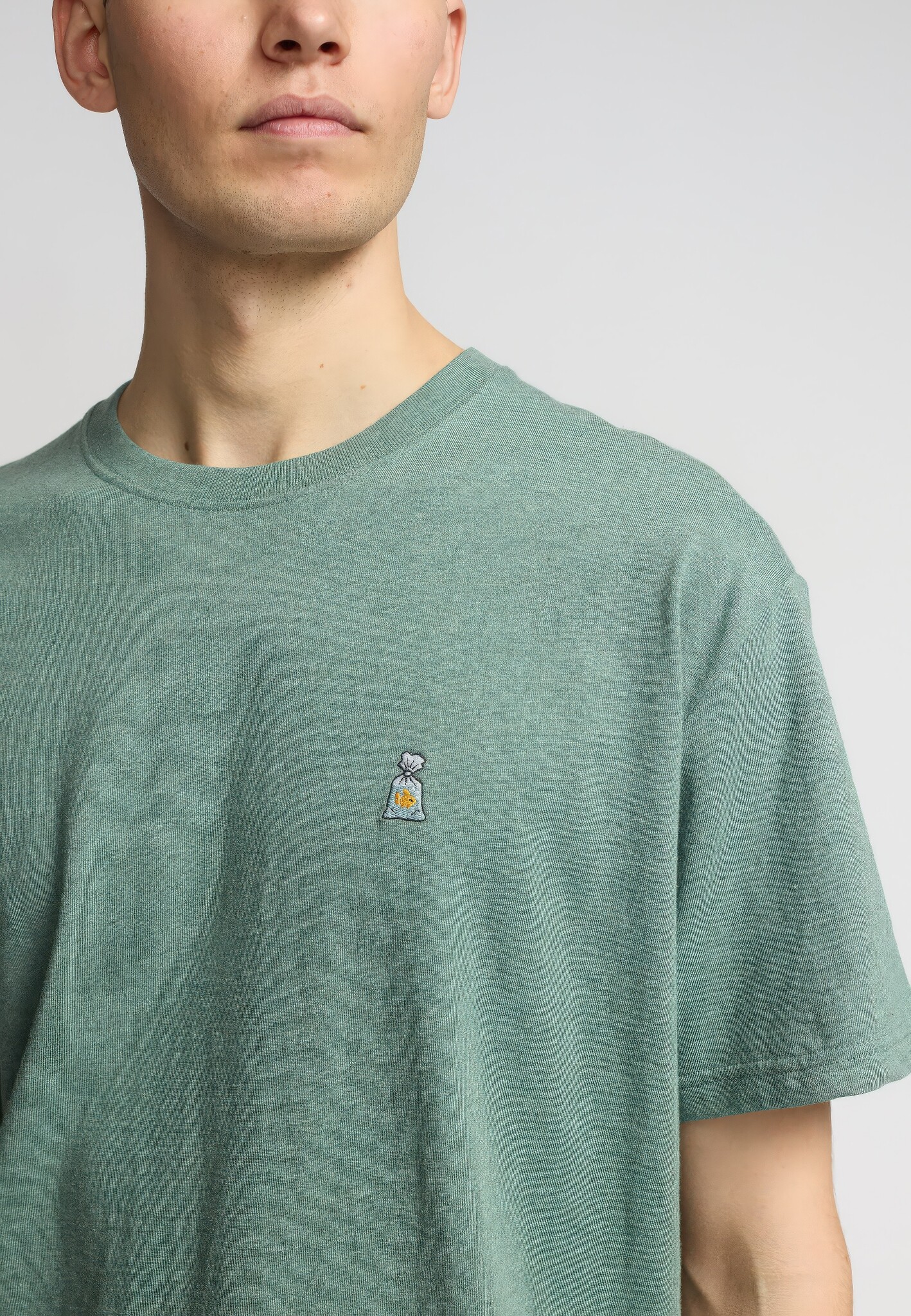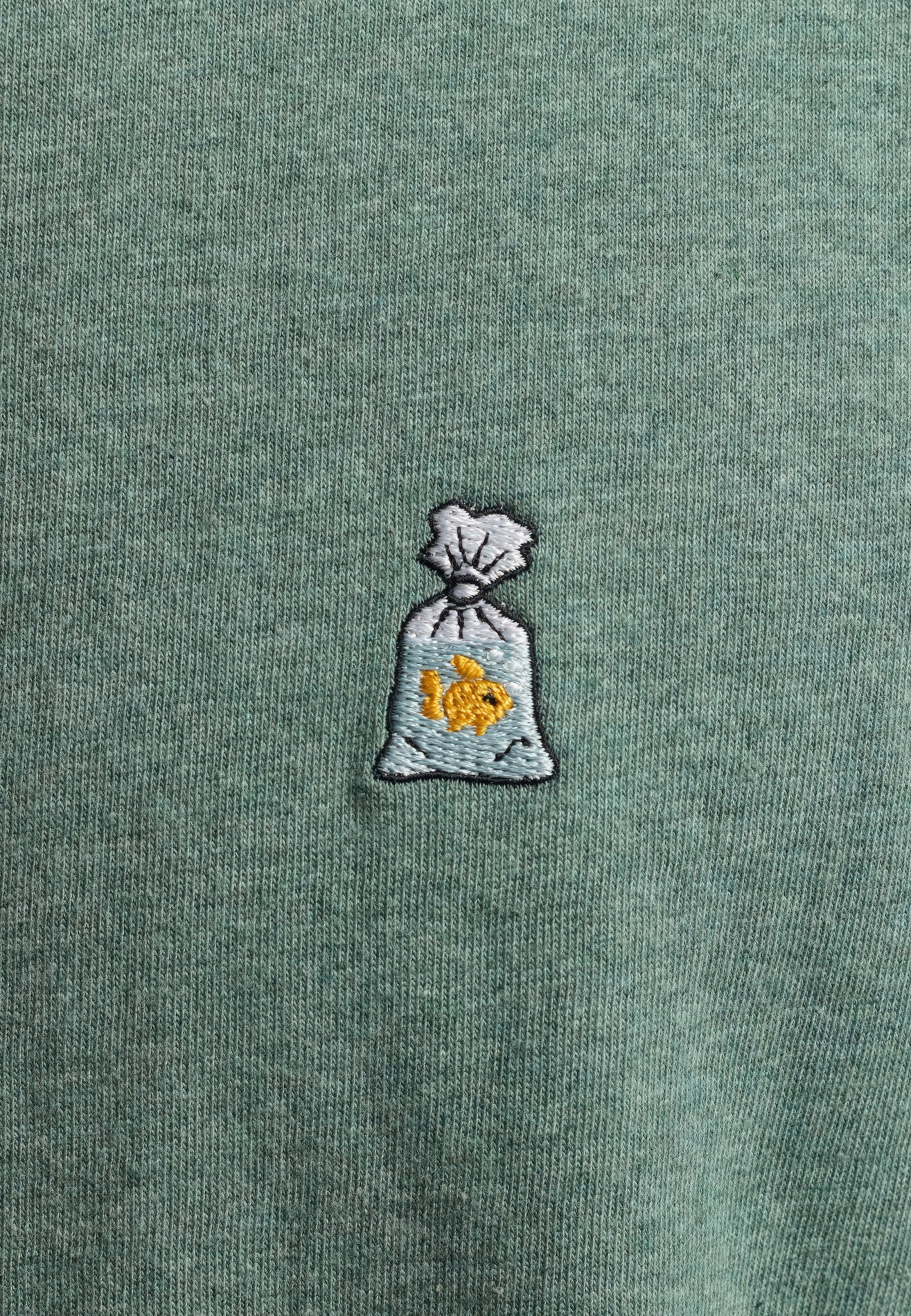 Losvallend T-shirt in lichtgroen biologisch katoen met ronde hals, ribkraag en goudvis-in-zakje borduursel op de borst