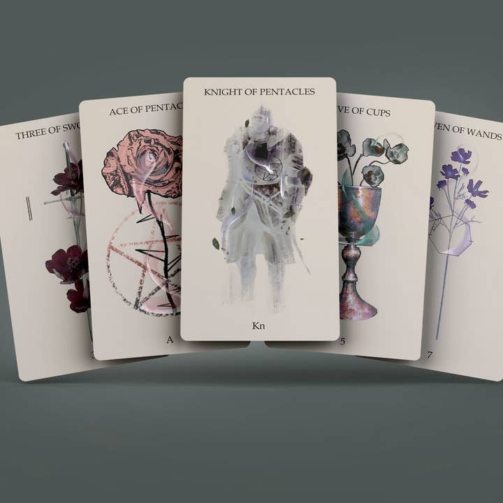 Elke kaart in dit deck is een reis, van de delicate fluisteringen van het ene scenario tot de intense verhalen die schreeuwen uit het volgende. De kunststijl, met gedempte en transparante effecten, creëert een spookachtige ambiance met een rijk, mysterieus verleden. Ontdek het onverwachte terwijl enkele kleine arcana-kaarten een verhaal weven waarin de natuur harmonieert met wiskunde - bloemen overlappen met delicate, geometrische vormen.