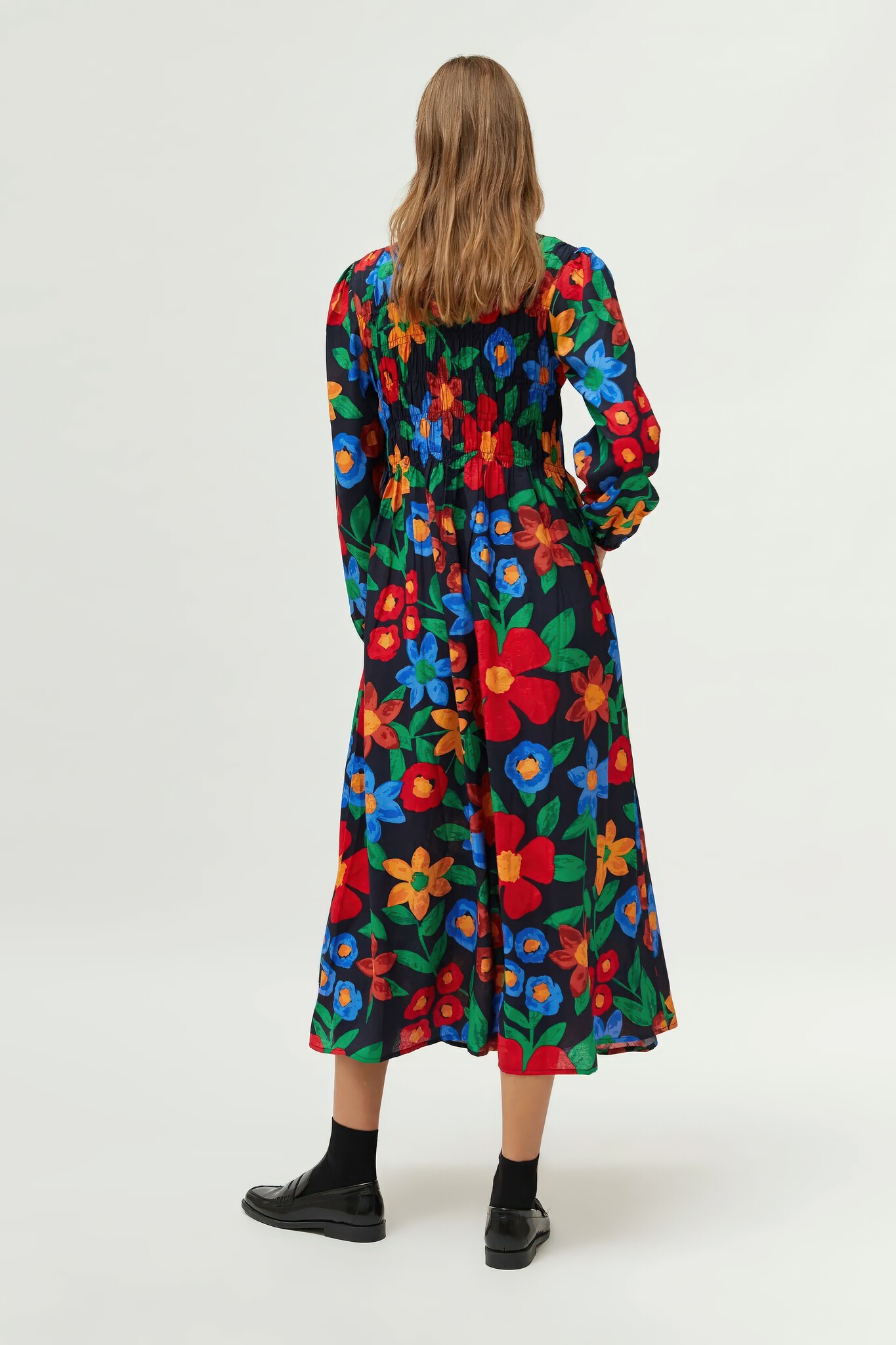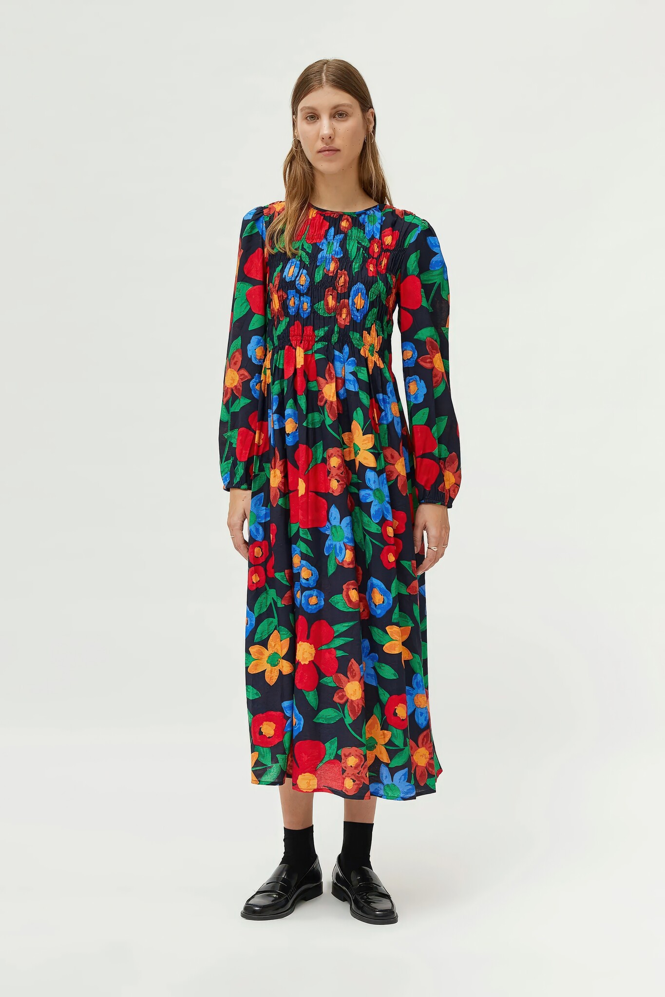 Lange jurk van viscose crêpe met een meerkleurige bloemenprint. Voorzien van een ronde hals, lange mouwen, een elastisch lijfje en een uitsnijdetail in de taille.