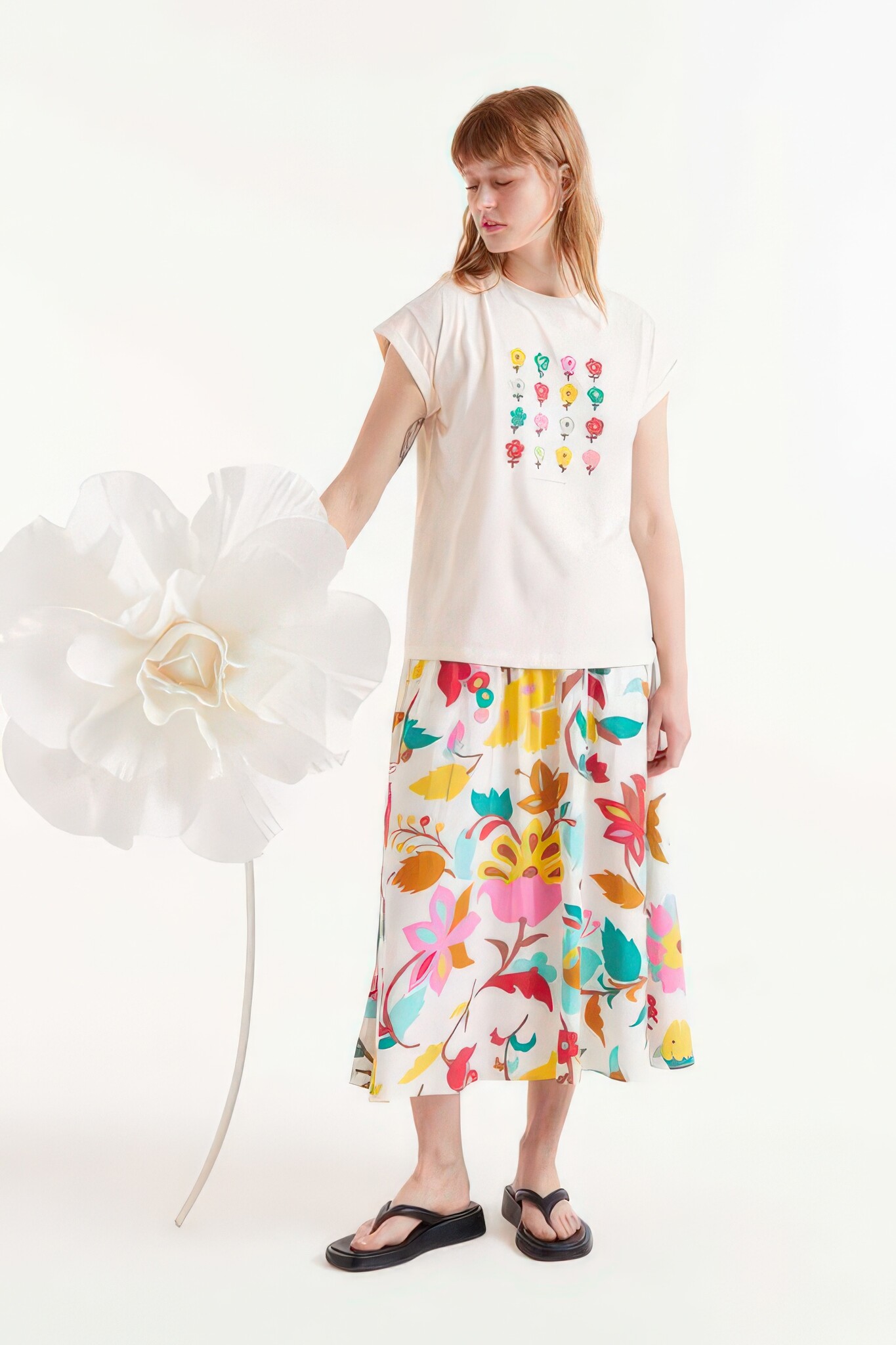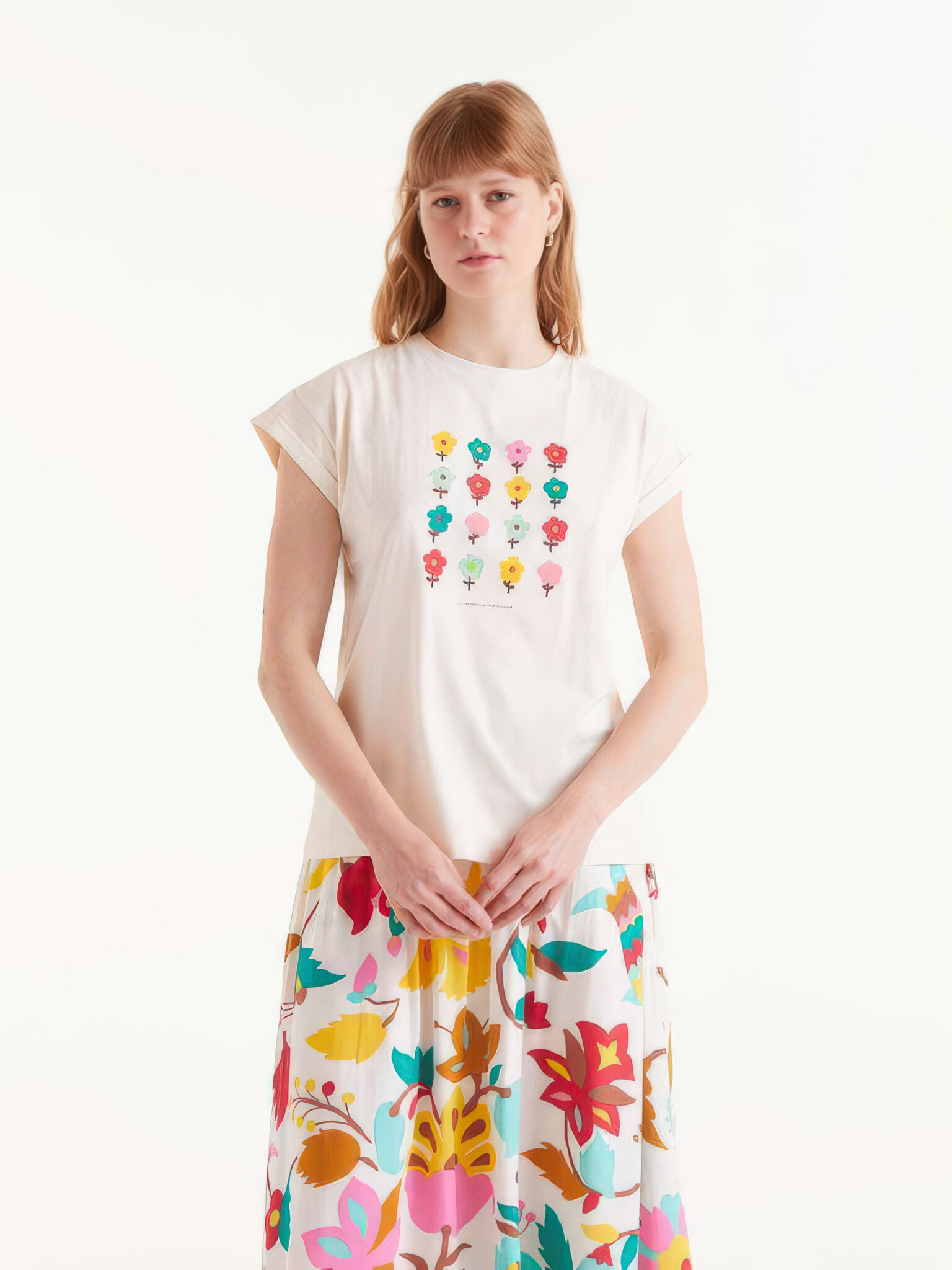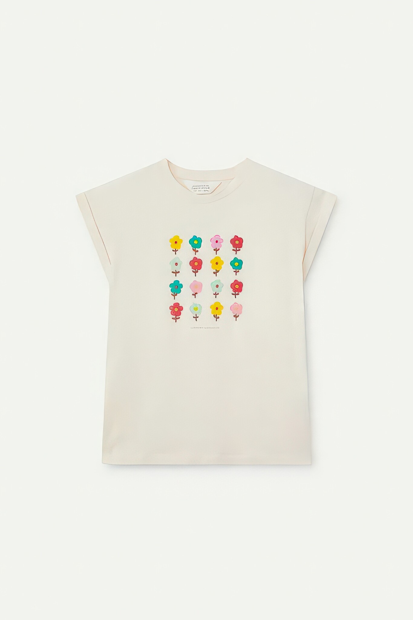 Witte T-shirt van tricot met bloemenprint. Voorzien van ronde hals en korte mouwen met omslag.