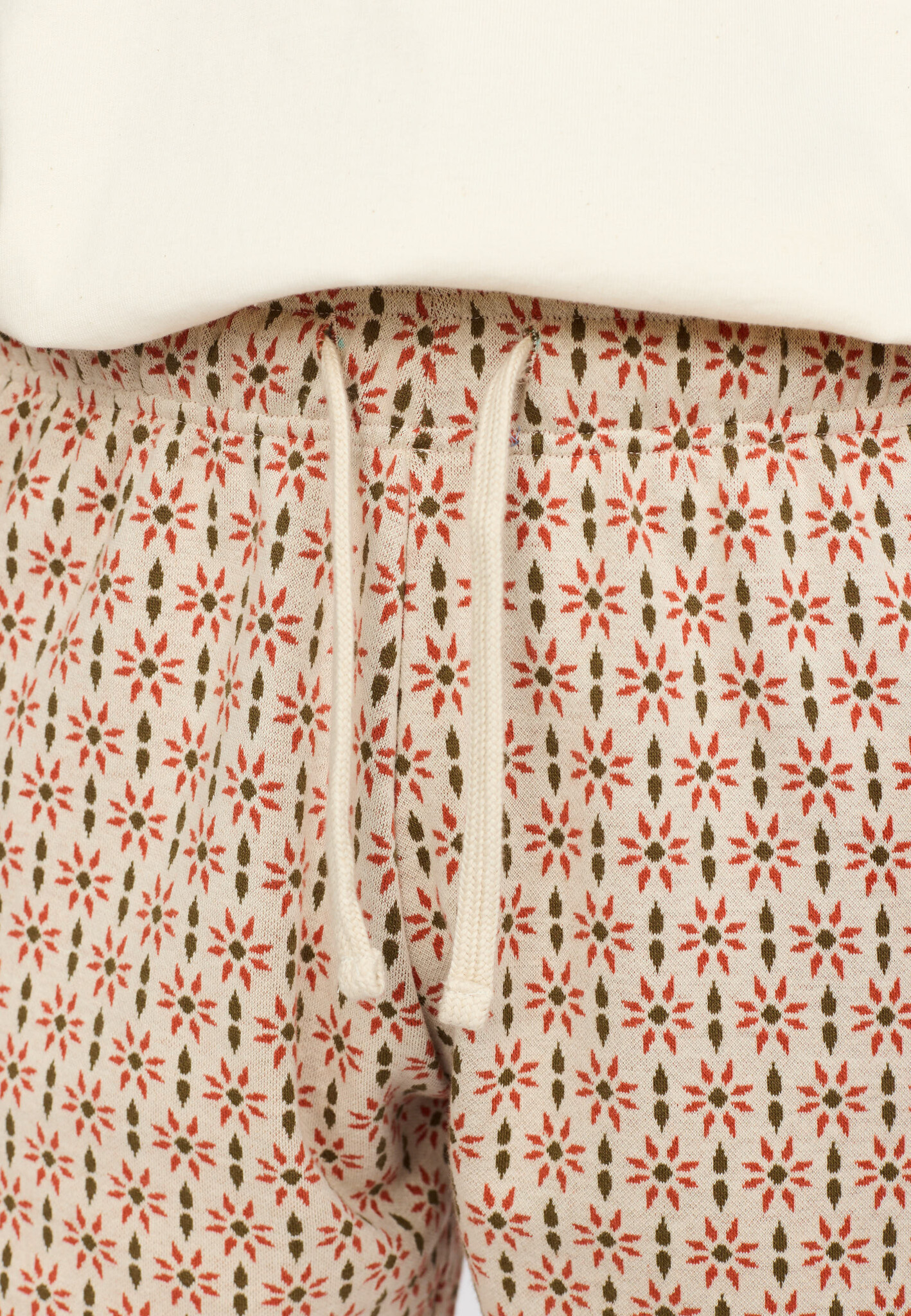 Shorts van zacht en stretchend biologisch katoenen jersey met een klein grafisch jacquard bloemmotief in vintage stijl. Elastische taille met verstelbaar koord en twee schuine steekzakken.