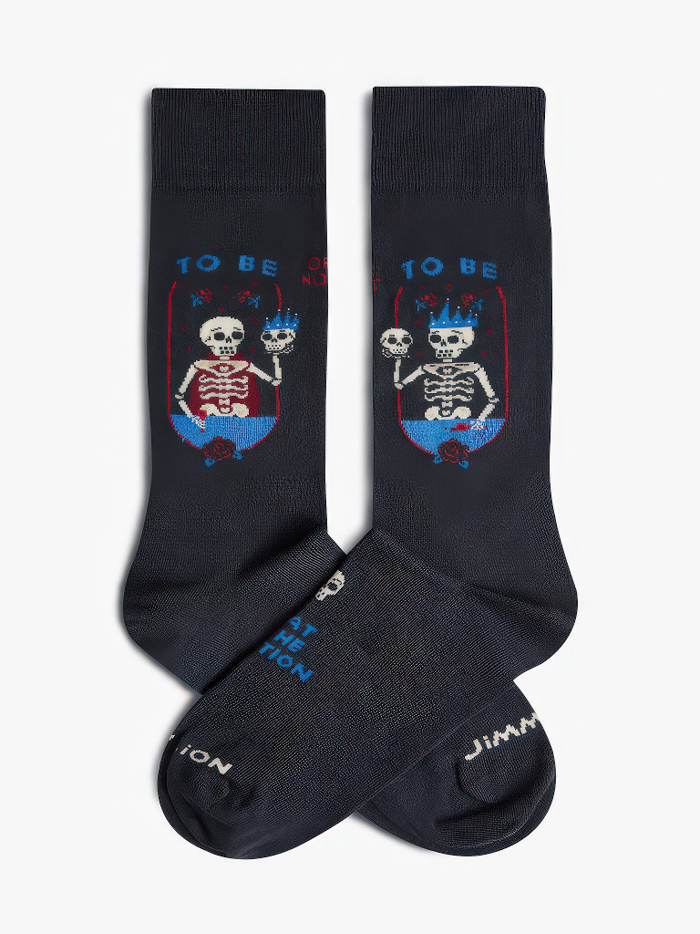 The Library Sokken geïnspireerd op Shakespeare's Hamlet. Deze uniseks sokken hebben de beroemde zin "To be or not to be" en een skeletversie van prins Hamlet op een zwarte achtergrond.