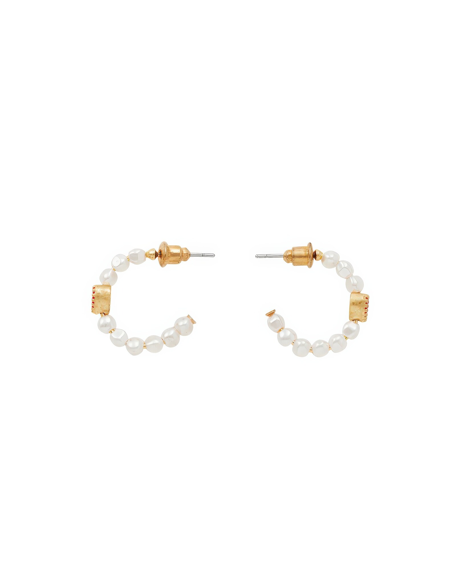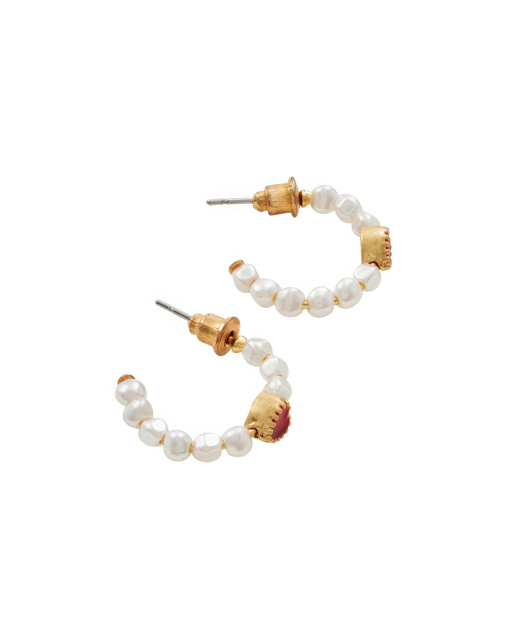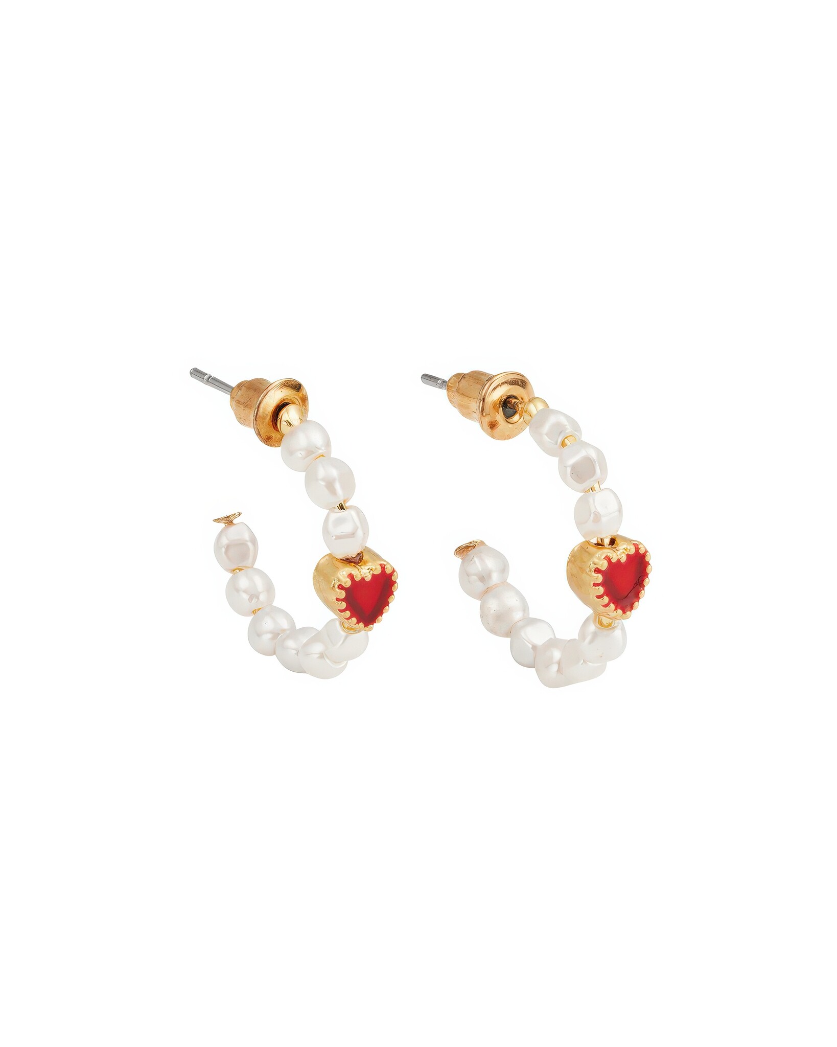 Gouden hoops van 22-karaats verguld messing met faux parels en een rood email hartje. Post-back sluiting.