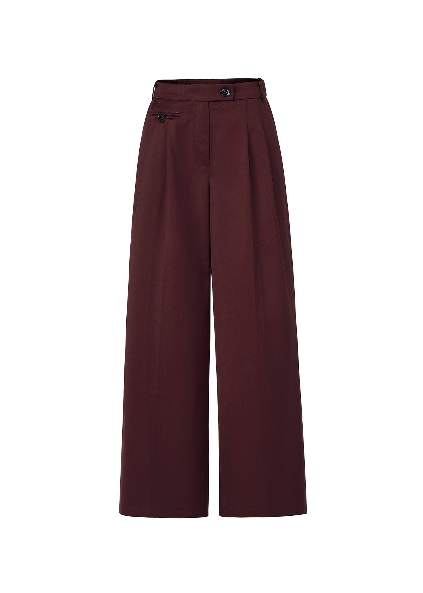 Bordeauxrode pantalon met lange pijpen, voorsluiting met knoop, rits en haaksluiting.