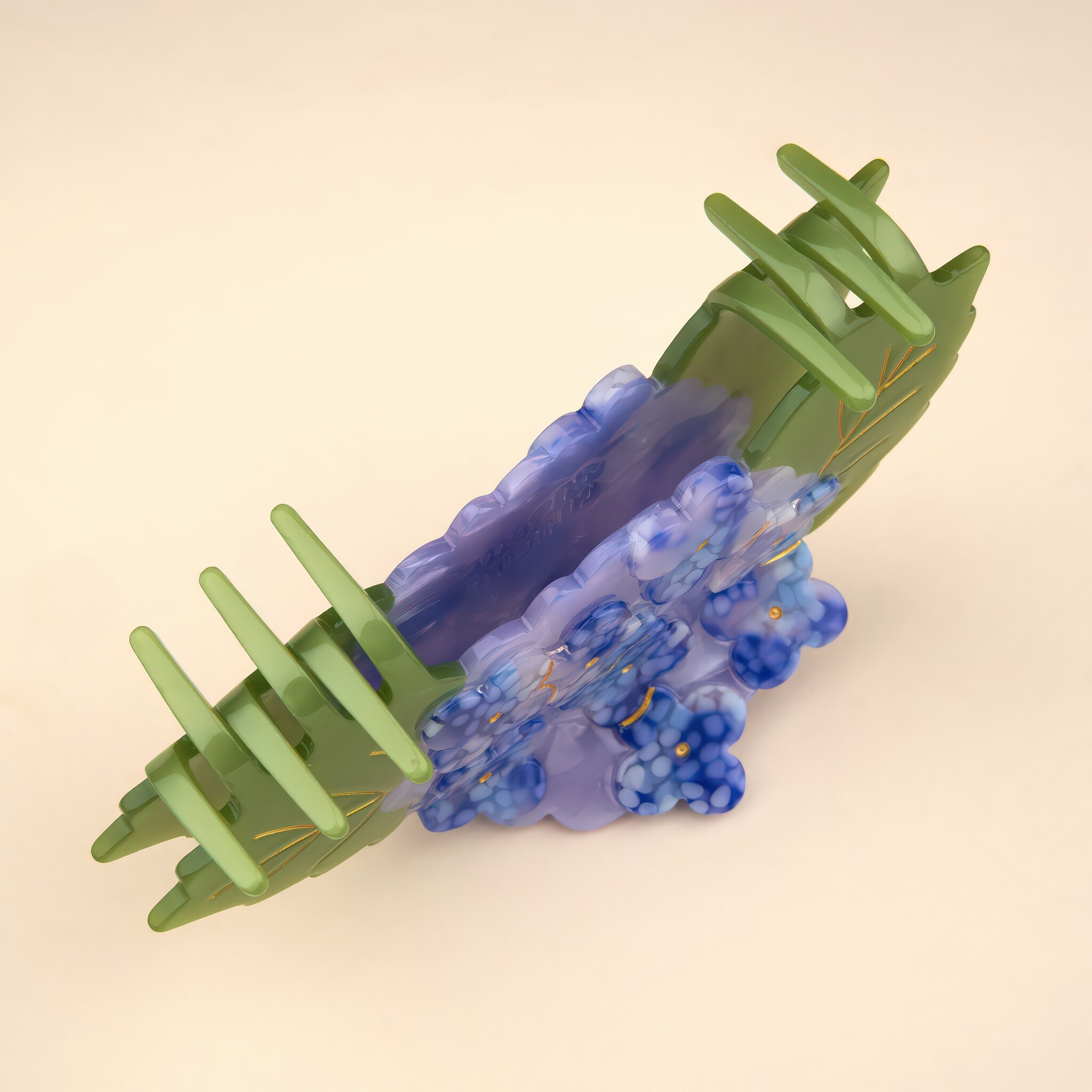 XL haarclip in de vorm van een hortensia met bloembladen in blauw en lila, gemaakt van celluloseacetaat.