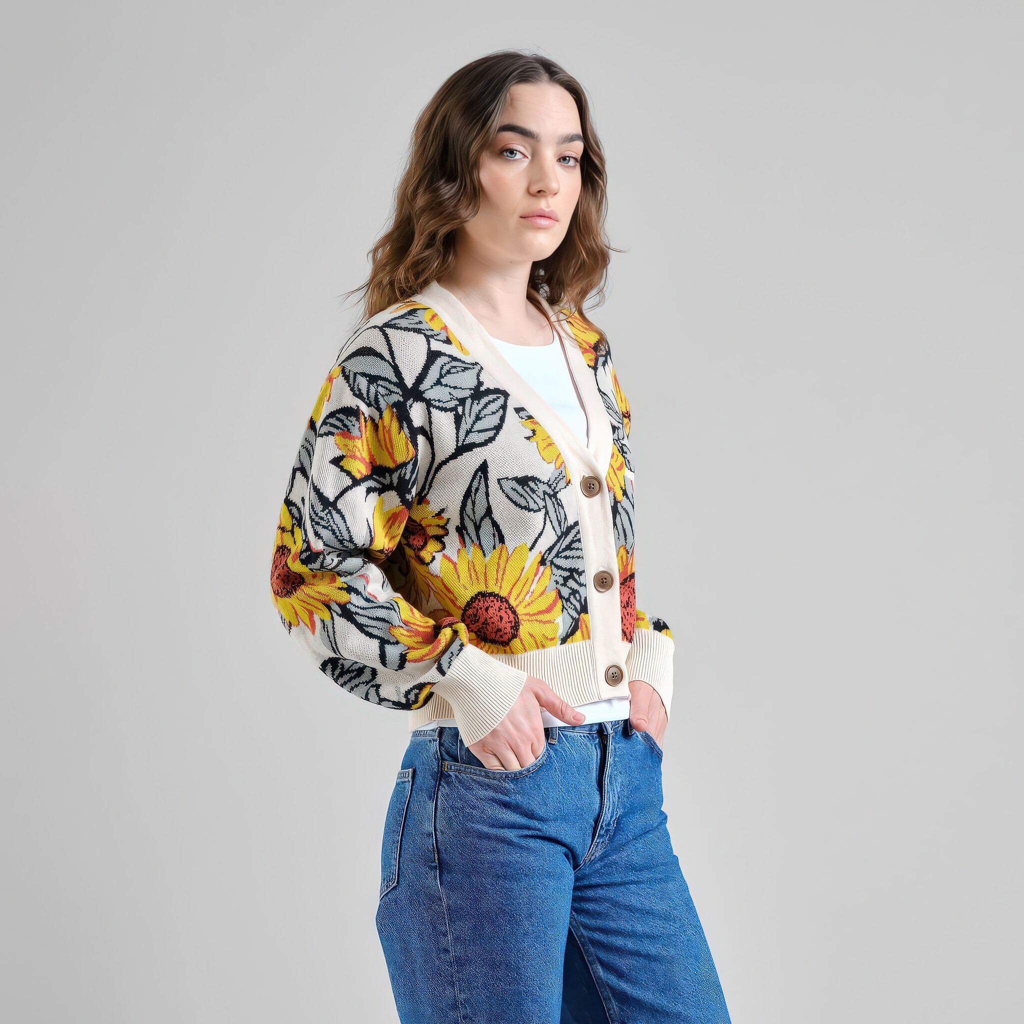 Relaxed jacquard gebreide cardigan in vanilla white met een all-over zonnebloemenpatroon in geel en groen. Diepe V-hals, grote corozo knopen en geribbelde manchetten en zoom. Licht gecropte lengte tot boven de heup.
