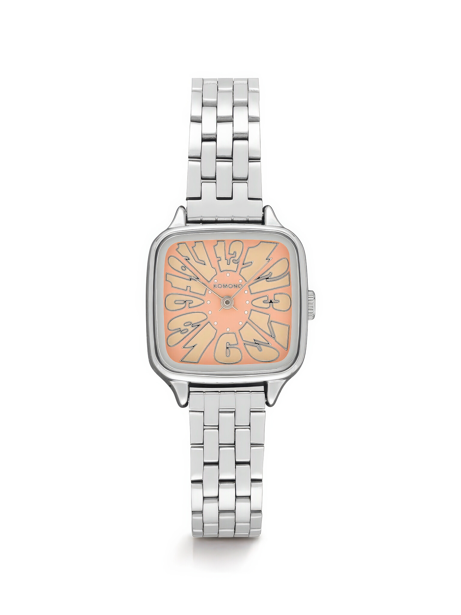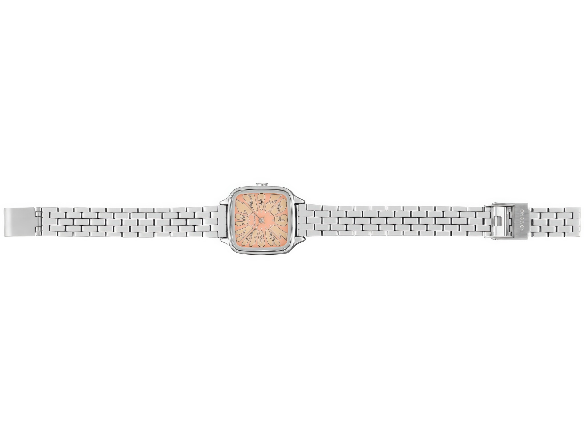 Horloge met roestvrijstalen schakelband, zilver met blushkleurige wijzerplaat met grafische overlay. Japans quartz uurwerk en mineraalglas.