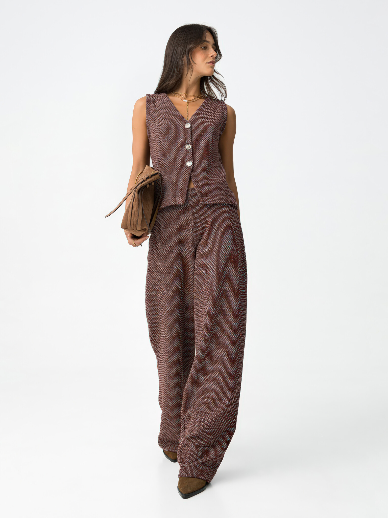 Wijde broek in chocoladebruin met subtiel patroon en ontspannen, stijlvolle pasvorm.